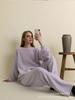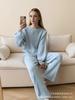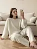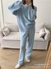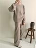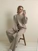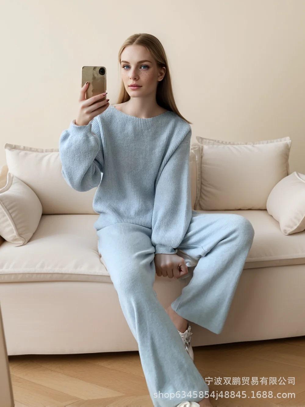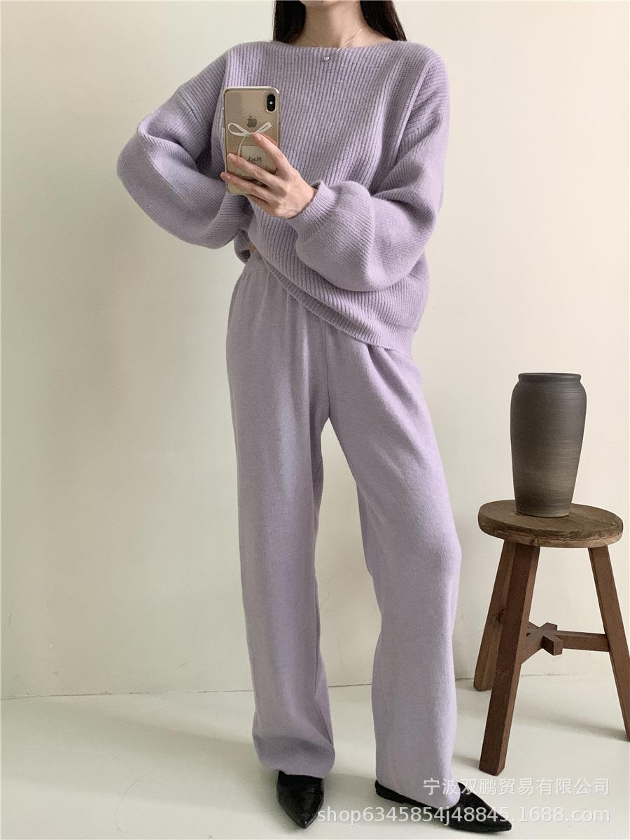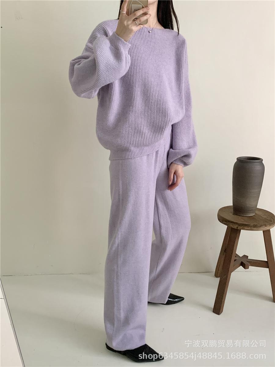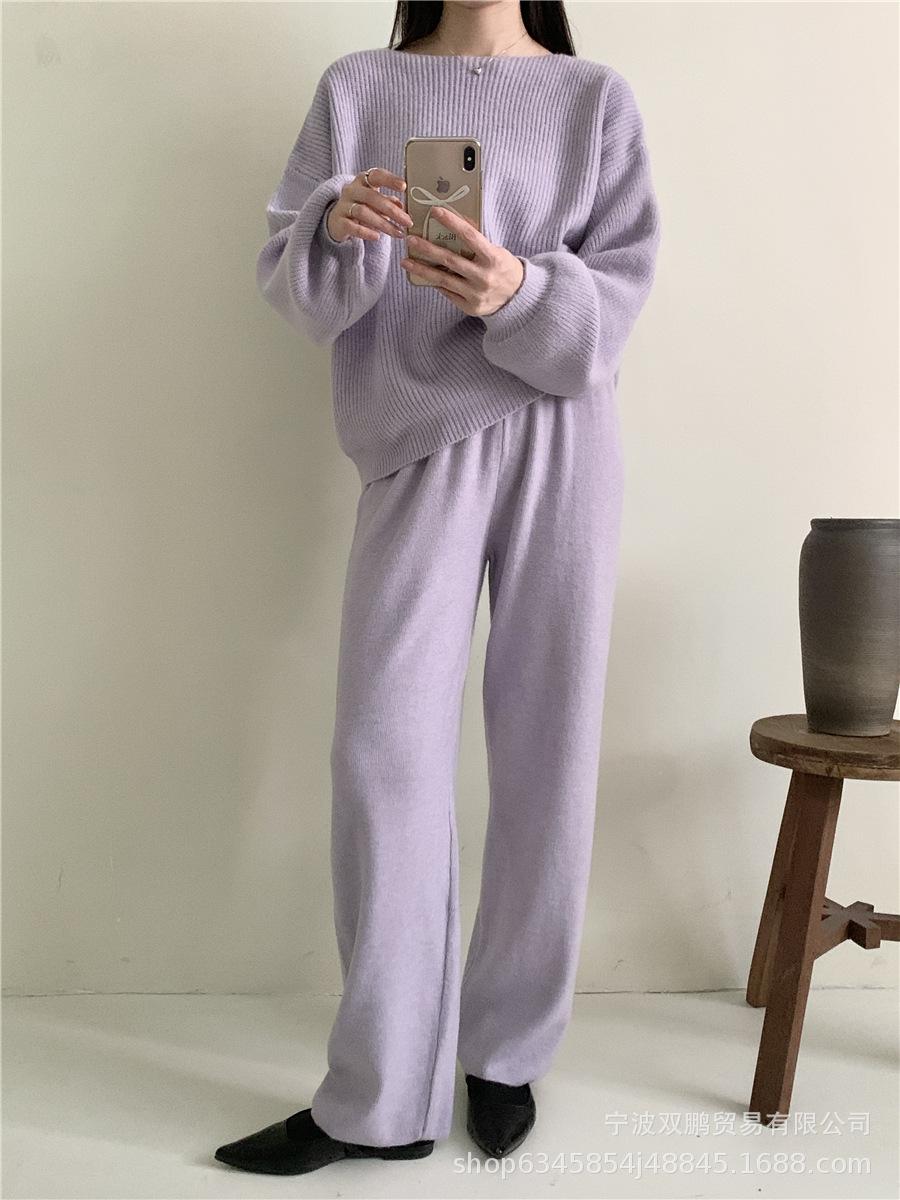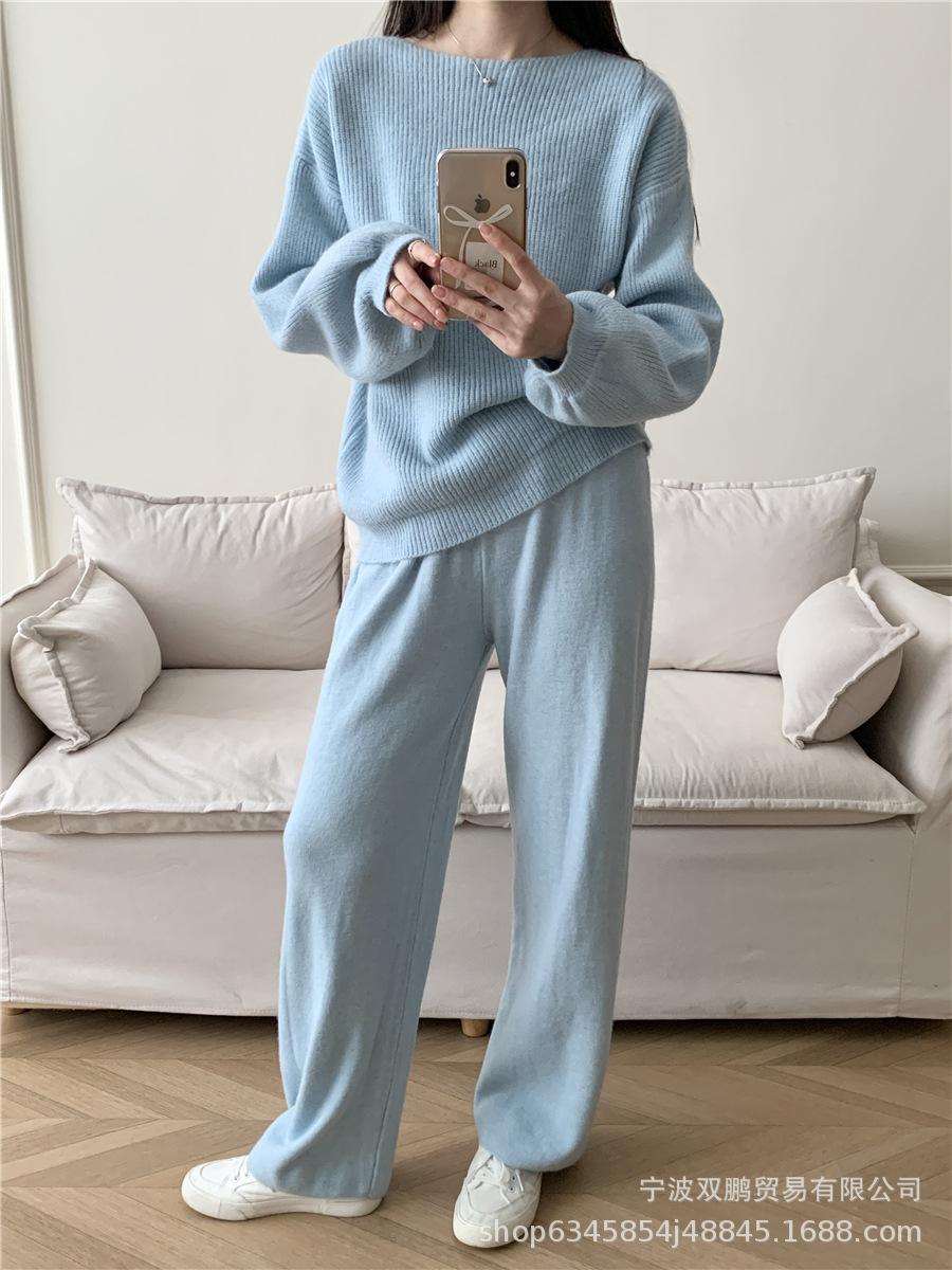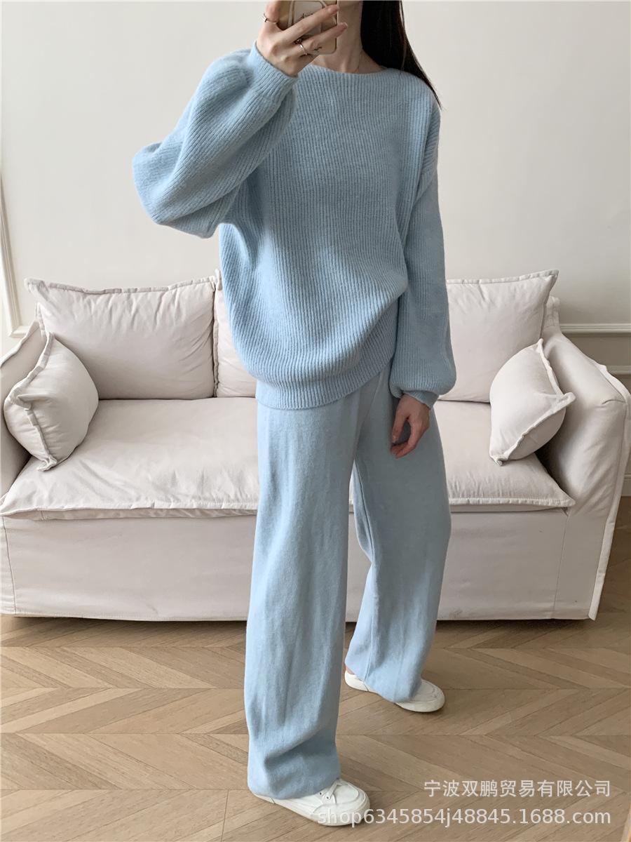 Traje de punto holgado de estilo europeo y americano transfronterizo de gran venta para mujer 2025 Otoño e Invierno Nuevo Suéter de cuello redondo + Pantalón de pierna ancha Foto real