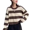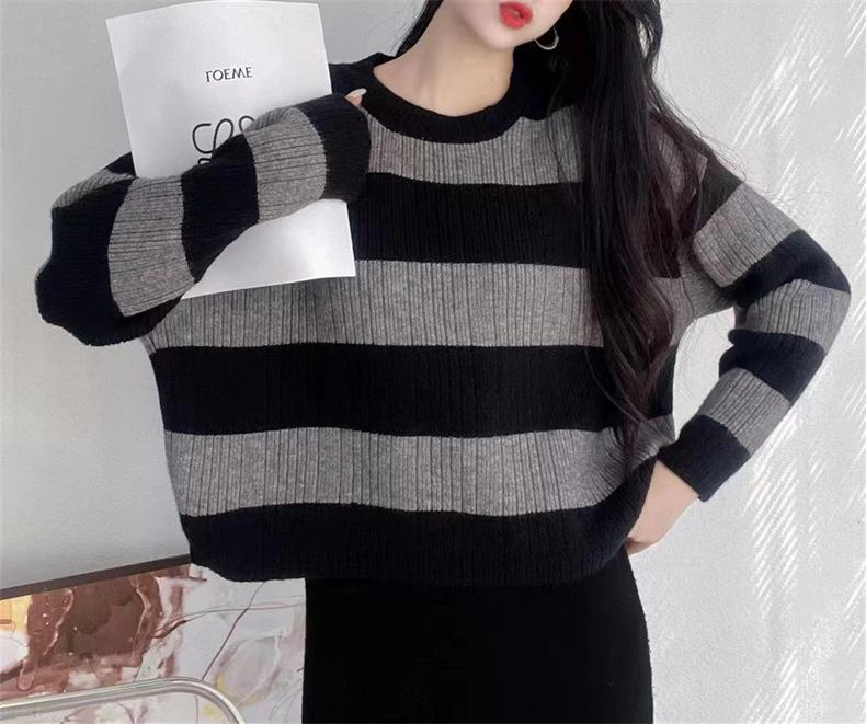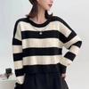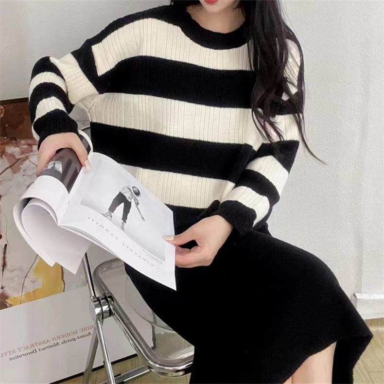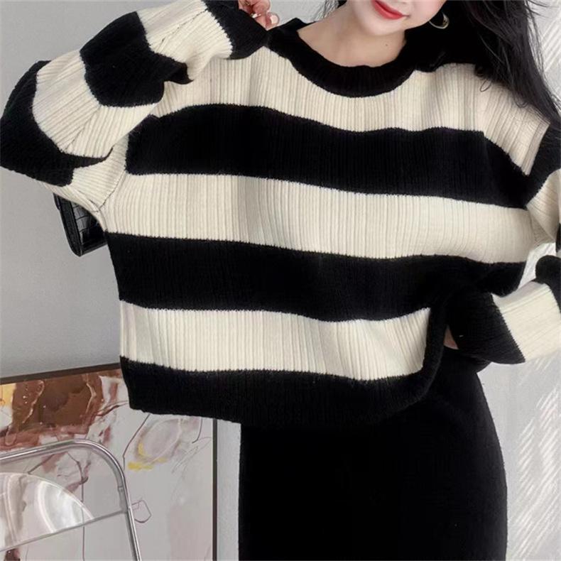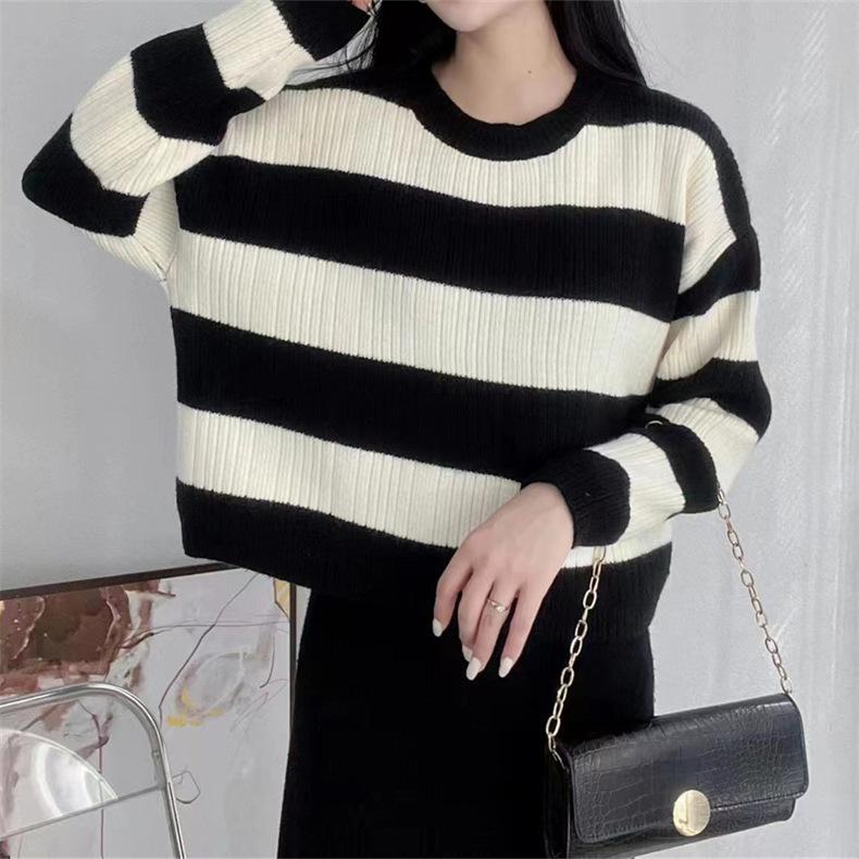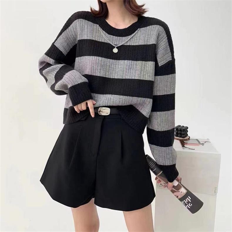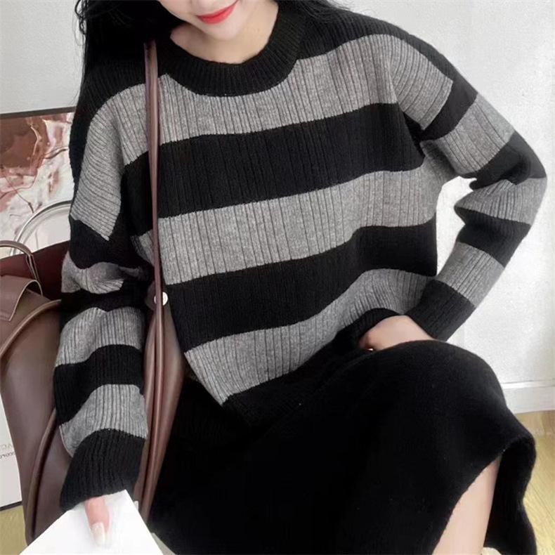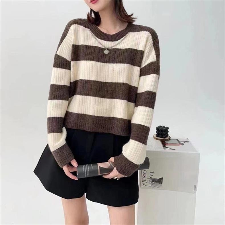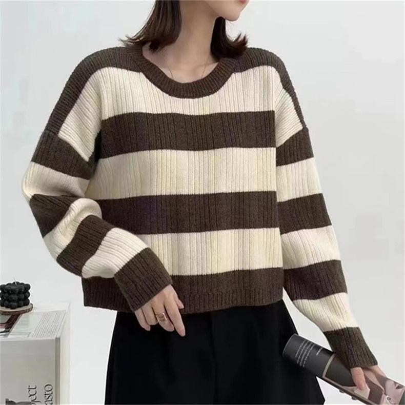 Suéter Tejido a Rayas de Cuello Redondo Holgado Nuevo Estilo Primavera y Otoño 2023 Estilo Perezoso Jersey de Punto Cómodo Casual Top