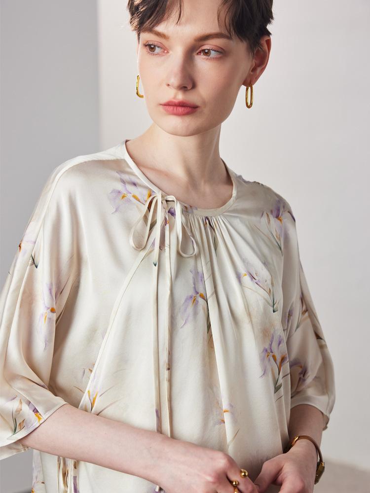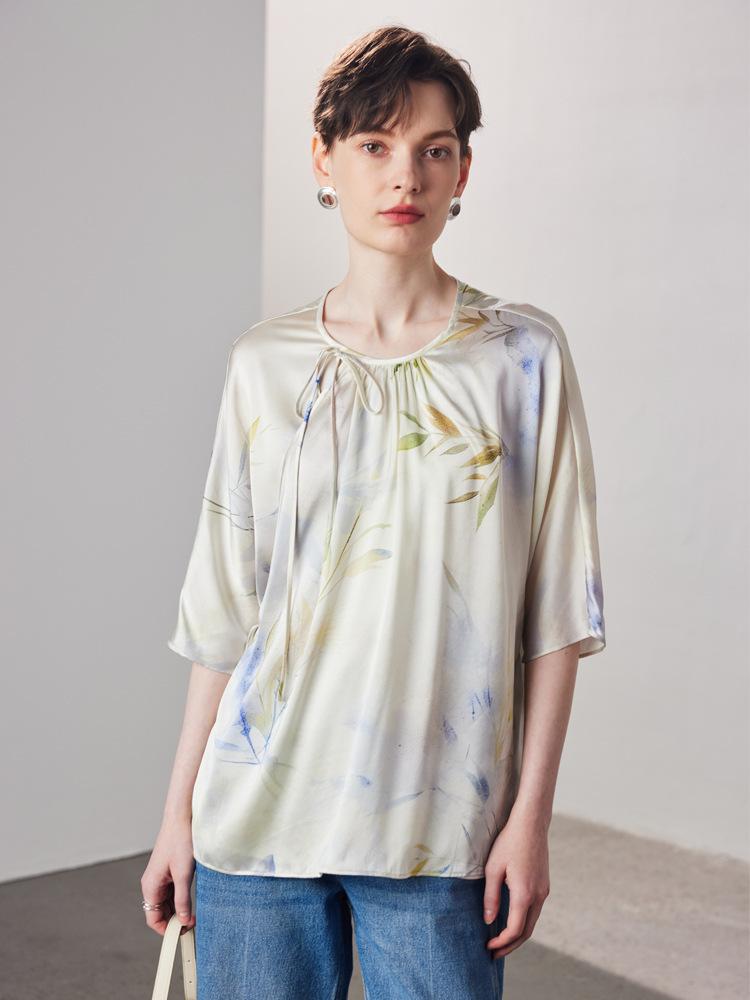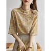 Top de Nuevo Estilo Chino para Mujer 2024 Primavera y Verano Nueva Llegada Media Manga Suelto Estampado Simple Estilo Nacional Satén Estampado Seda de Morera