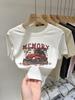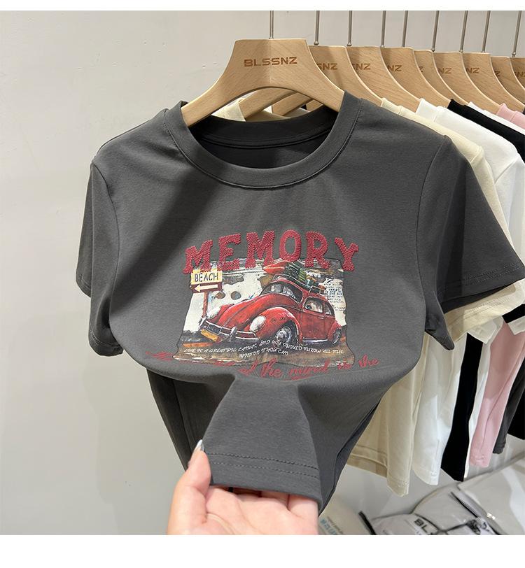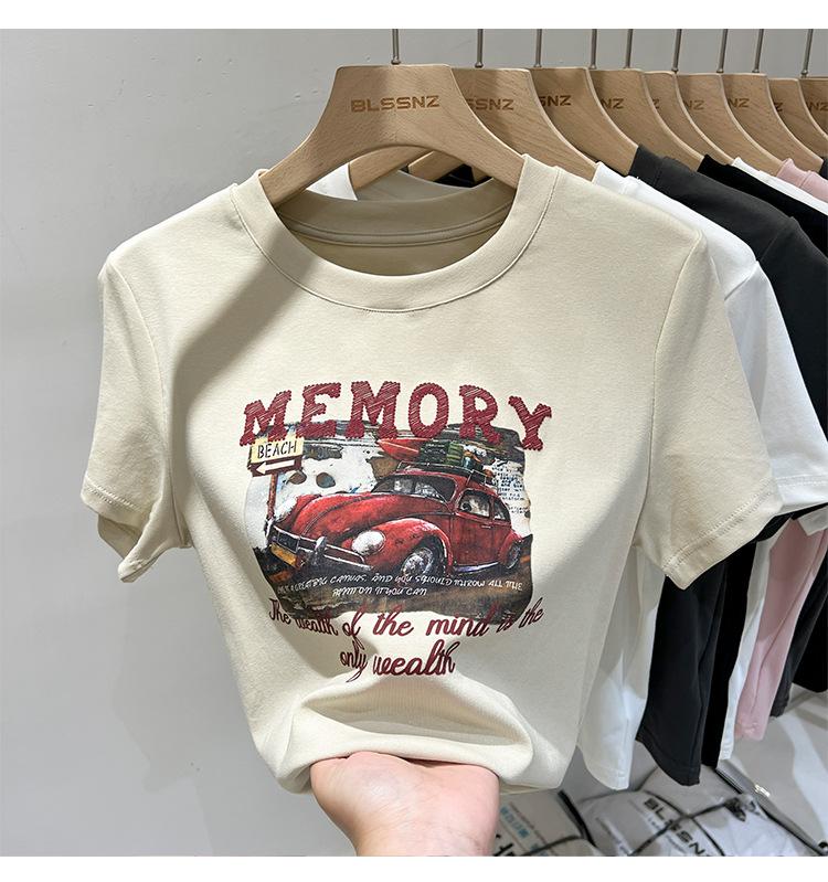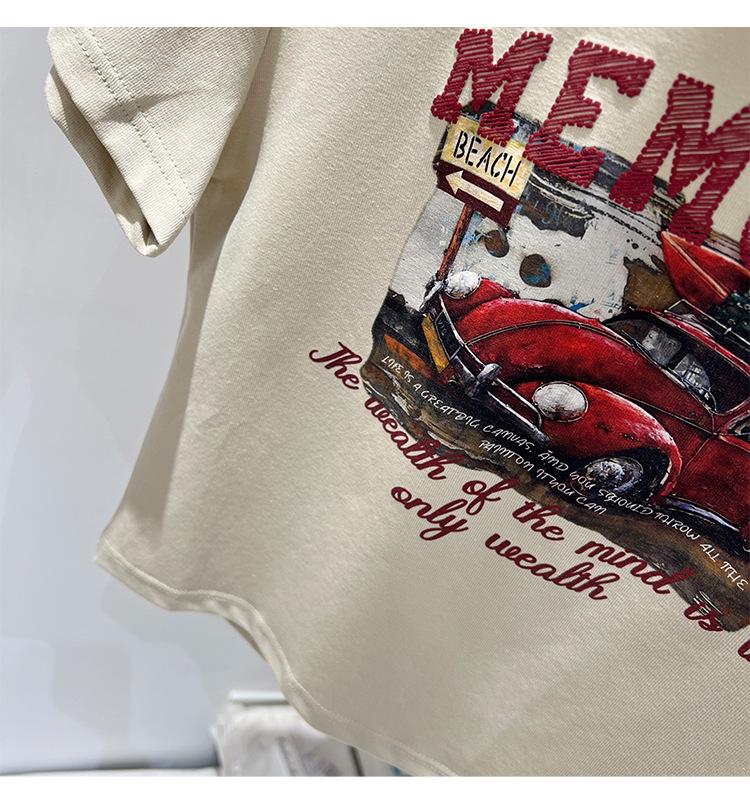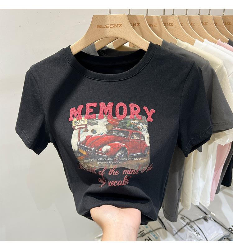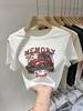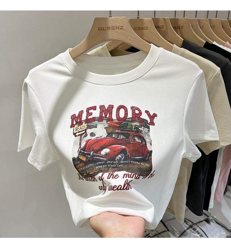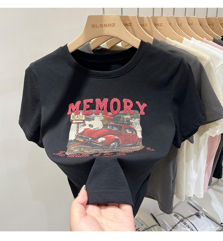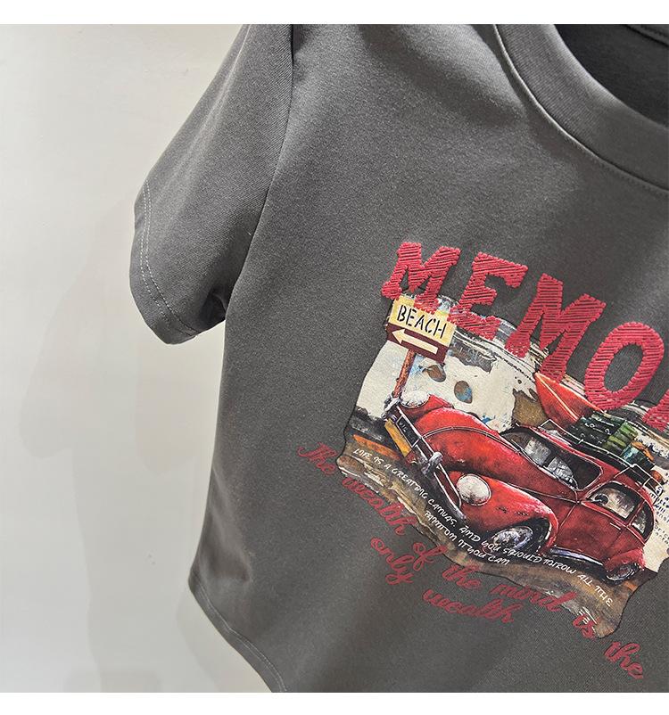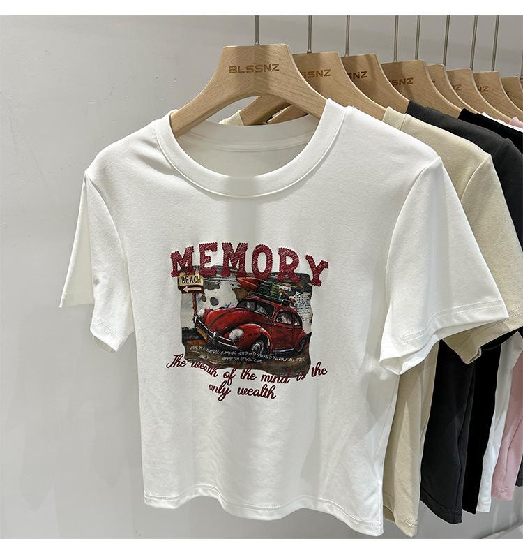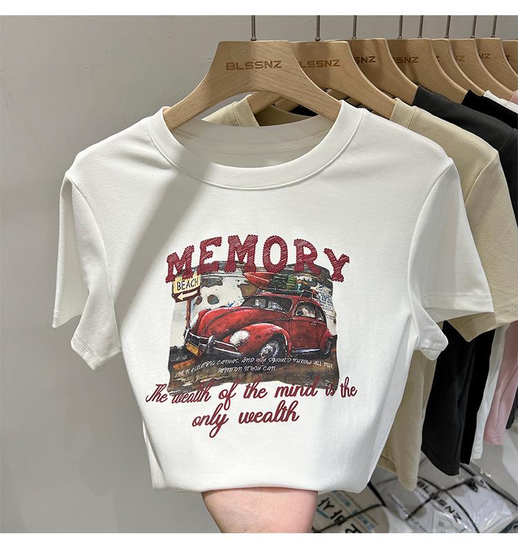 Camiseta de manga corta con hombros descubiertos y estampado retro estilo americano para mujer, verano 2024, nuevo diseño Sense Niche Short Top