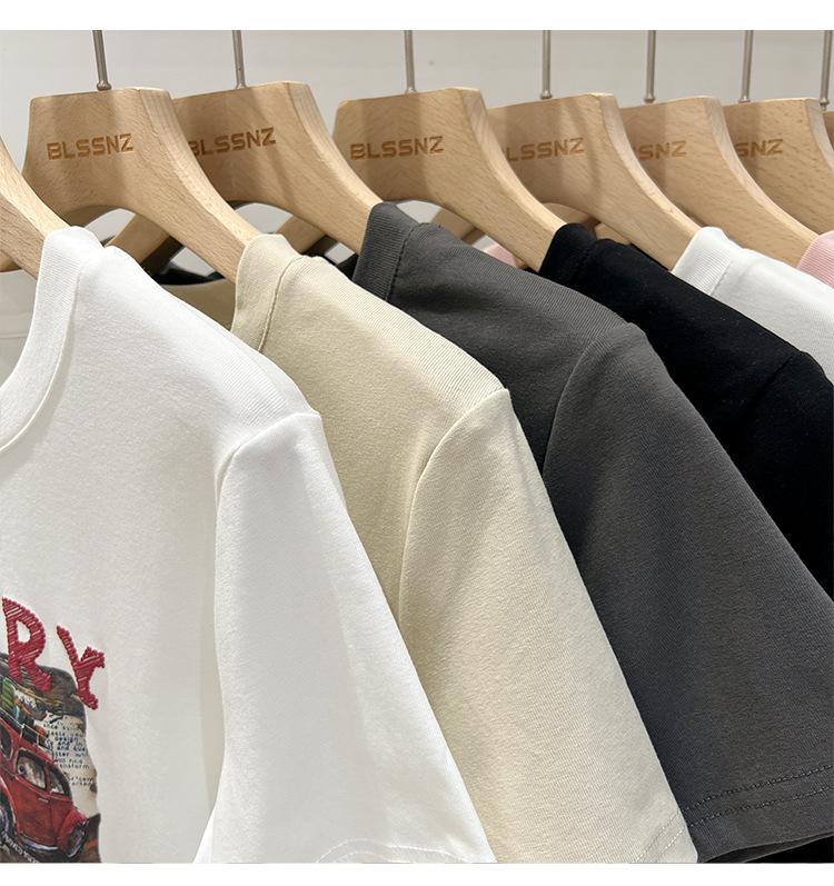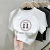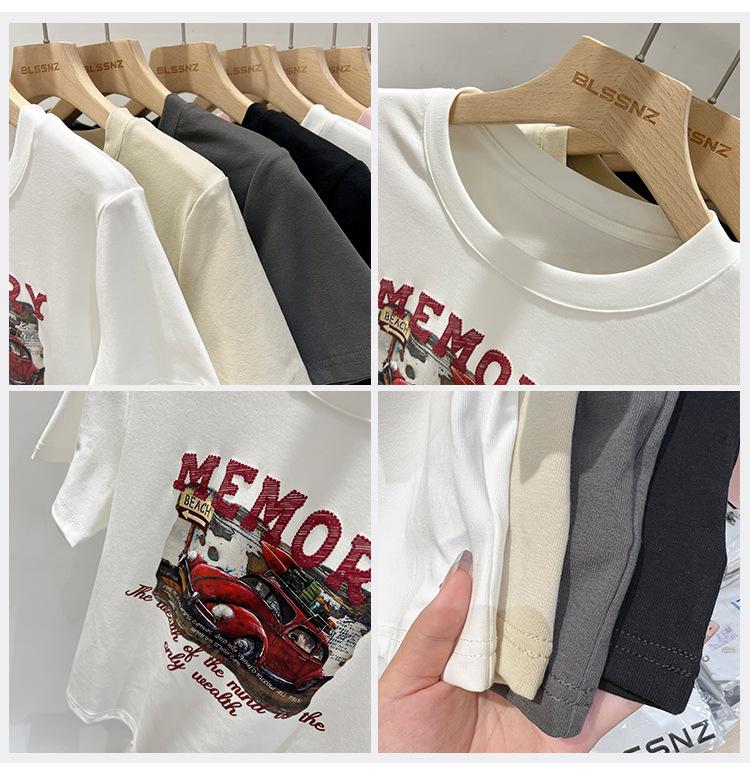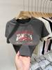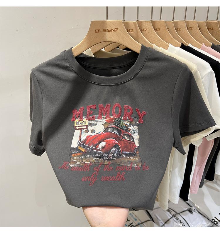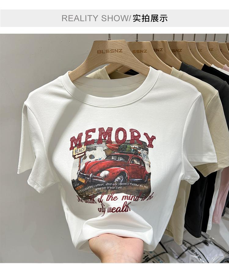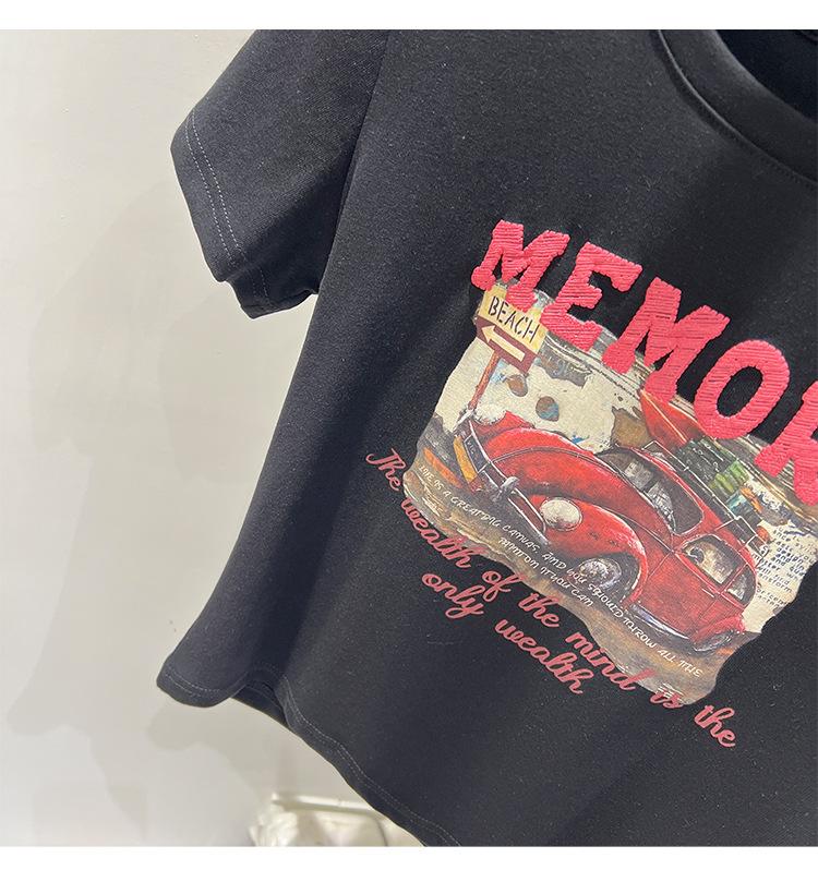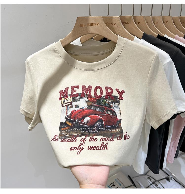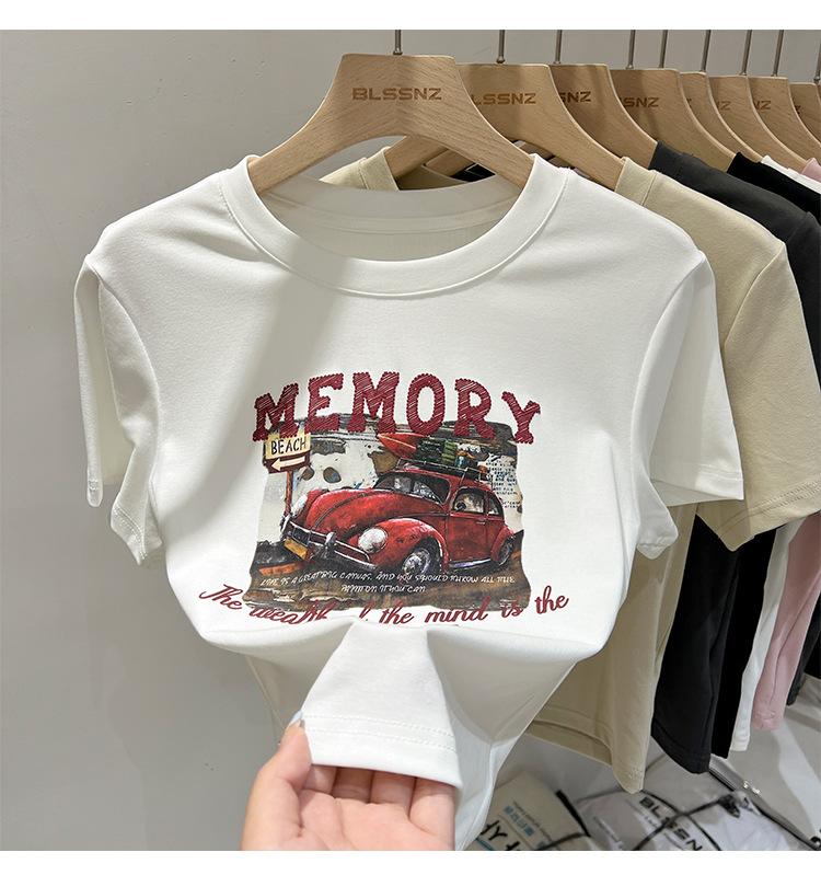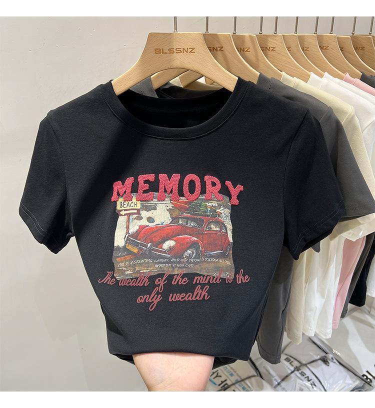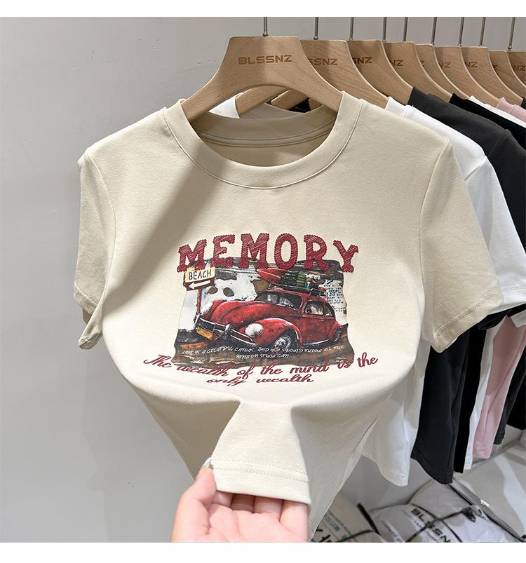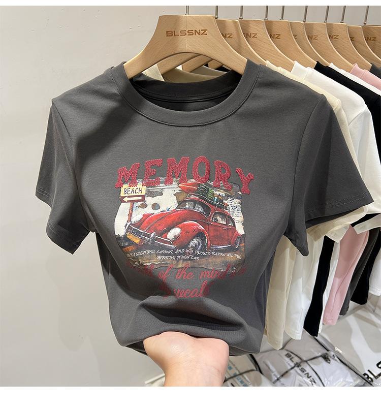Camiseta de manga corta con hombros descubiertos y estampado retro estilo americano para mujer, verano 2024, nuevo diseño Sense Niche Short Top