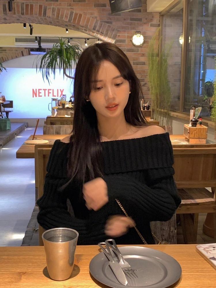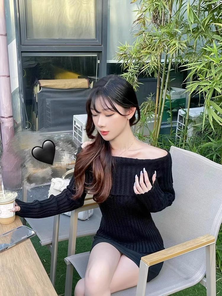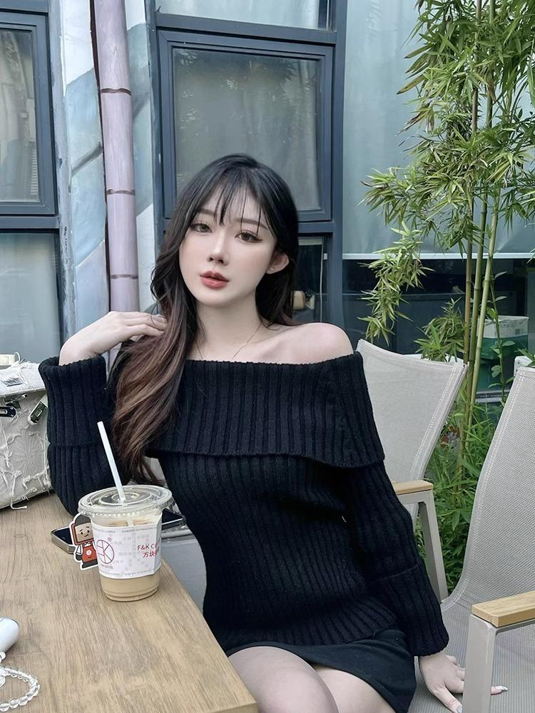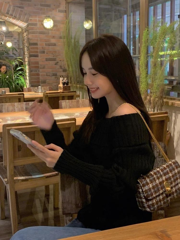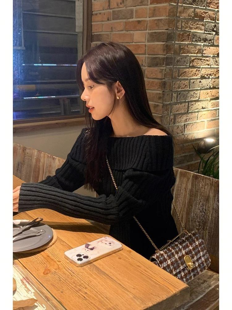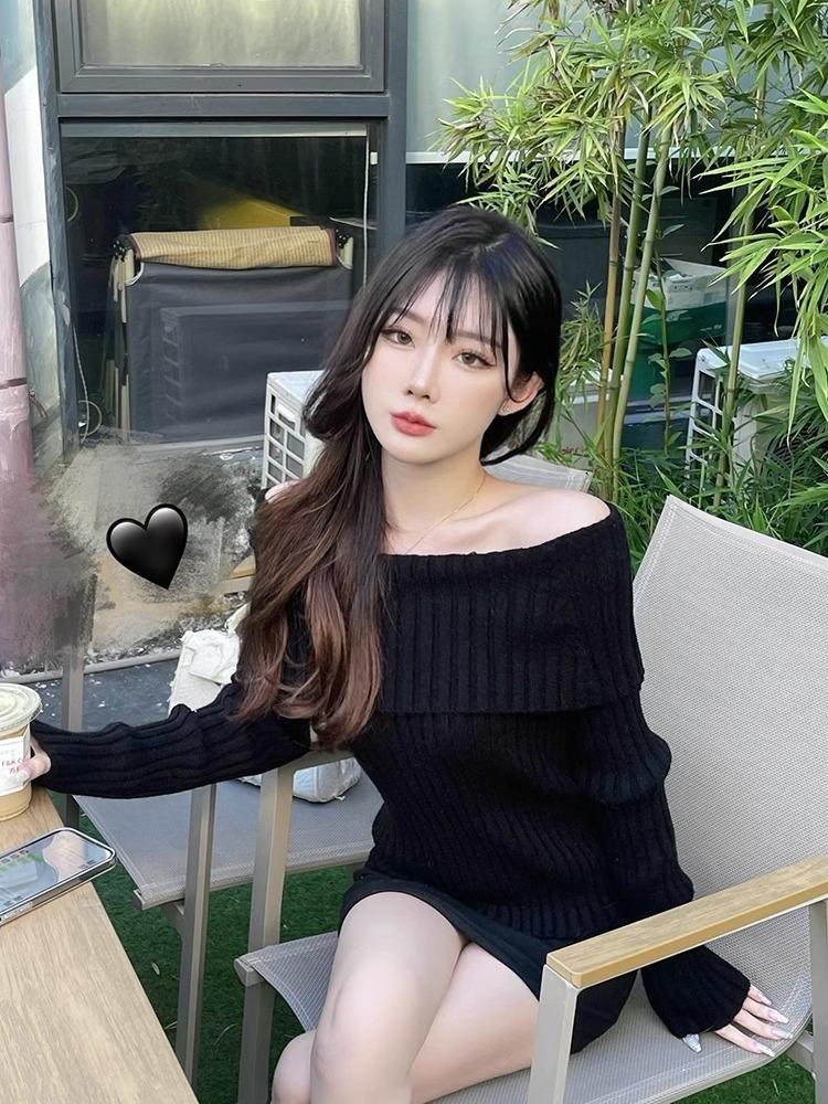 Suéter Negro de un Hombro para Mujer 2023 Otoño e Invierno Nuevo Estilo Estilo Suave y Perezoso Fuera del Hombro Jersey de Manga Larga Top de Punto