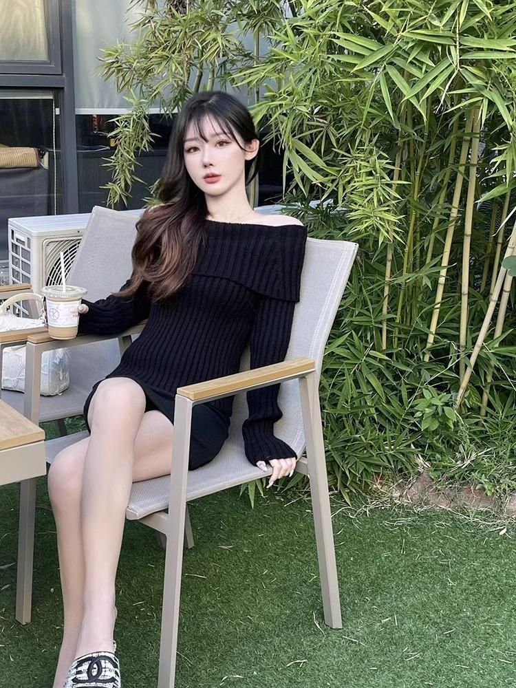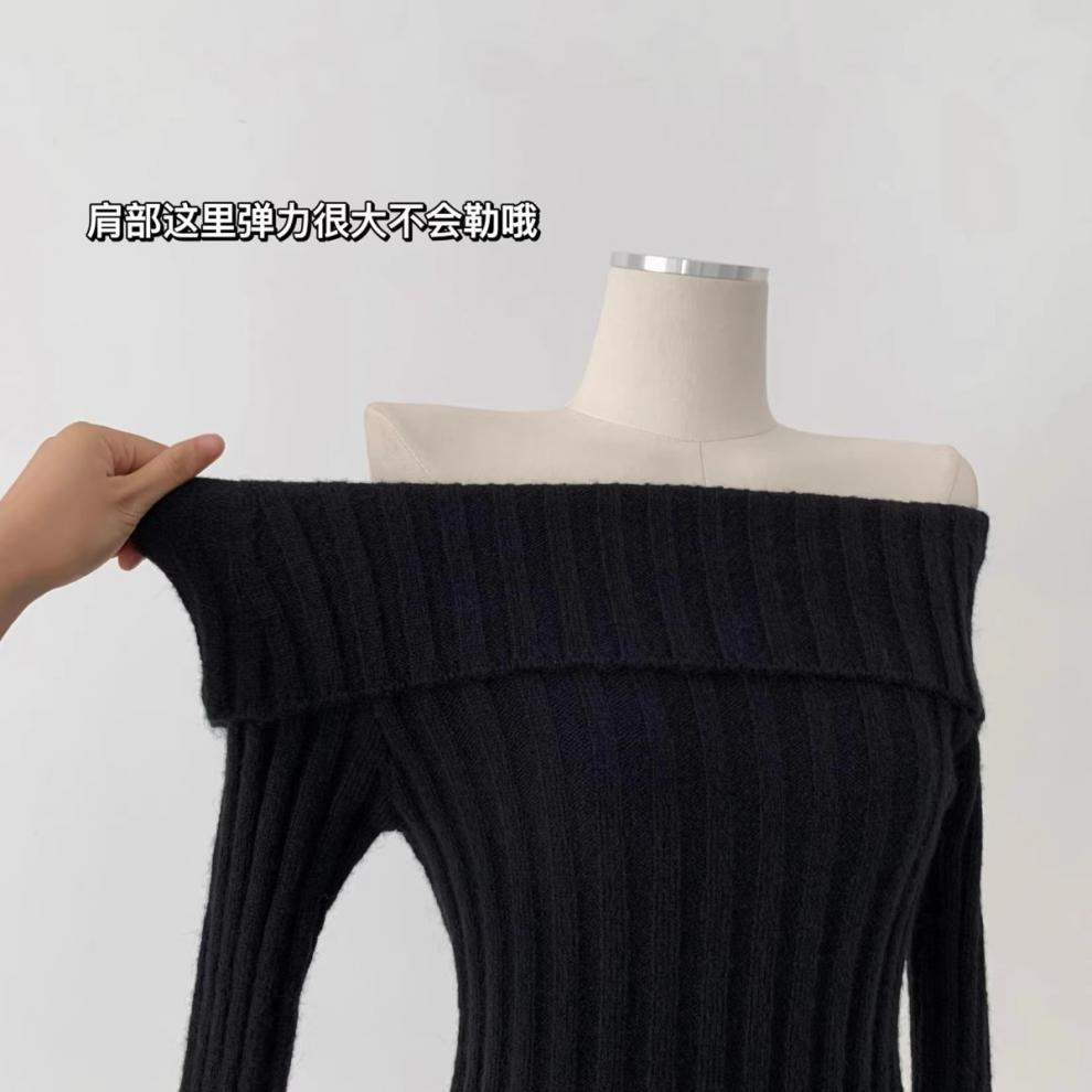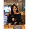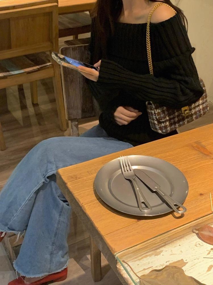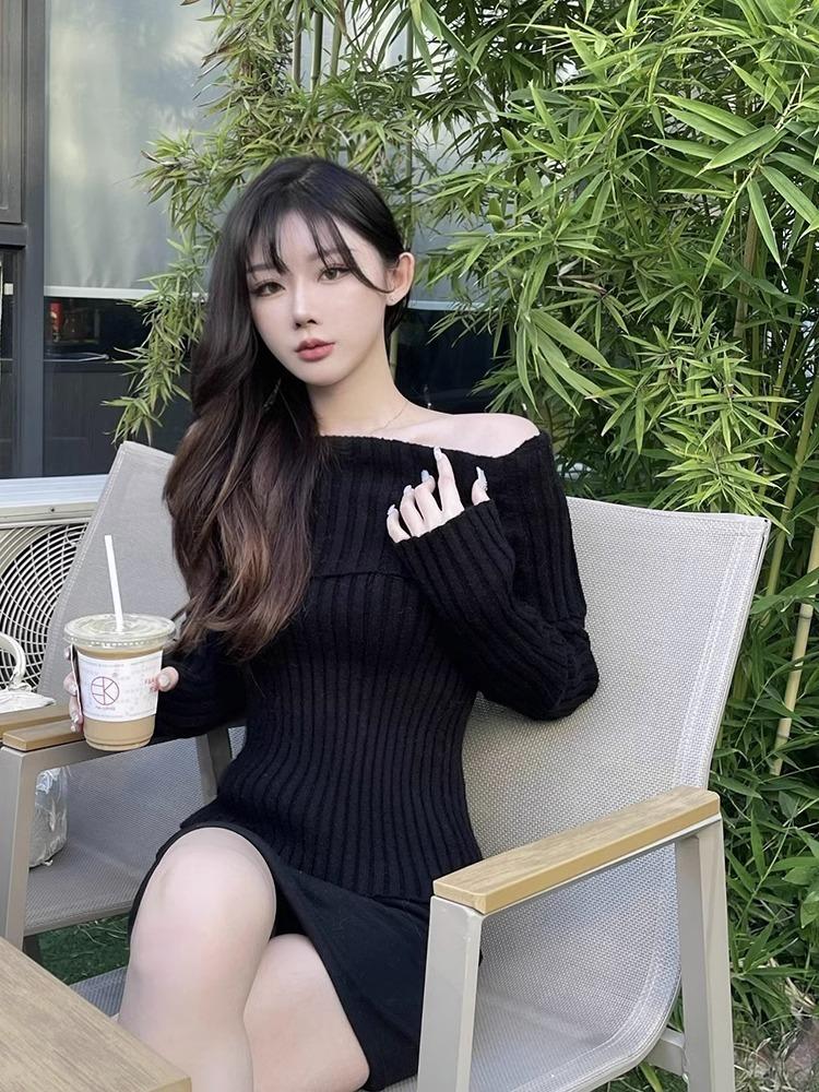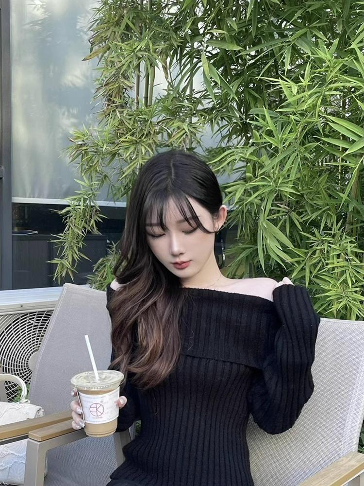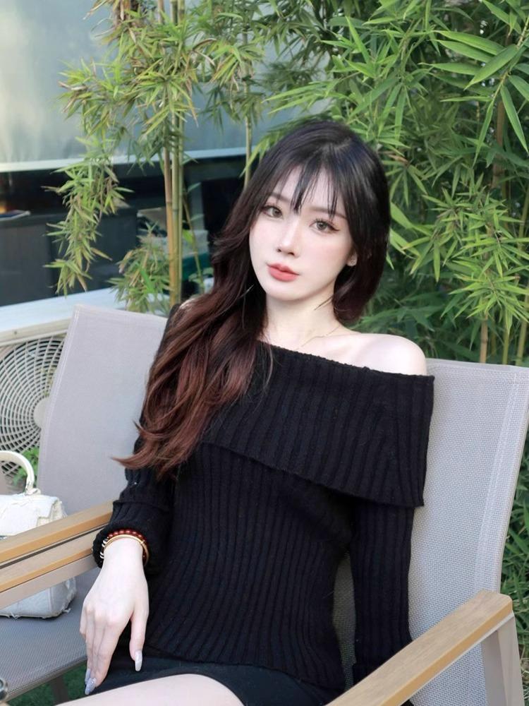 Suéter Negro de un Hombro para Mujer 2023 Otoño e Invierno Nuevo Estilo Estilo Suave y Perezoso Fuera del Hombro Jersey de Manga Larga Top de Punto