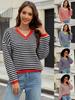Suéter listrado casual feminino europeu e americano transfronteiriço, outono e inverno, nova moda, contraste de cores, gola V, suéter de malha, fábrica