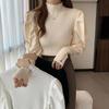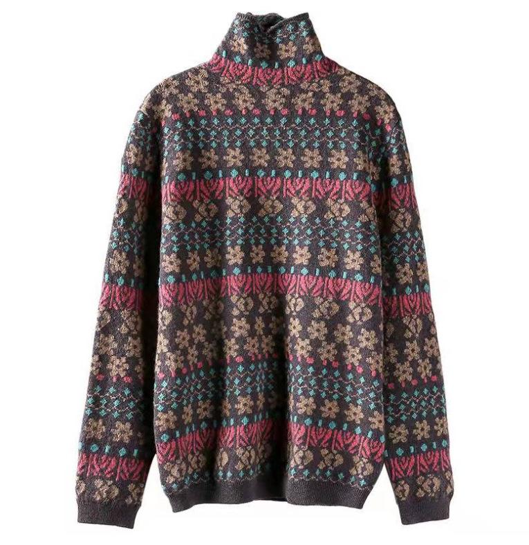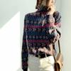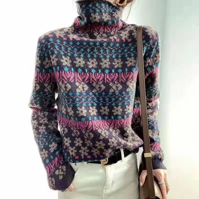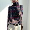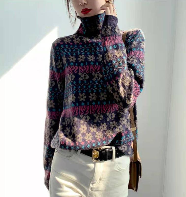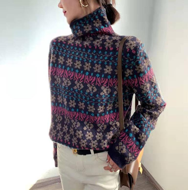 Suéter de cuello alto jacquard retro para mujer, suéter holgado de otoño e invierno 2023, manga larga, estilo occidental de moda, base interior de punto