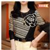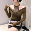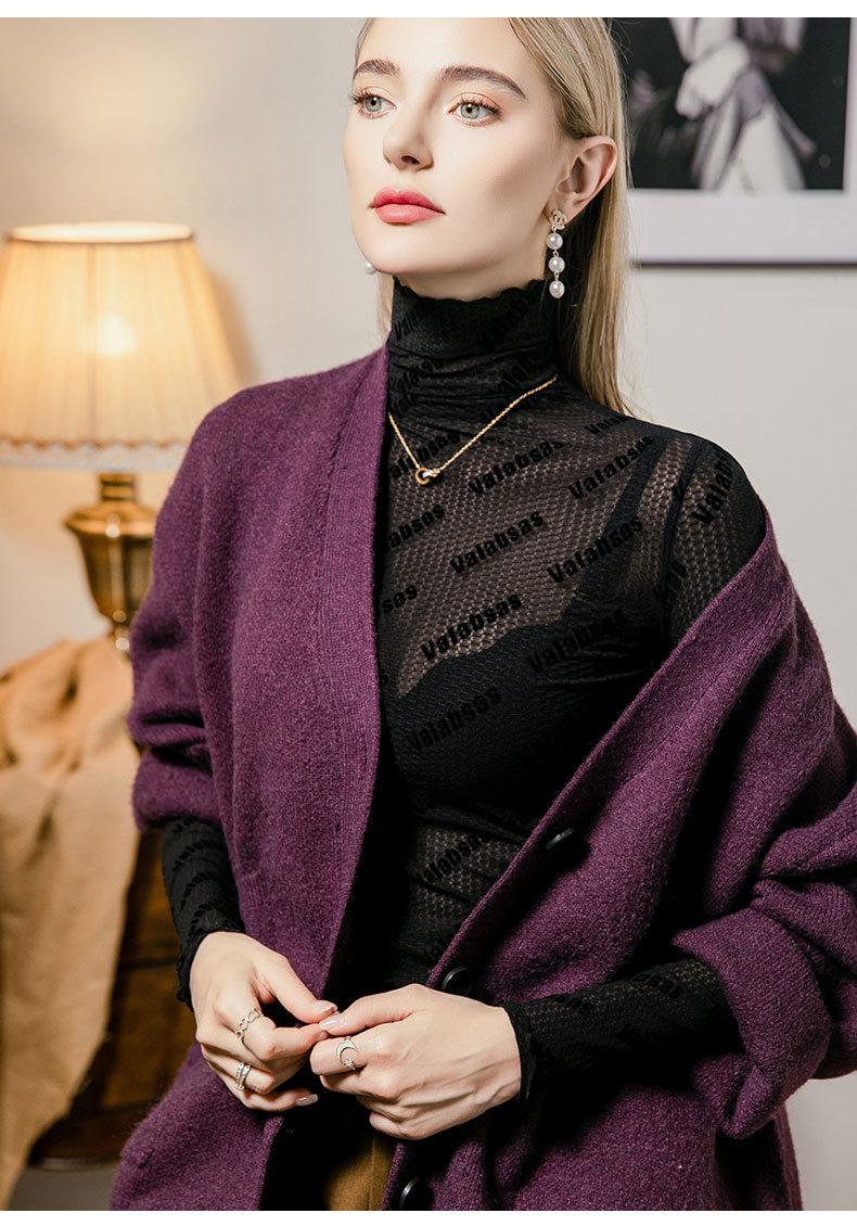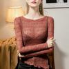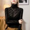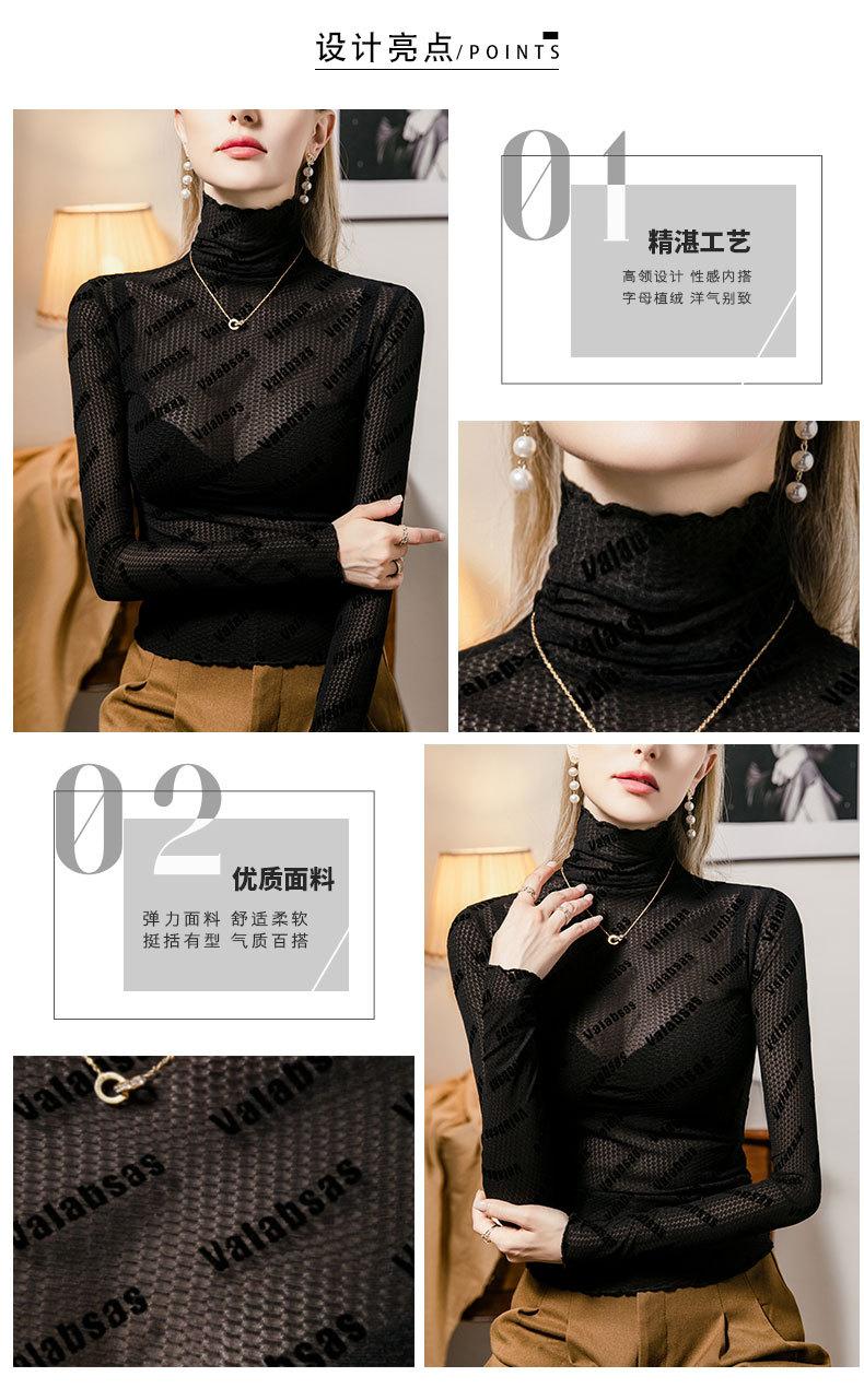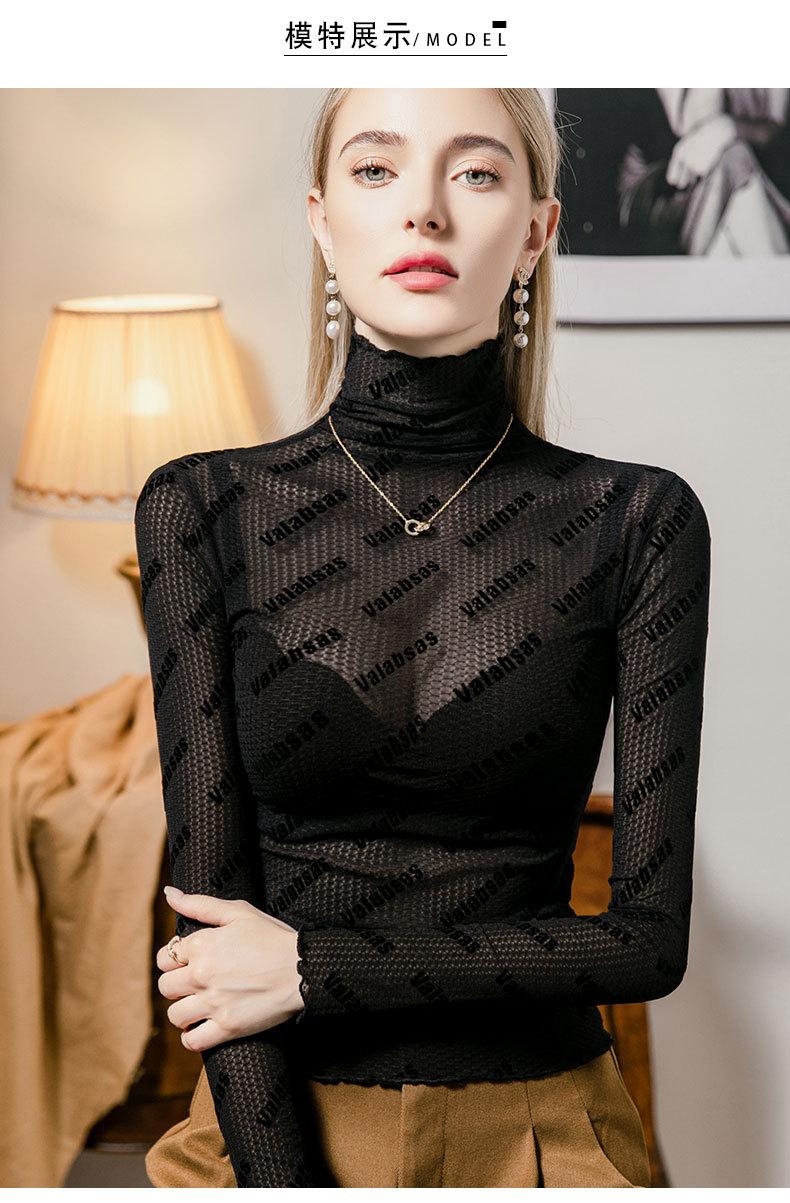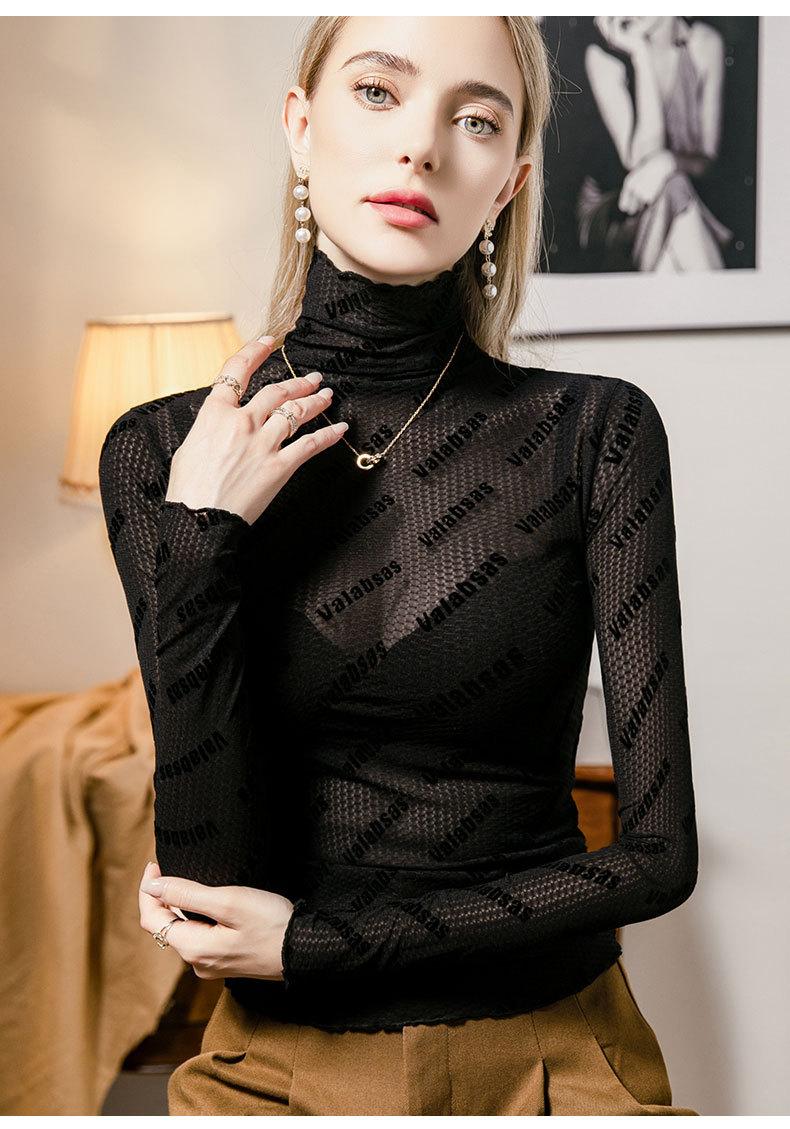Camisa de encaje con cuello alto para mujer, corte entallado, con letras de jacquard, otoño 2024, nueva camiseta interior negra para mujer