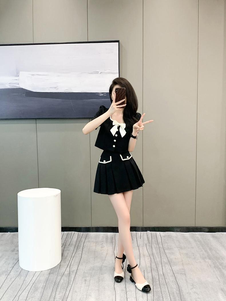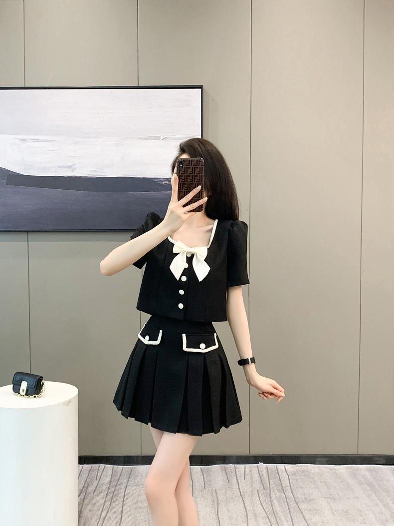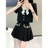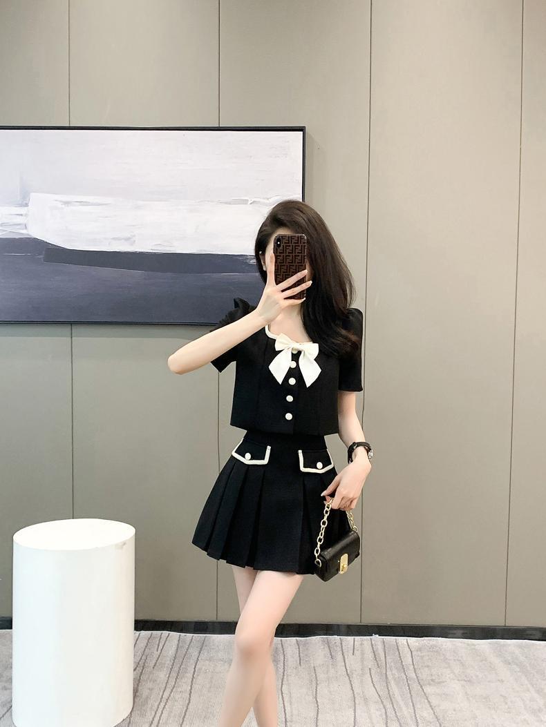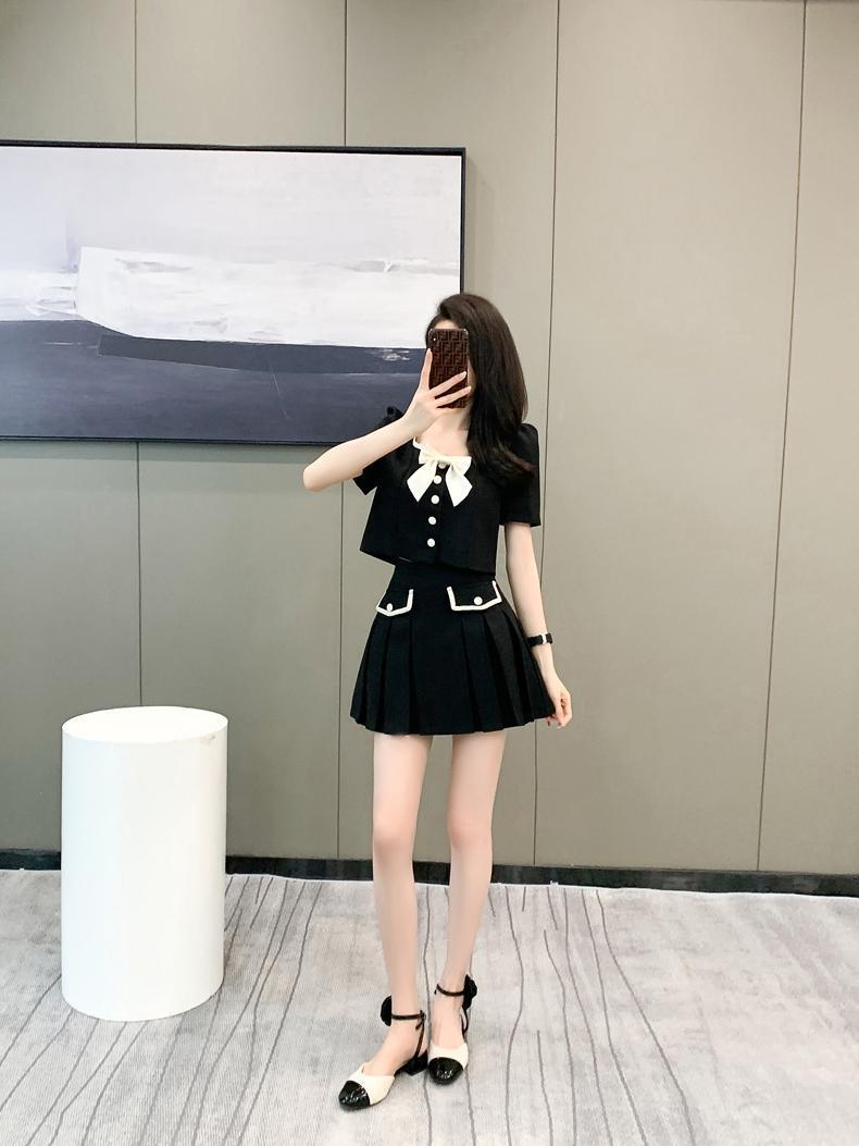 Abrigo Corto Estilo Lazo Chanel Negro Verano Nuevo Falda Adelgazante de Cintura Alta Traje Elegante de Alta Gama para Mujer