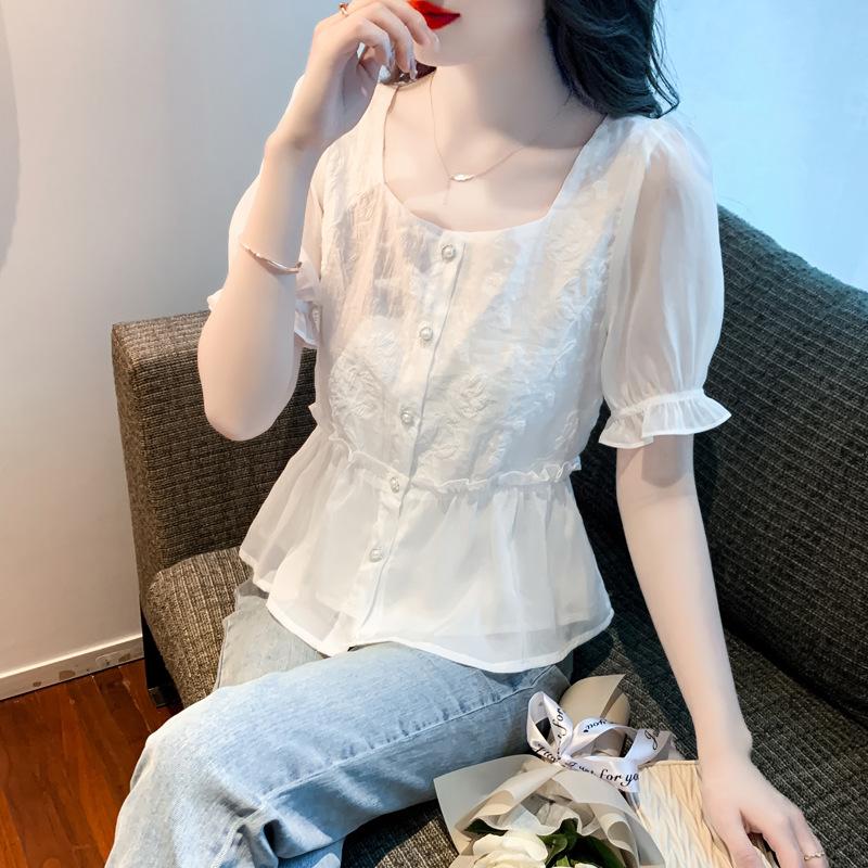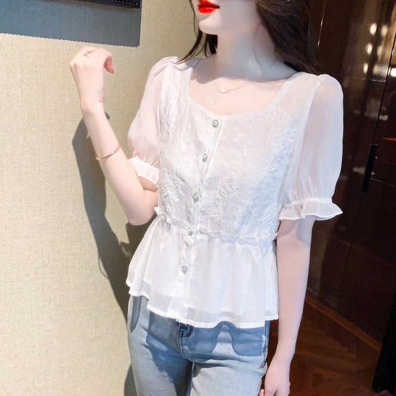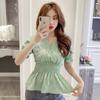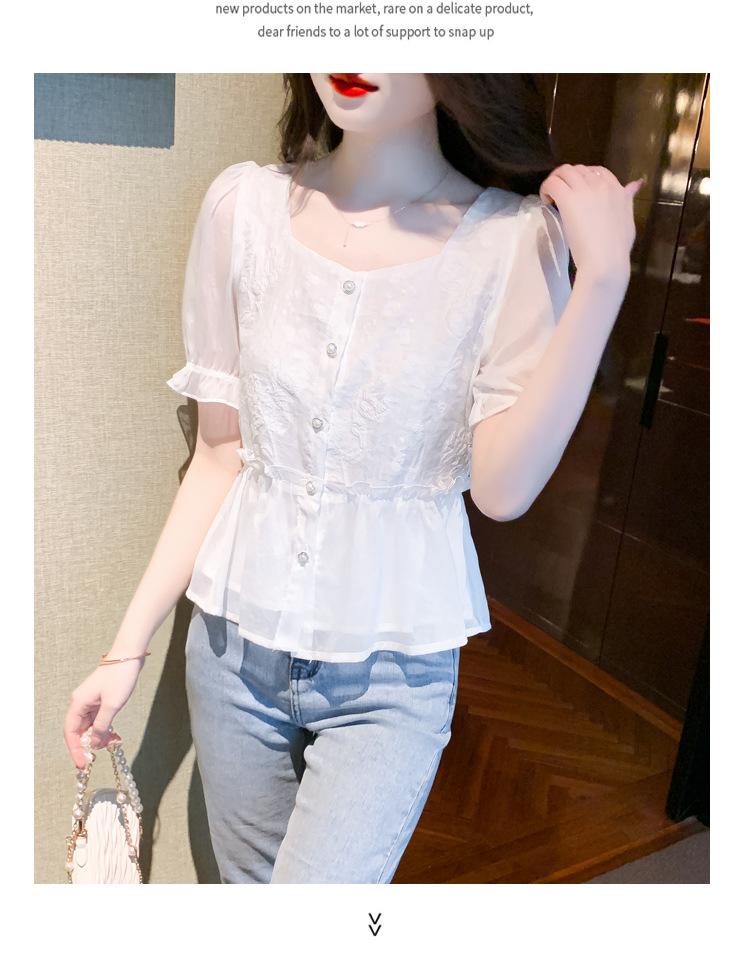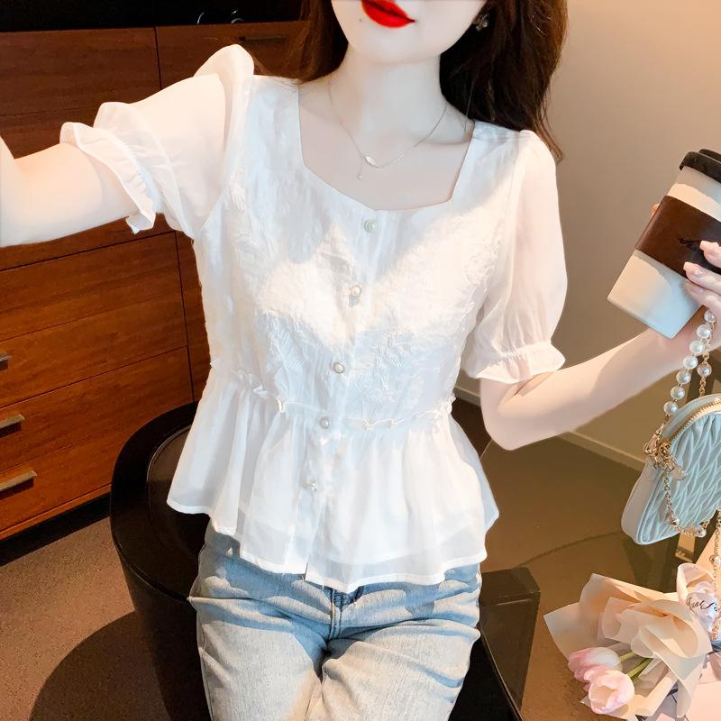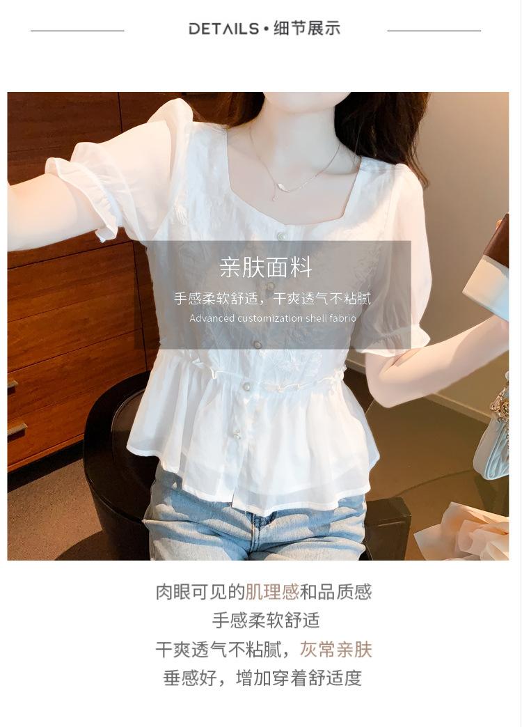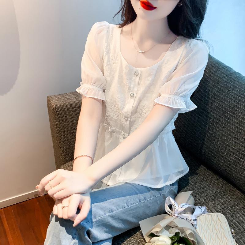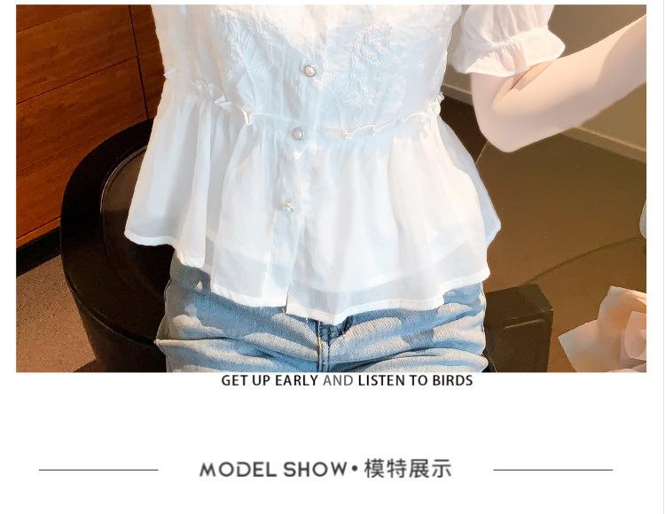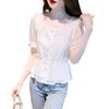 Camisa de gasa de manga corta con costuras de moda para mujer, novedad de verano 2024, elegante blusa de encaje con cintura adelgazante que combina con todo.