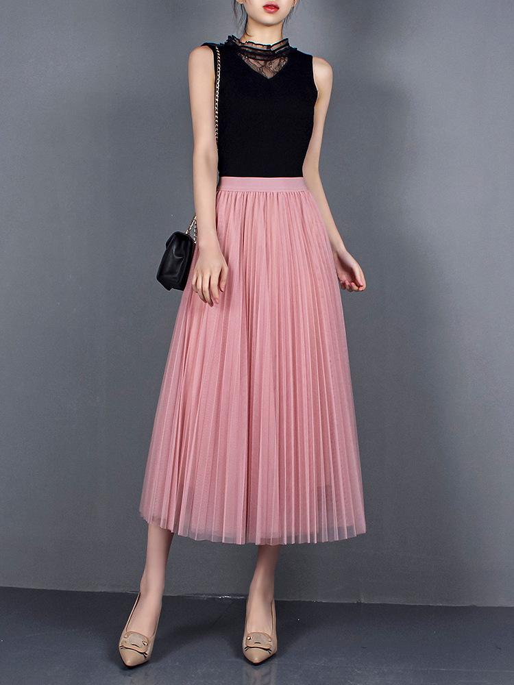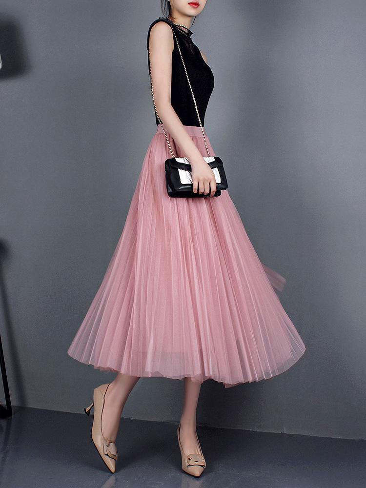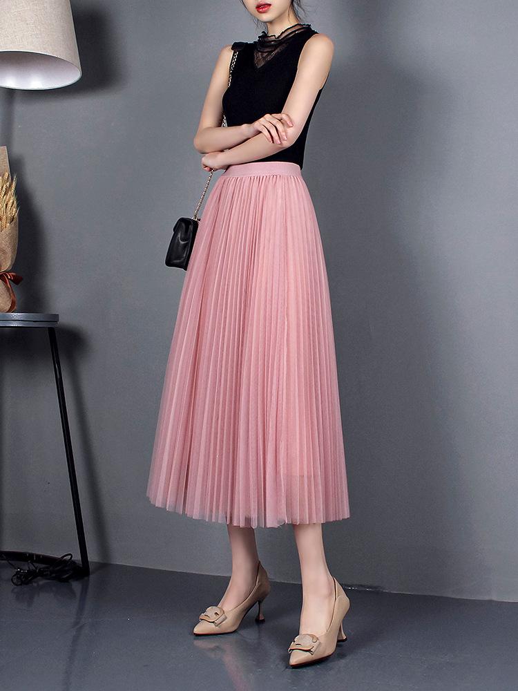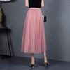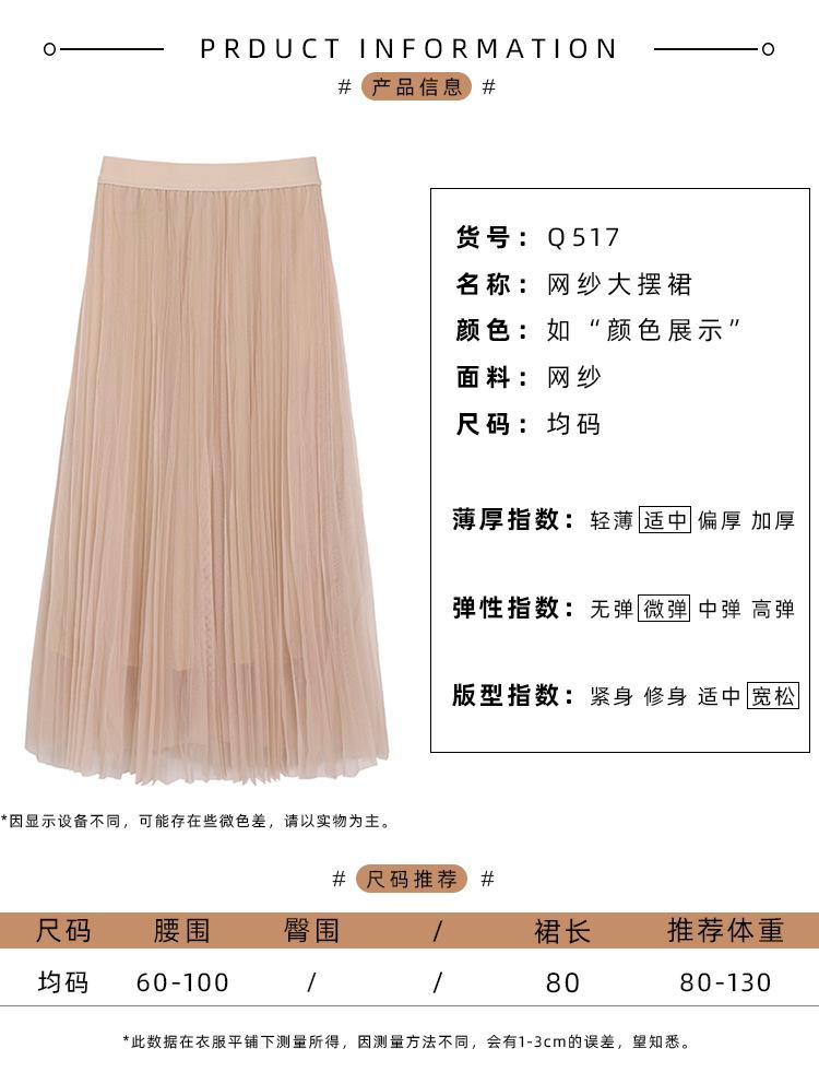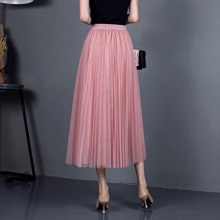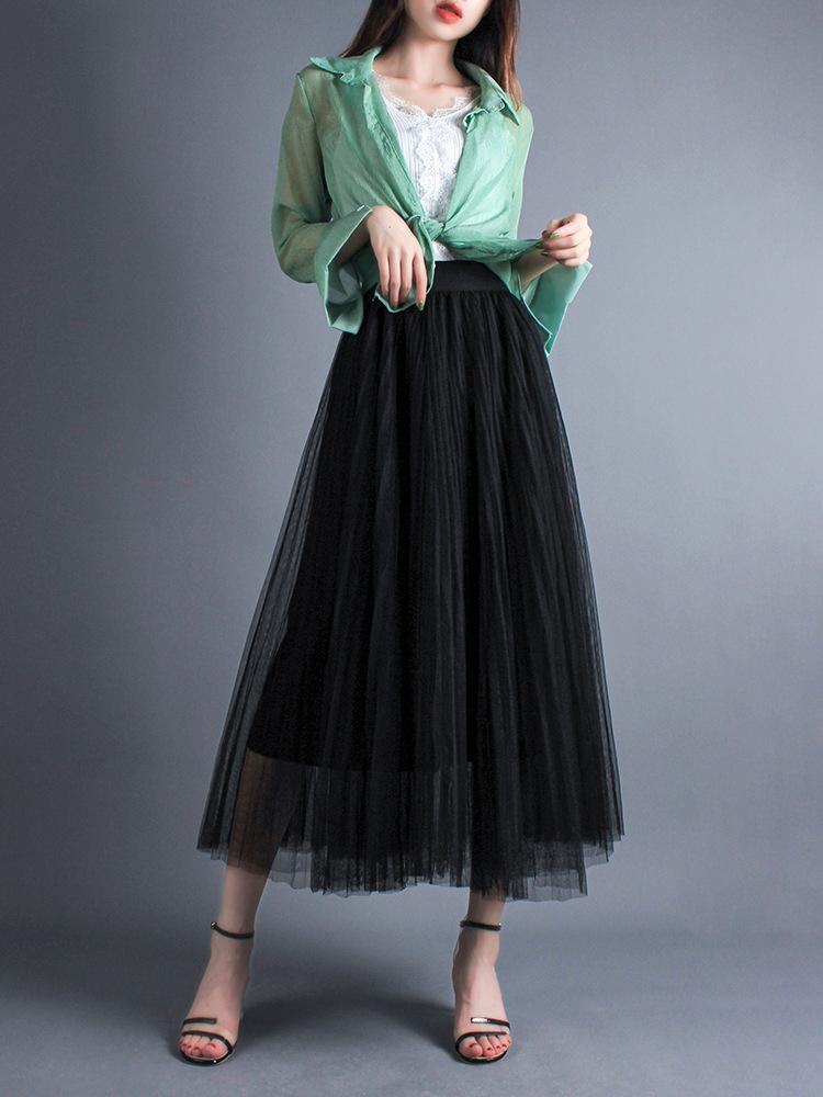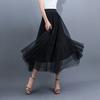 Estilo Europeo y Americano Transfronterizo Primavera Malla Fluida Color Sólido Falda Midi de Vuelo Amplio Versátil Falda de Hada Plisada Negra Estilo Elegante para la Oficina