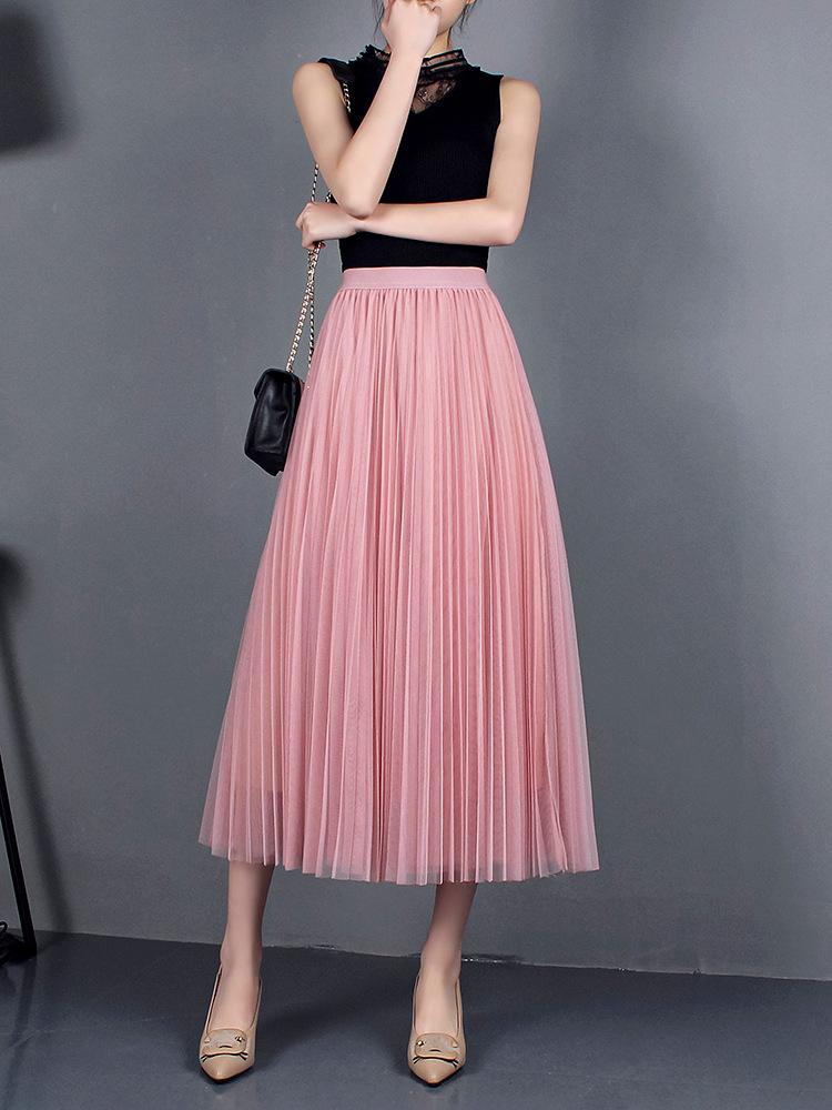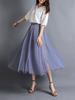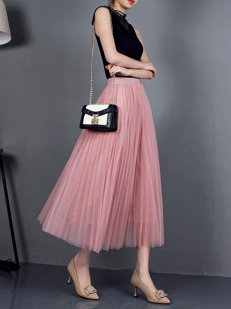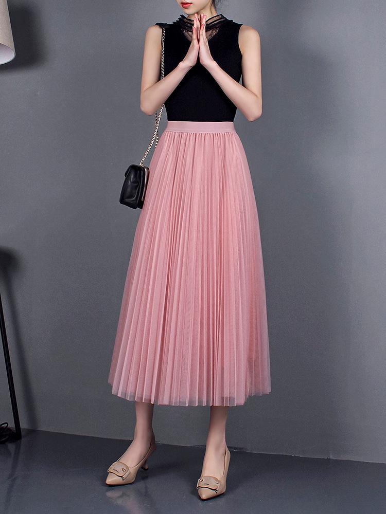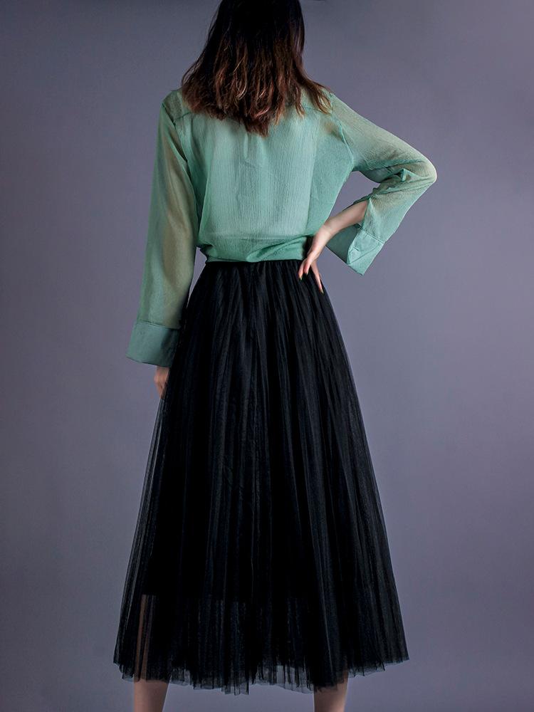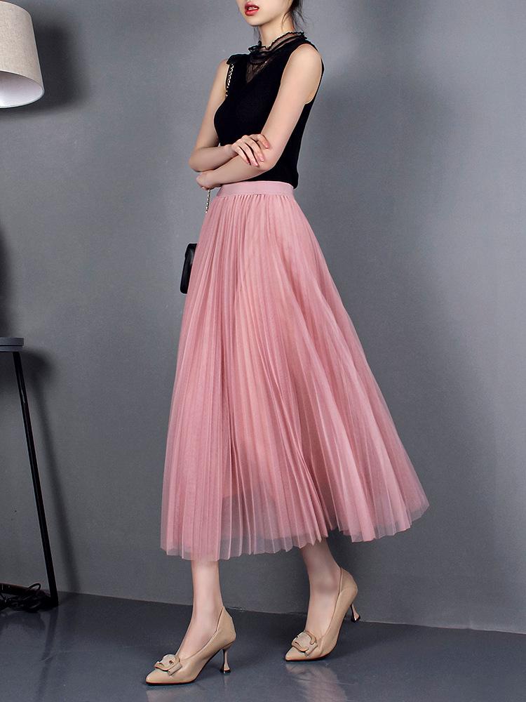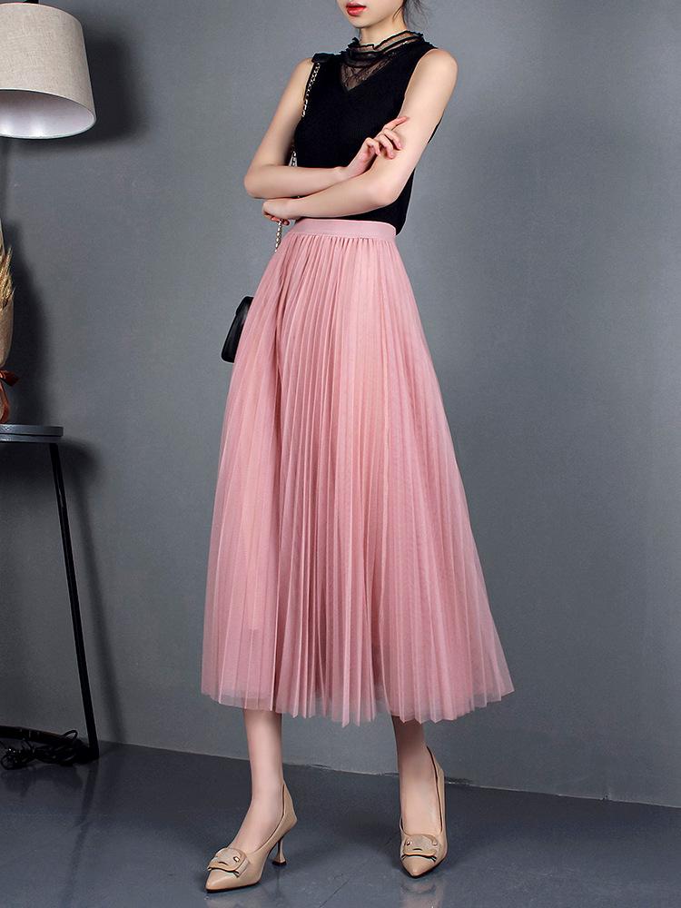 Estilo Europeo y Americano Transfronterizo Primavera Malla Fluida Color Sólido Falda Midi de Vuelo Amplio Versátil Falda de Hada Plisada Negra Estilo Elegante para la Oficina