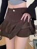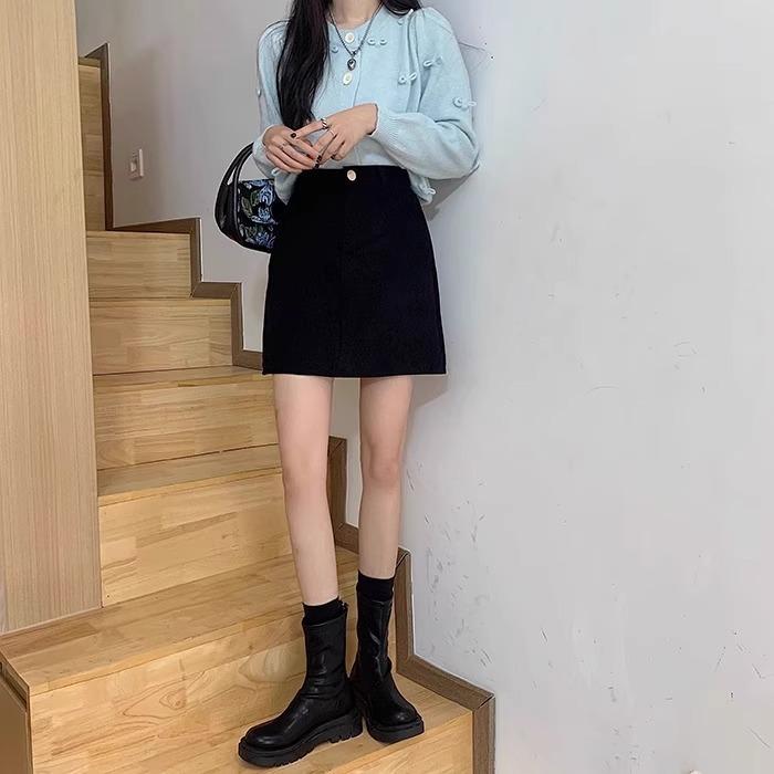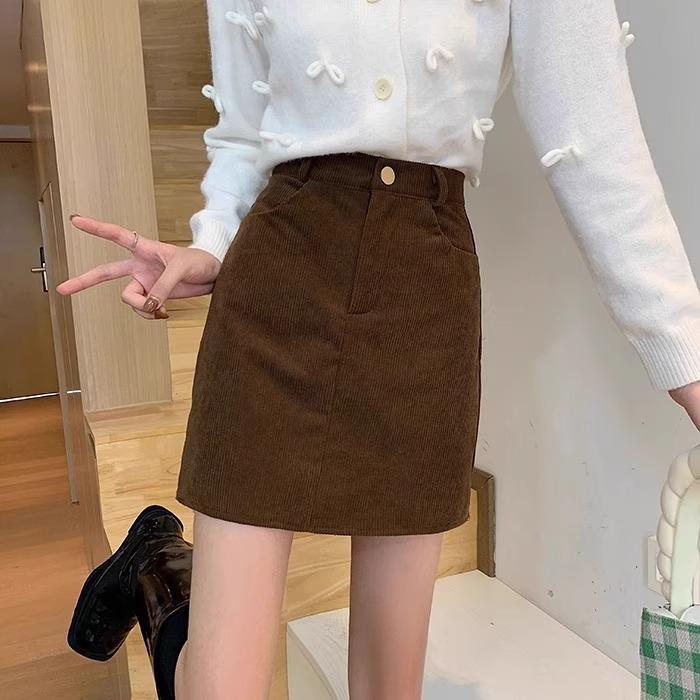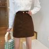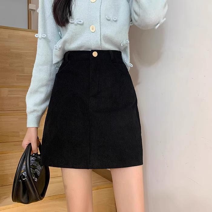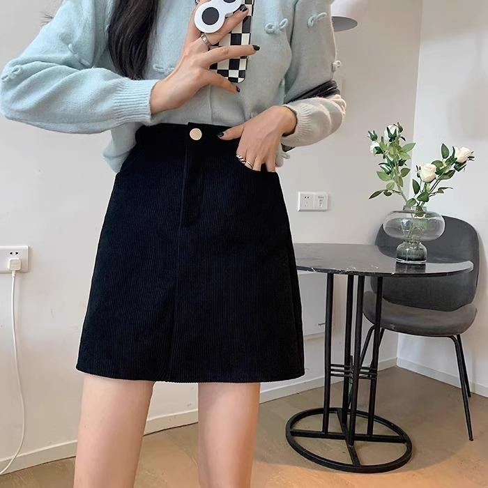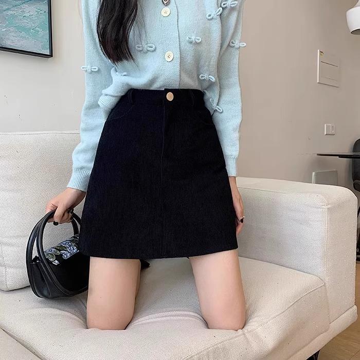 Falda negra de pana para mujer, otoño e invierno 2024, cintura alta, adelgazante, línea A, falda pequeña de moda a la cadera.