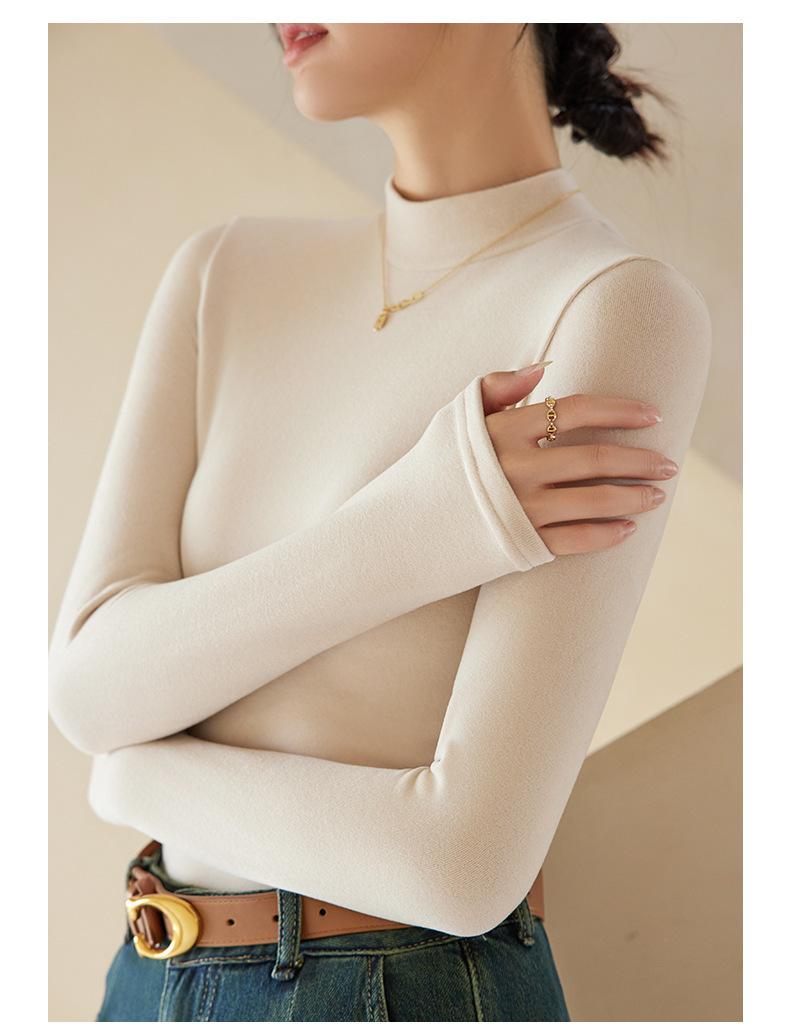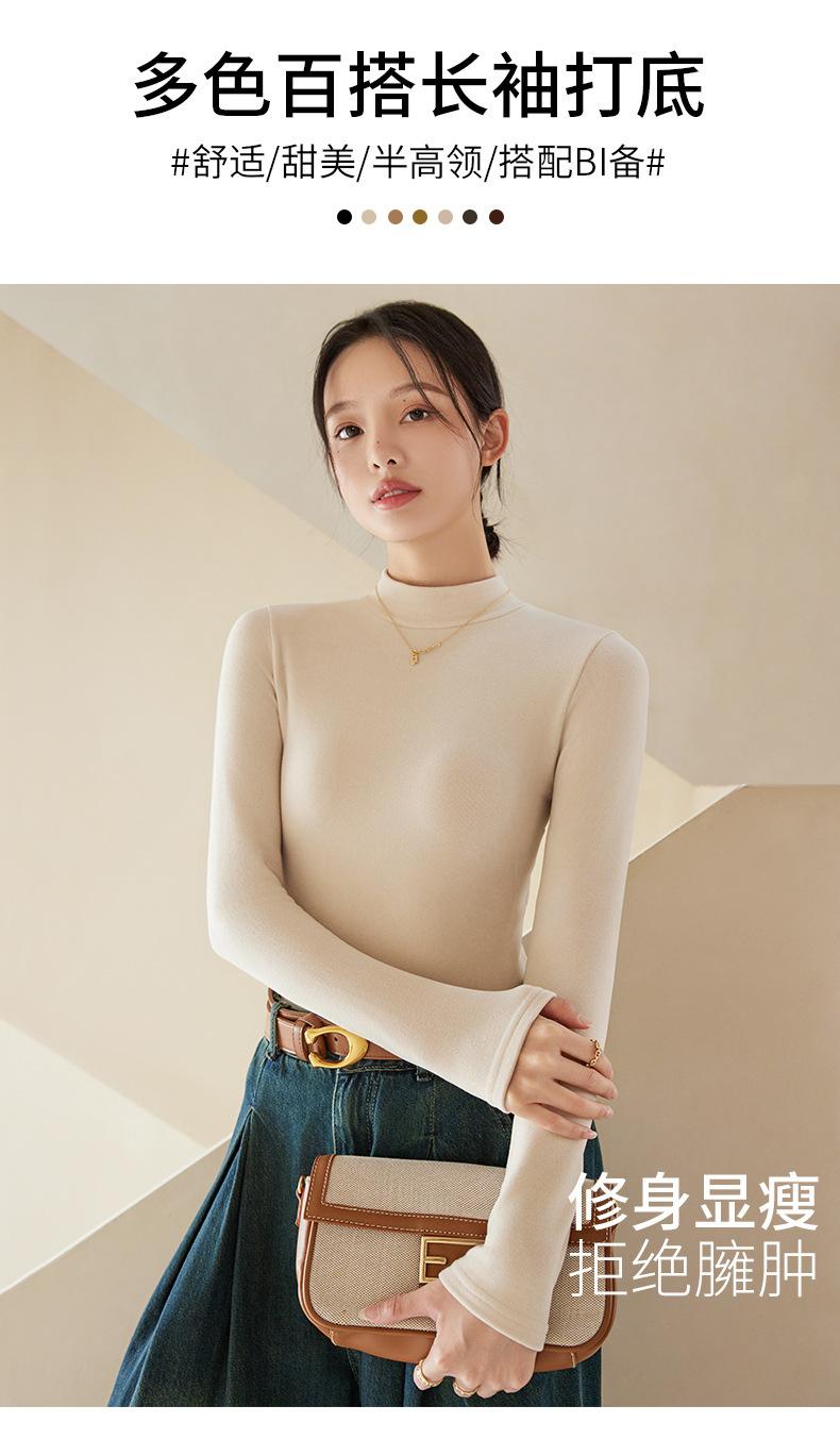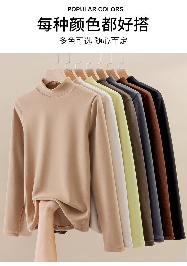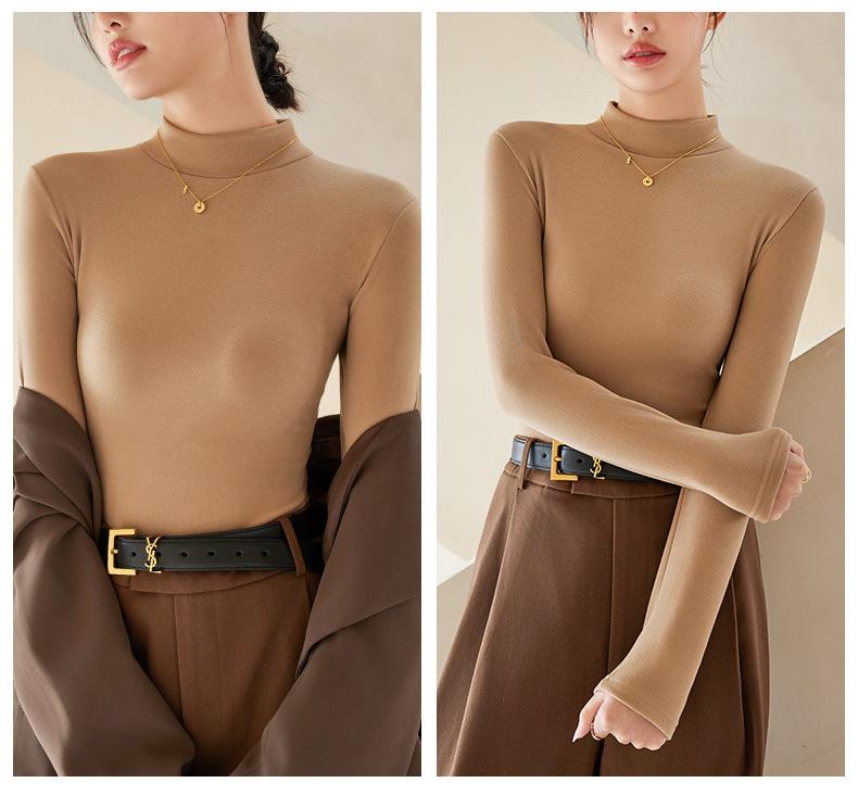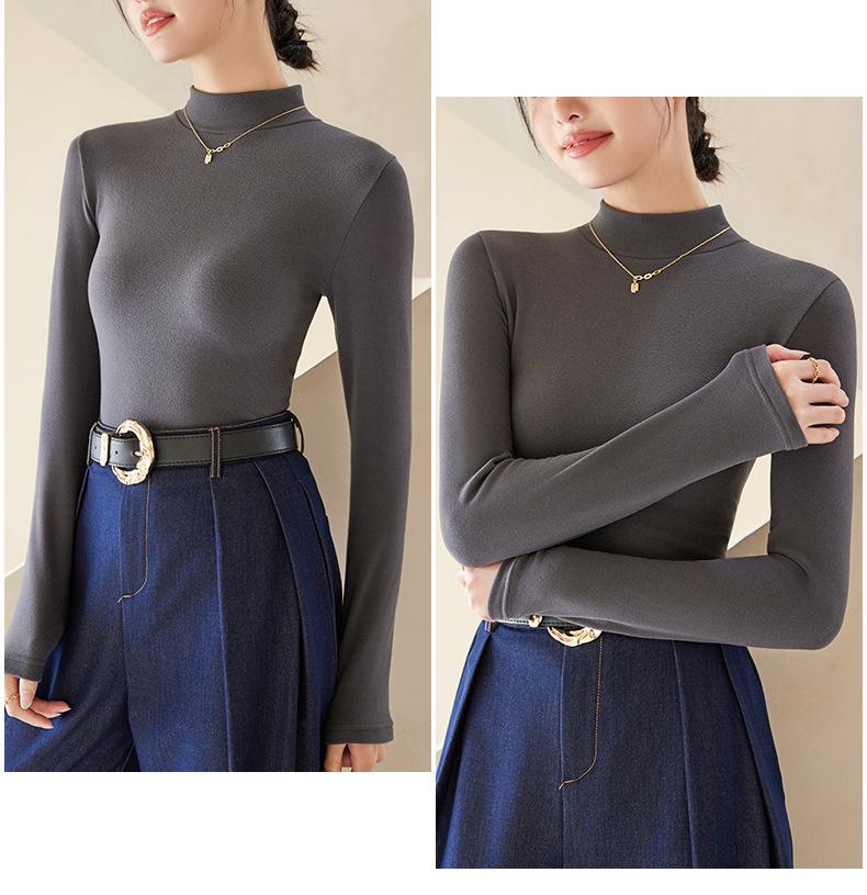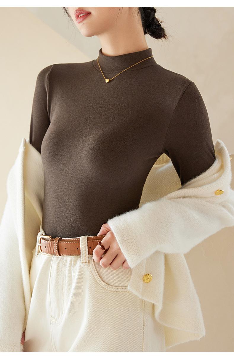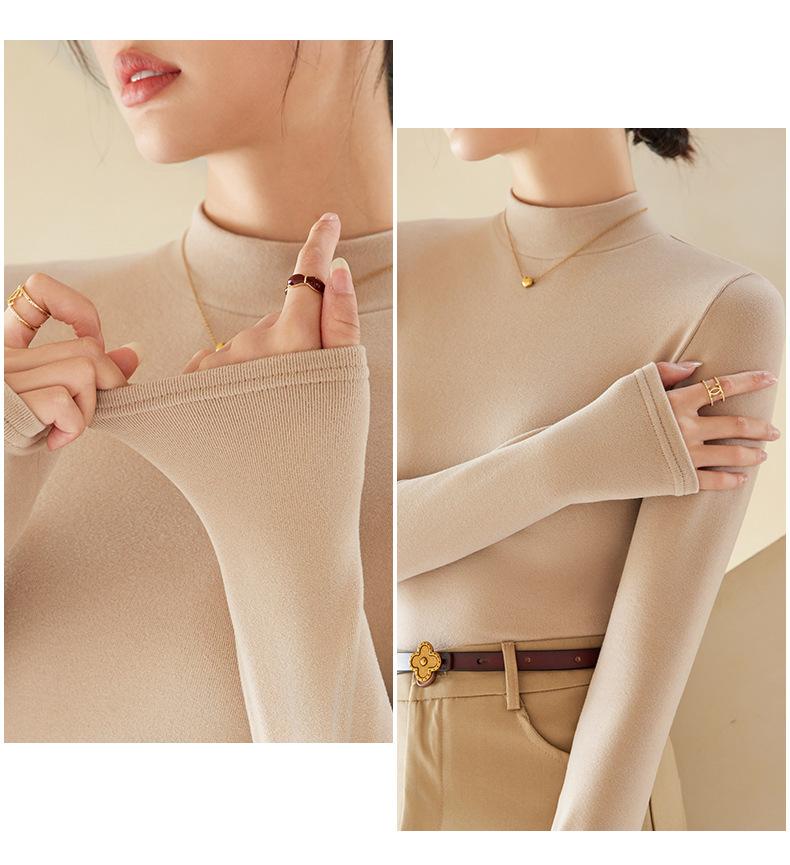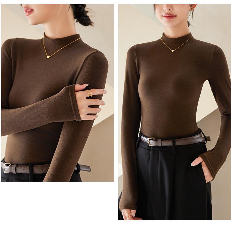 Camiseta Básica de Terciopelo con Cuello Mock para Mujer Otoño e Invierno Nueva Camiseta de Punto Cepillada de Doble Cara con Forro Polar Top Grueso de Manga Larga
