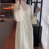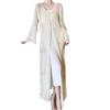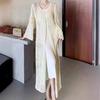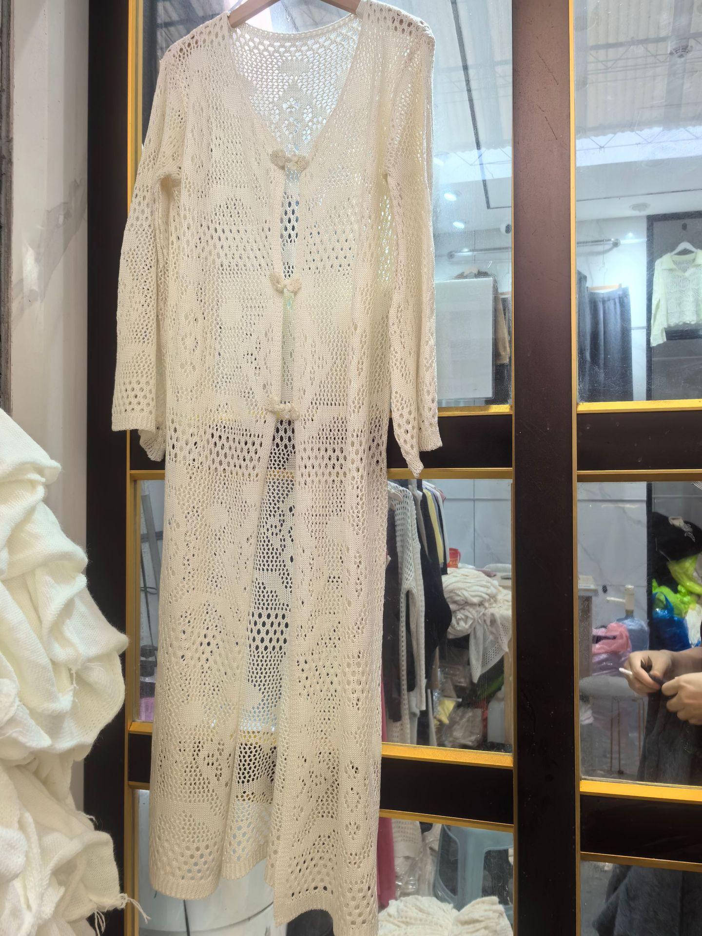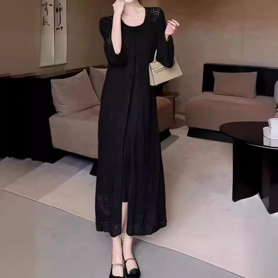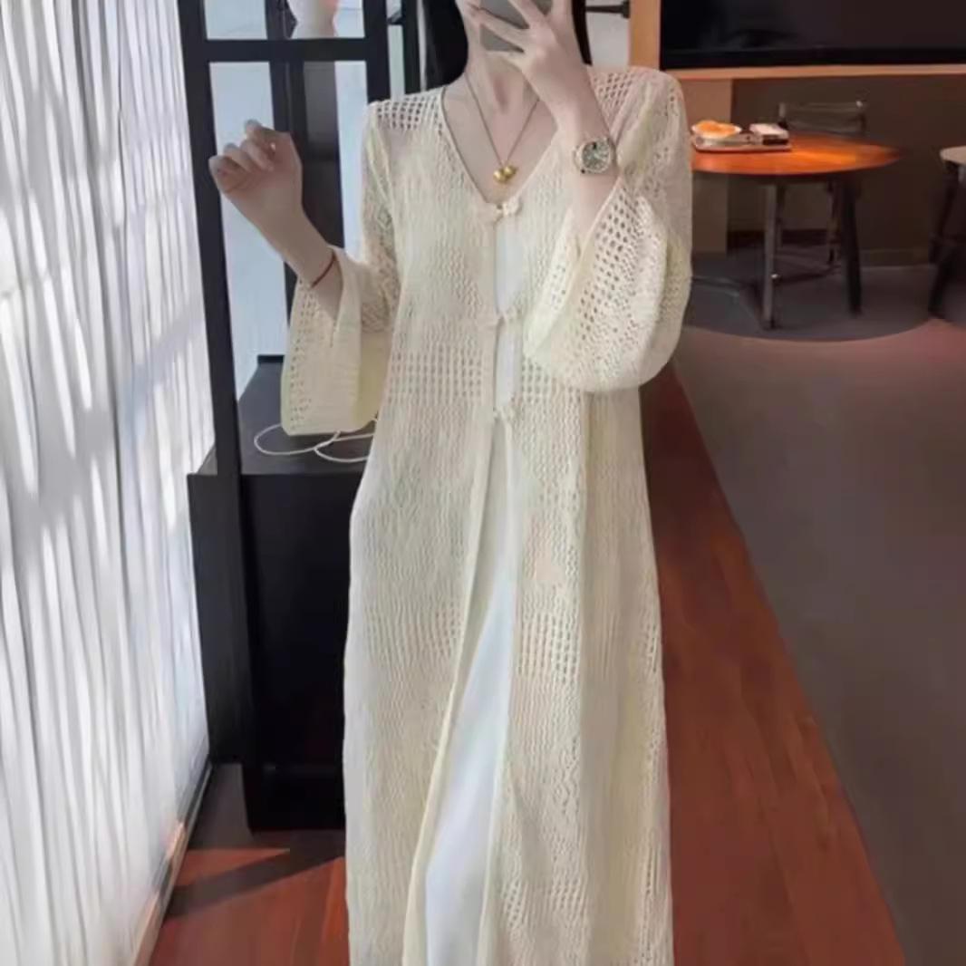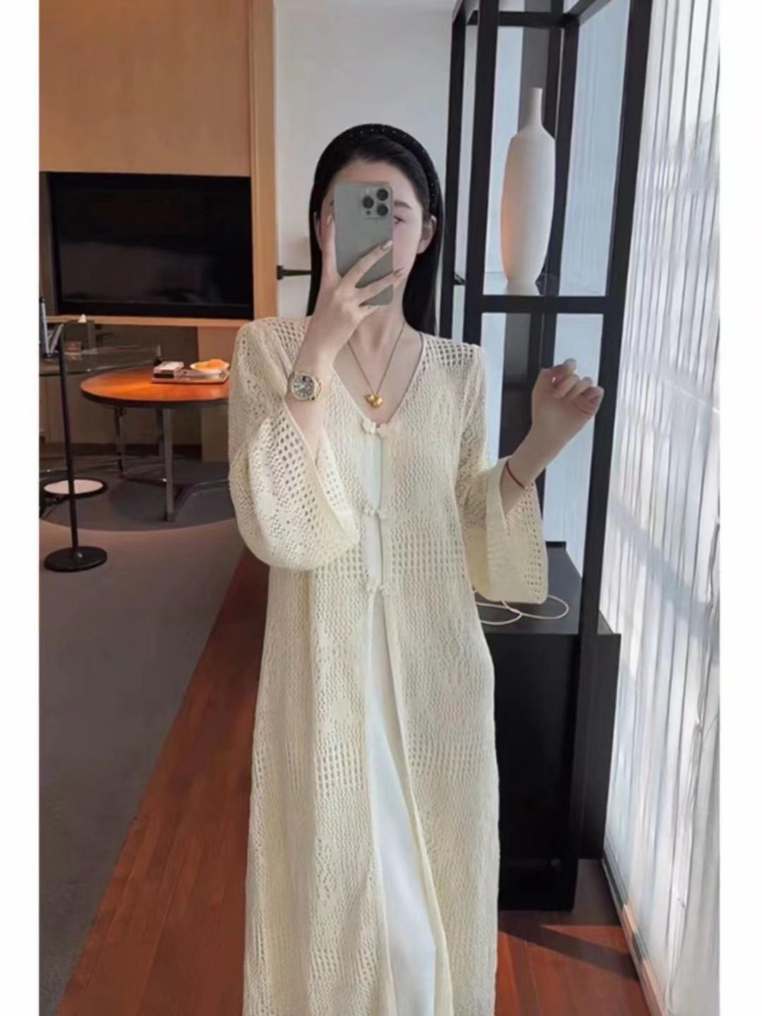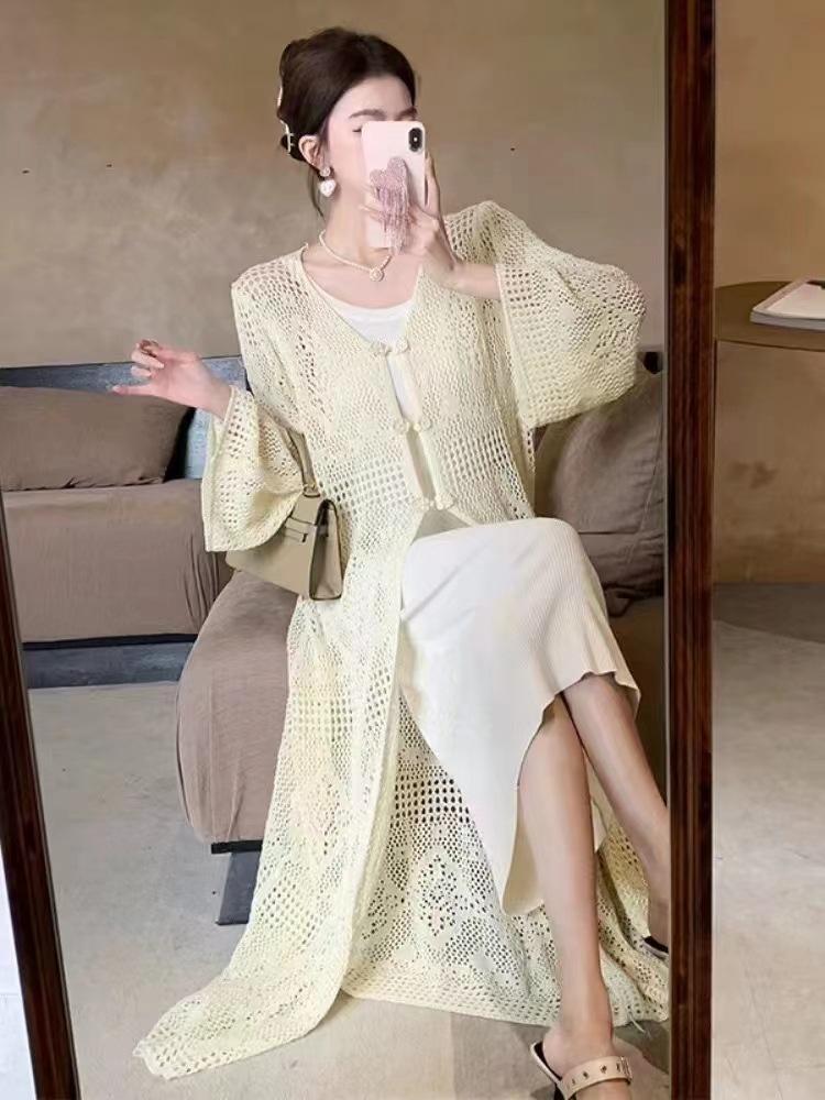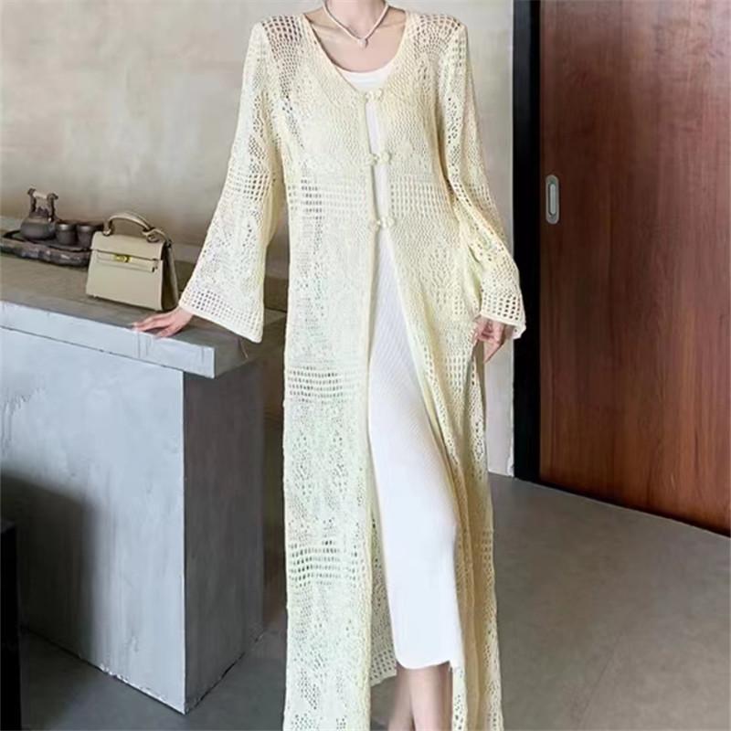 Chaqueta larga de punto con hebilla de Guofeng, de crochet hueco, estilo suave y elegante, fina y holgada, para verano