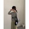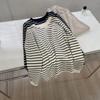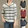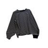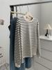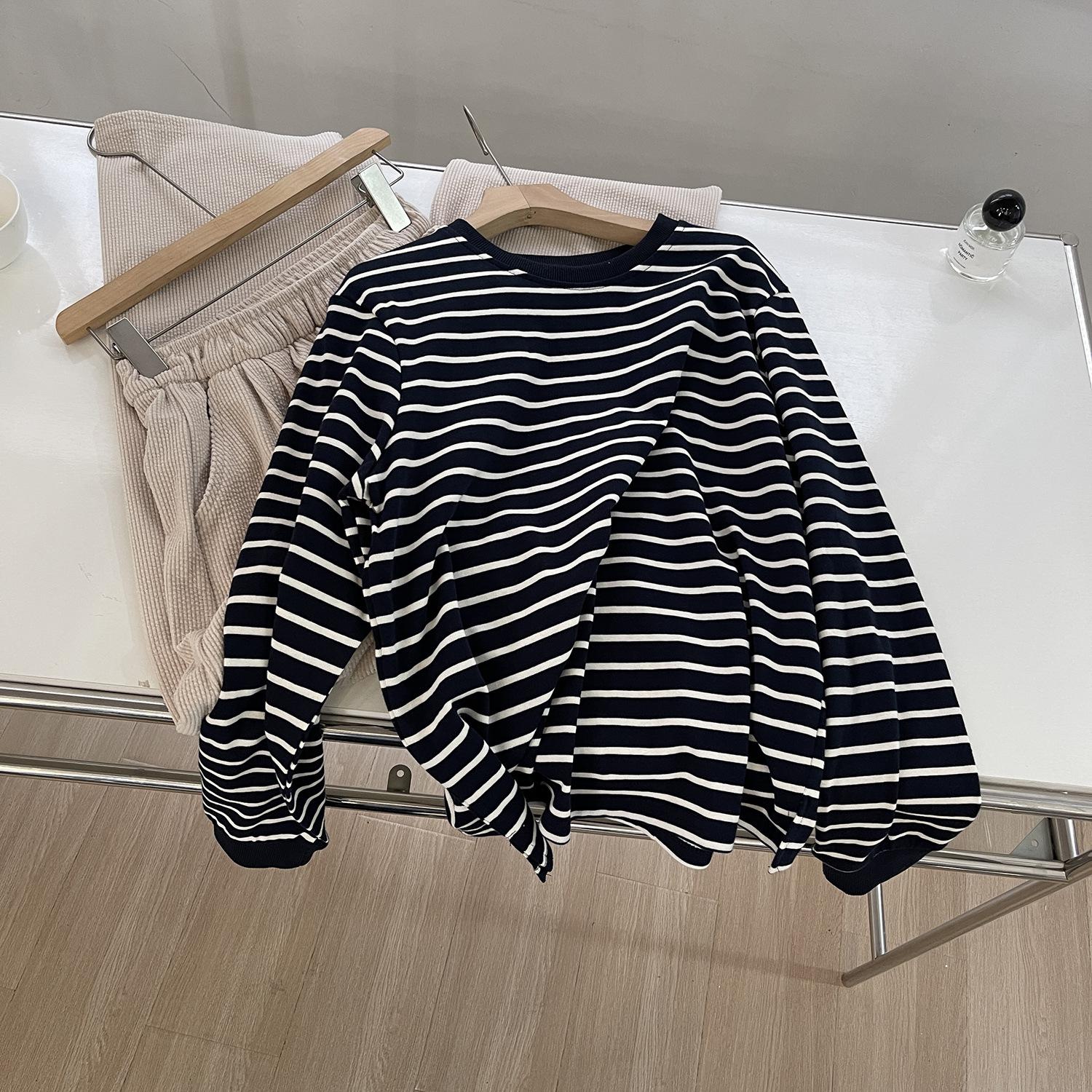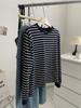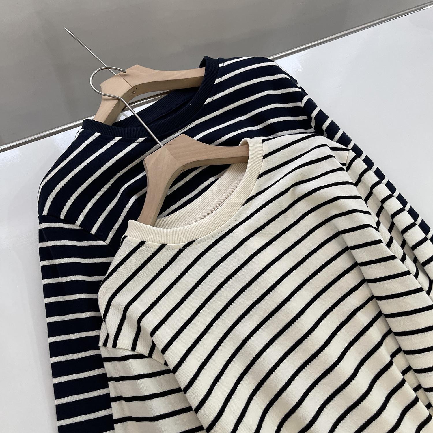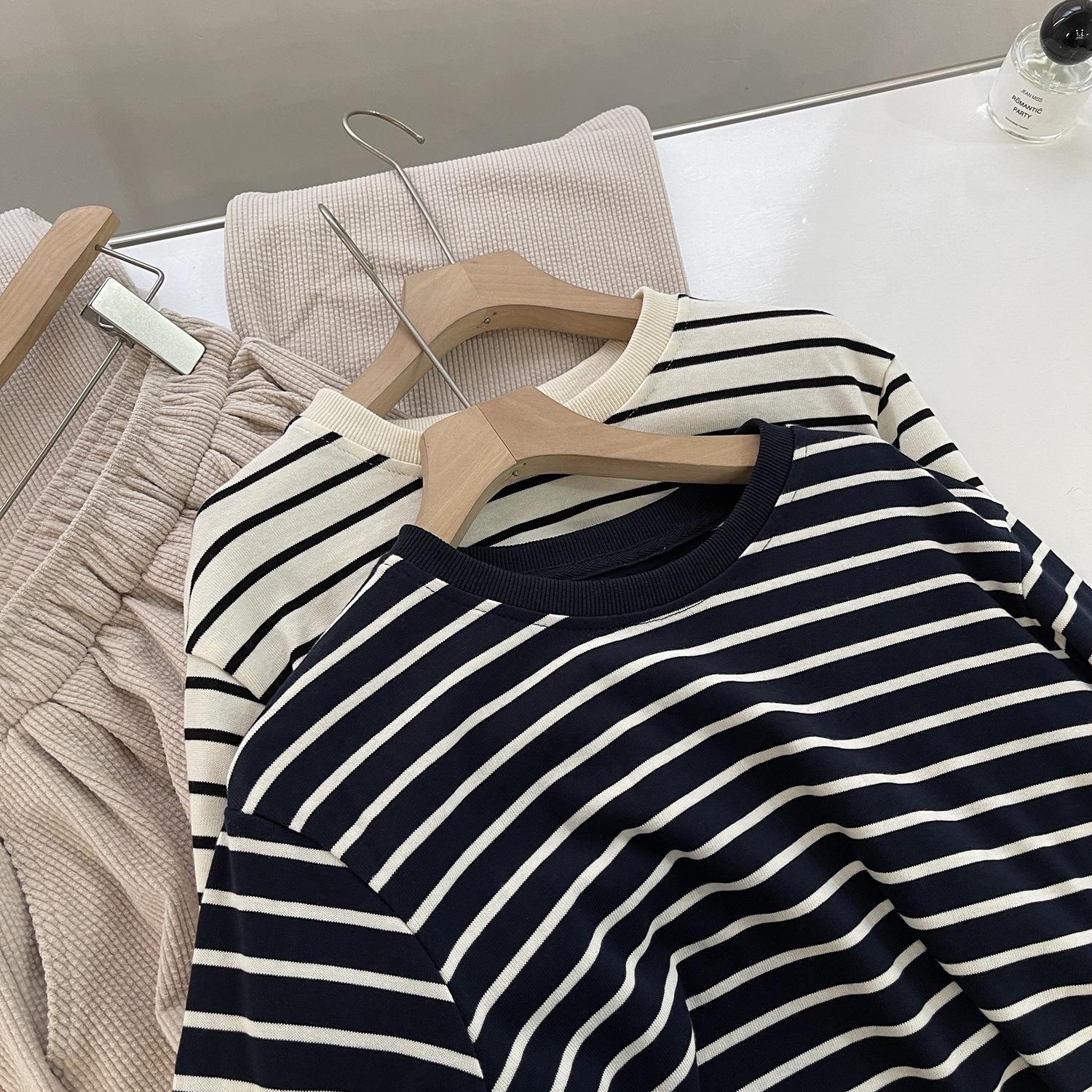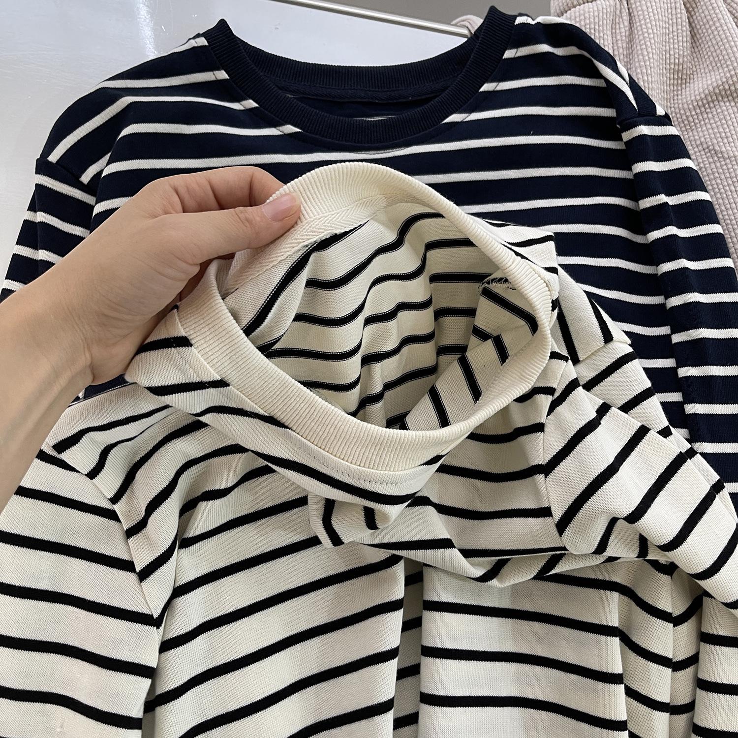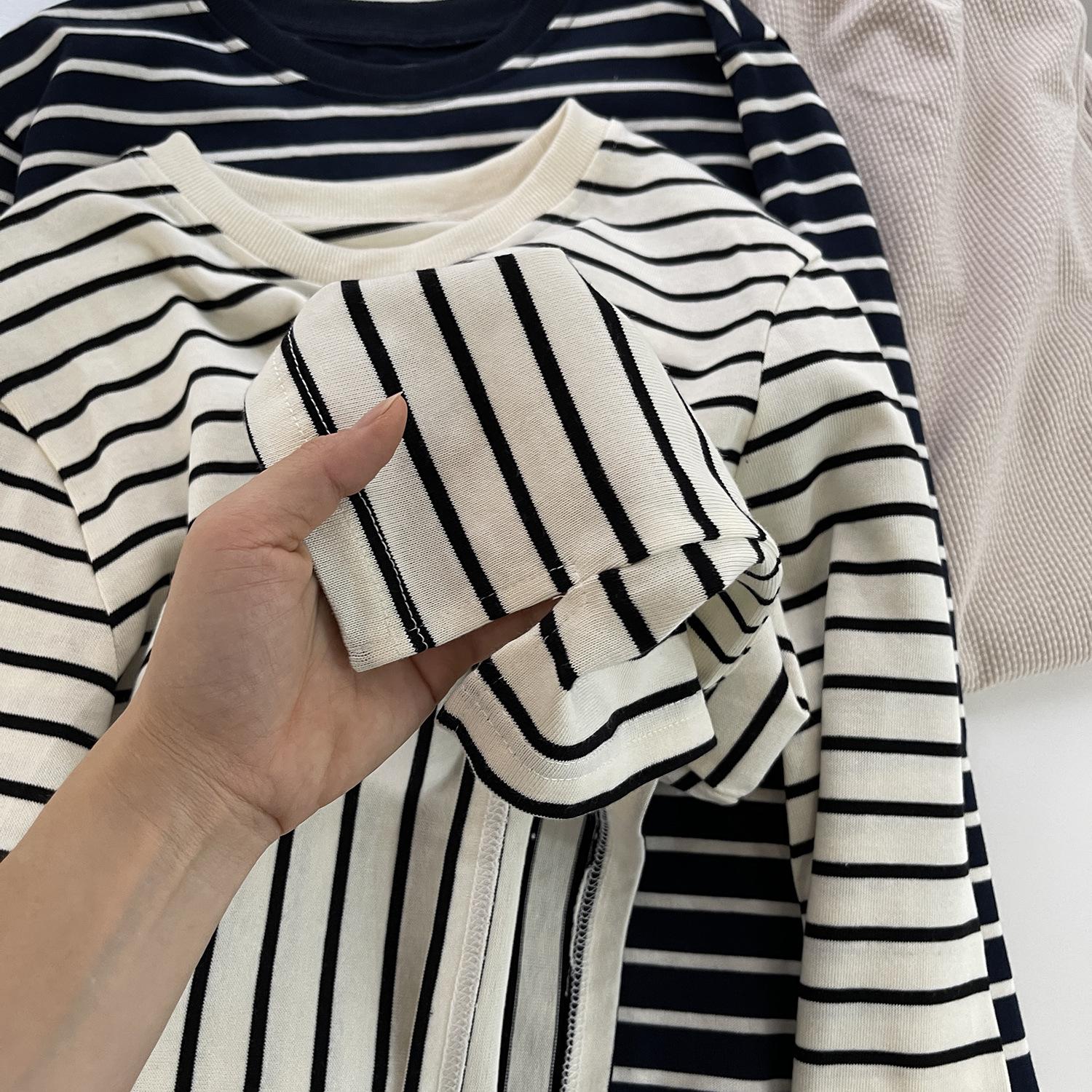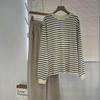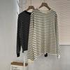 Camiseta de manga larga de algodón de doble hilo a rayas estilo coreano para mujer, holgada, informal, adelgazante, combinable con todo, con abertura lateral y cuello redondo, para otoño e invierno.