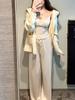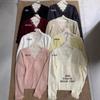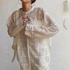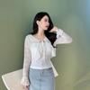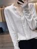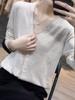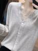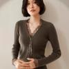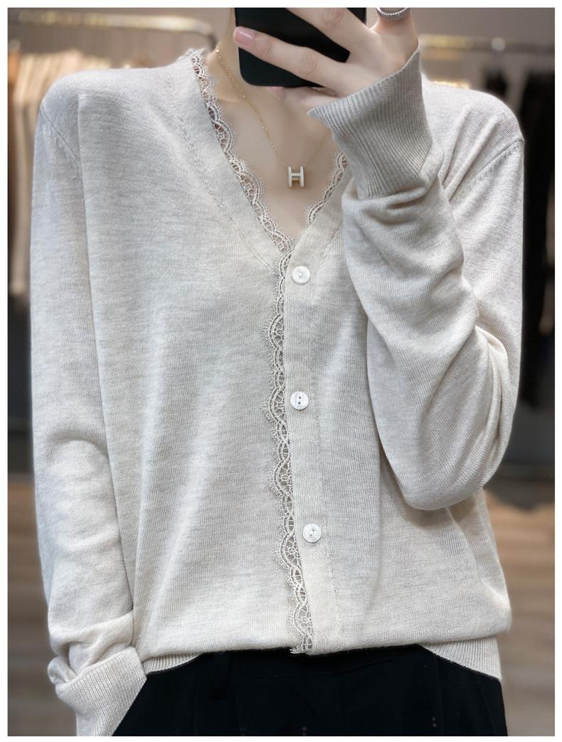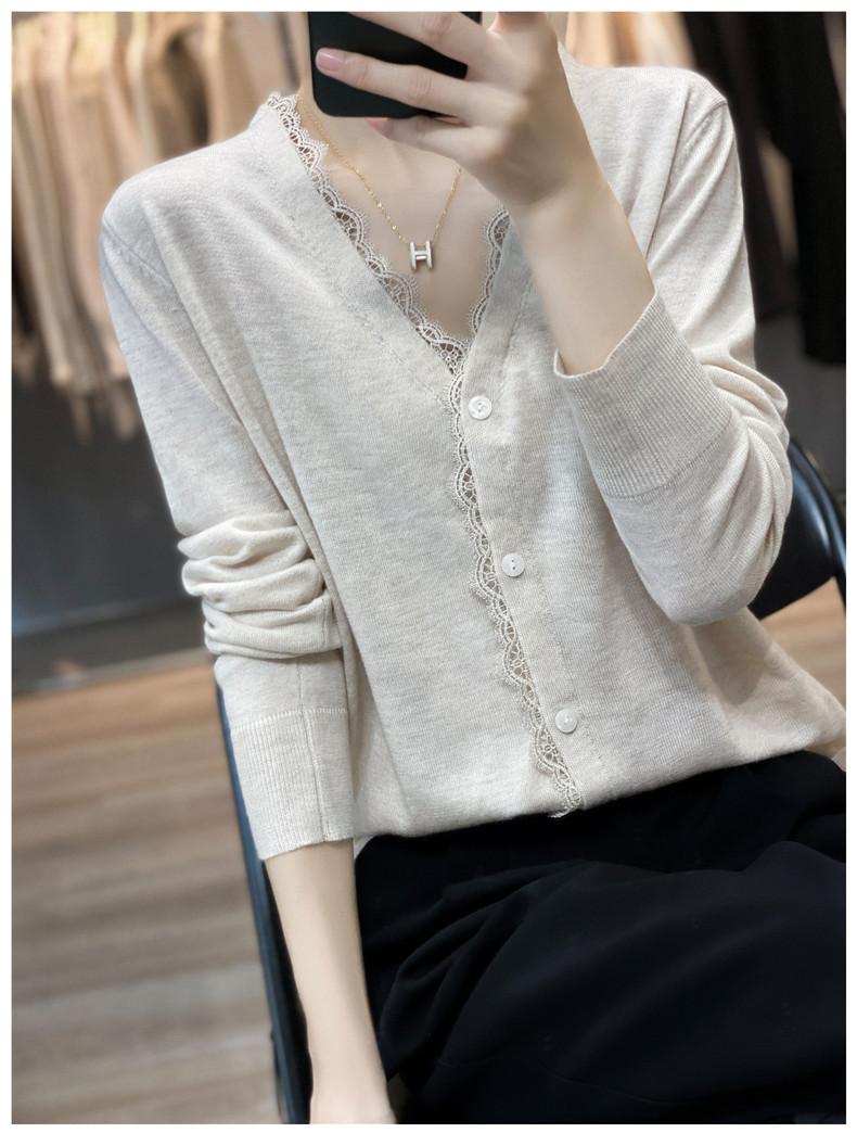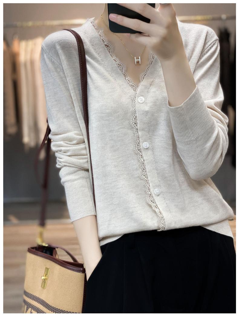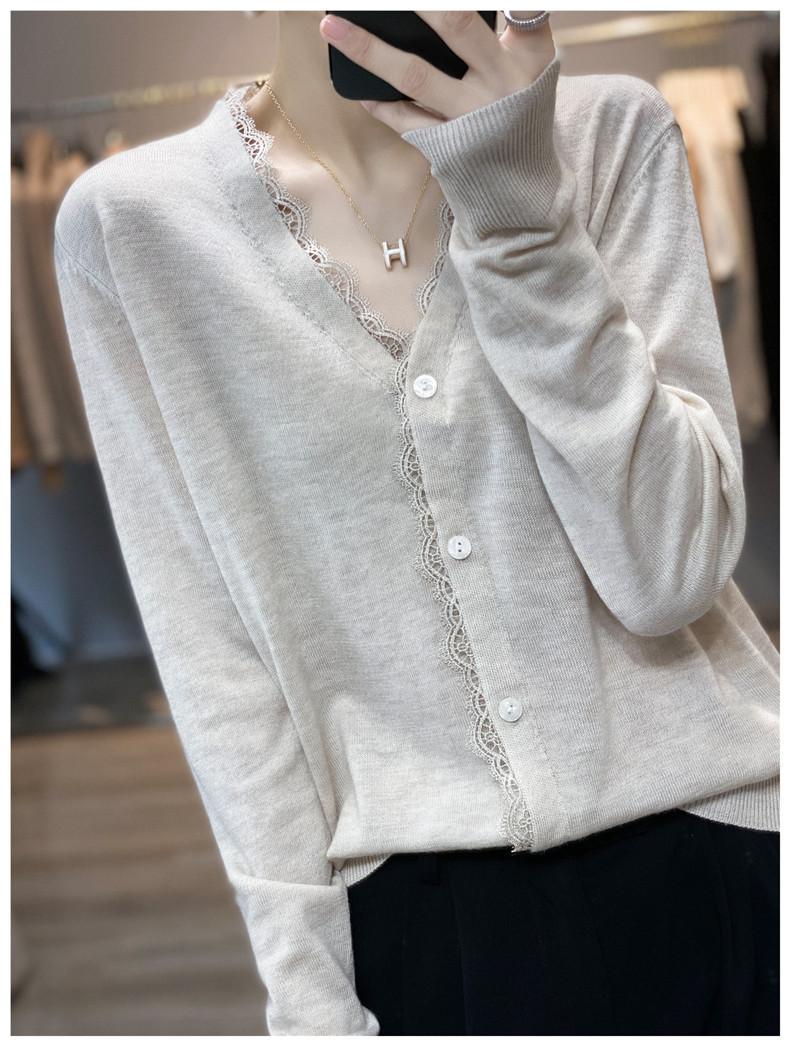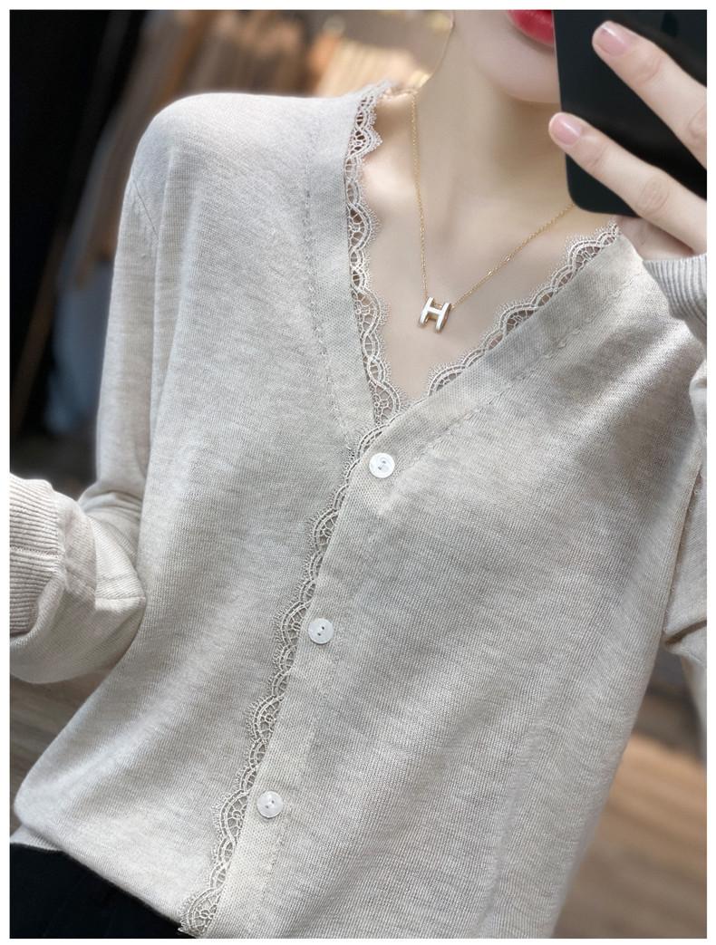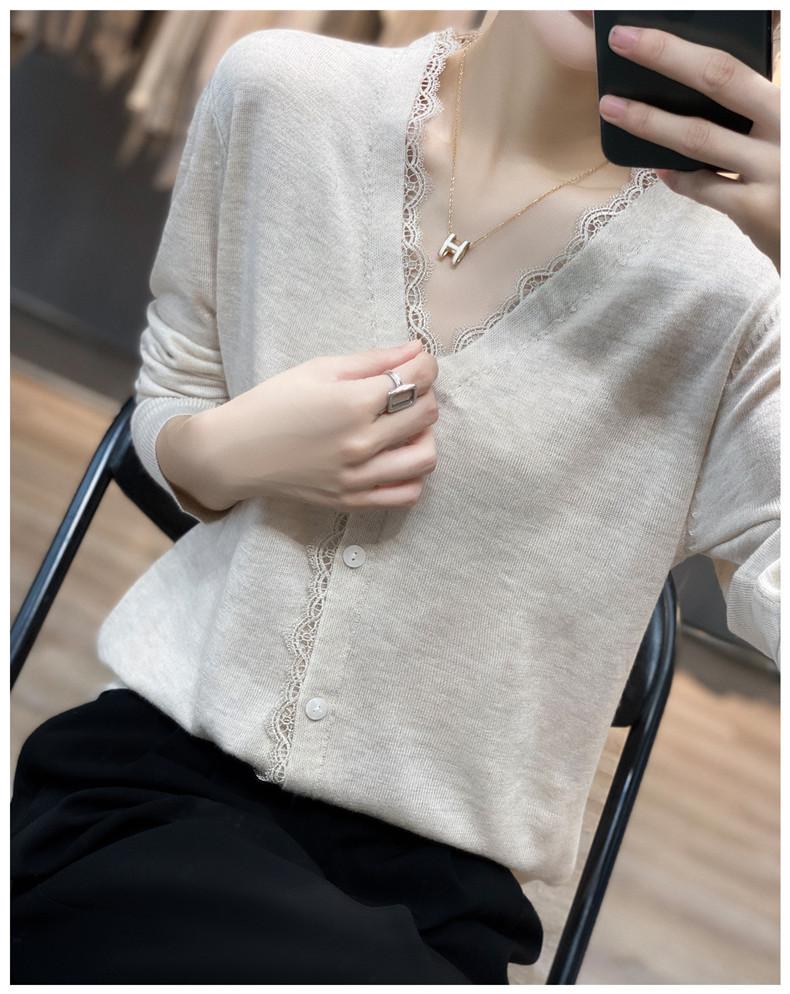 Cárdigan de punto holgado e informal para mujer, con escote en V y ribete de encaje francés, hebilla de color liso, hilo hilado, combinable con todo.
