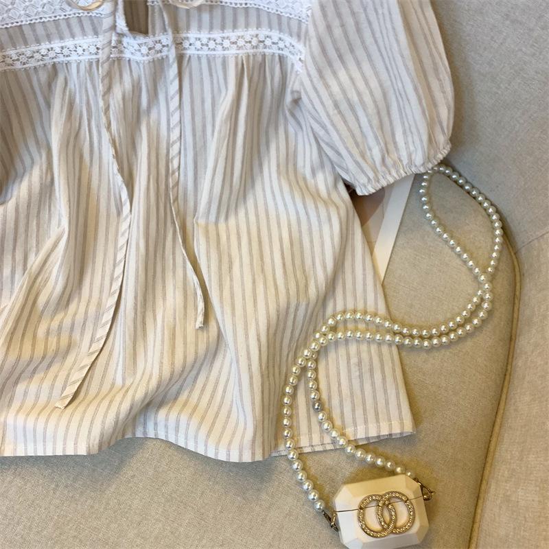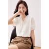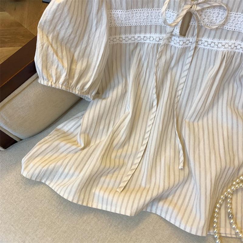 Foto real de la nueva camisa de moda de diseño hueco francés para mujer para el verano 2024 con mangas abullonadas delgadas tops de camisa