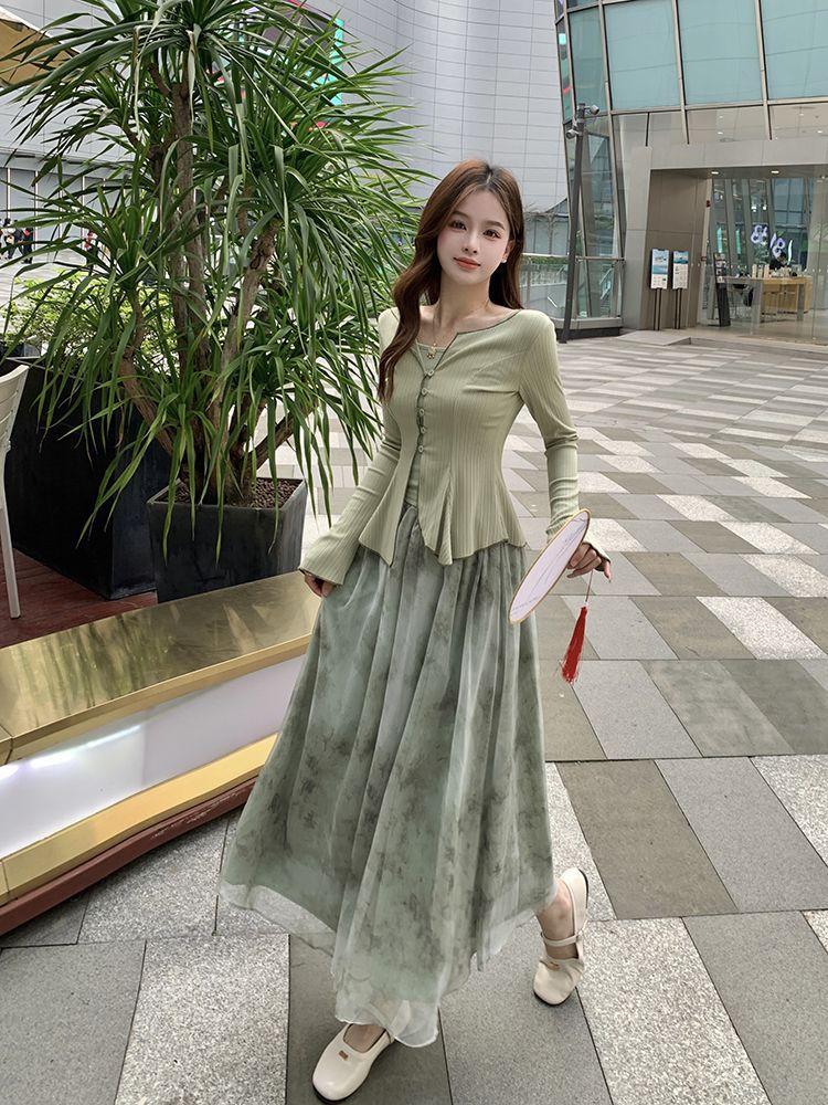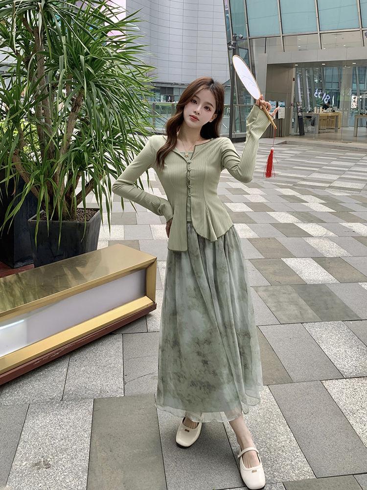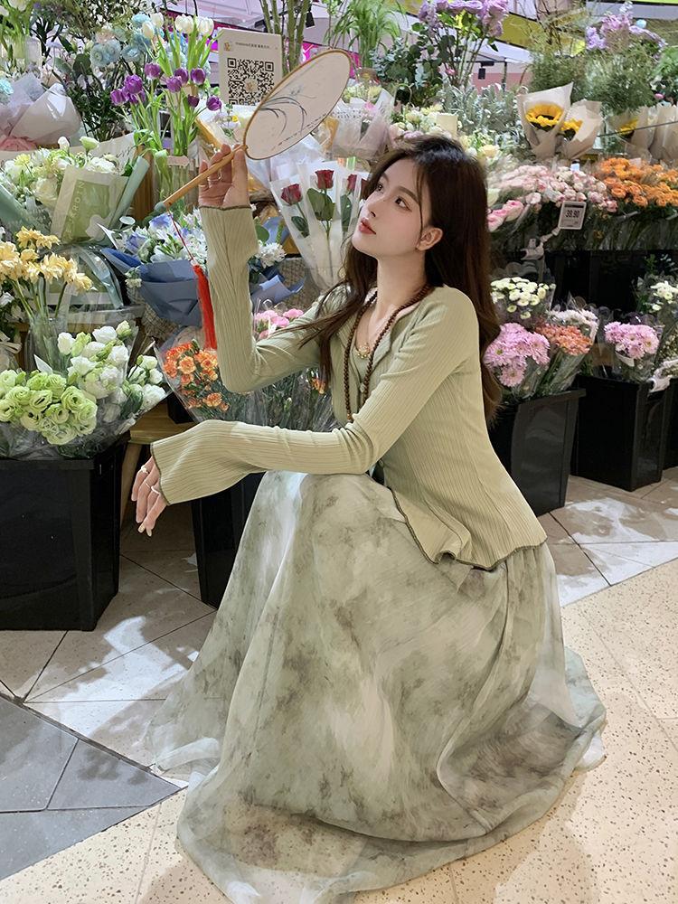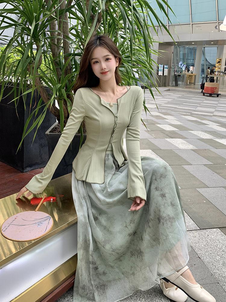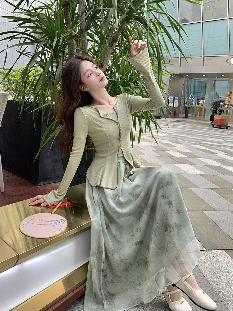 Green sling, Green cardigan, Green skirt, Green suspenders + green cardigan [two-piece set], Green skirt + gre...