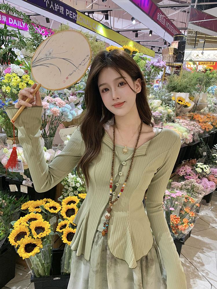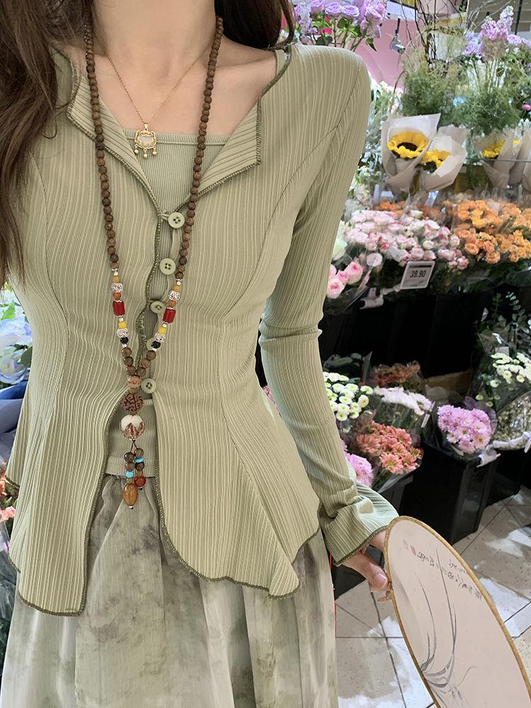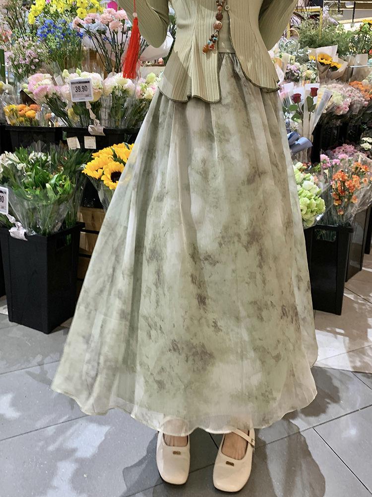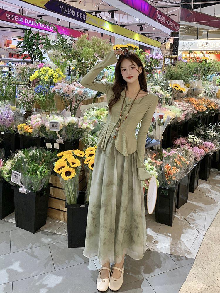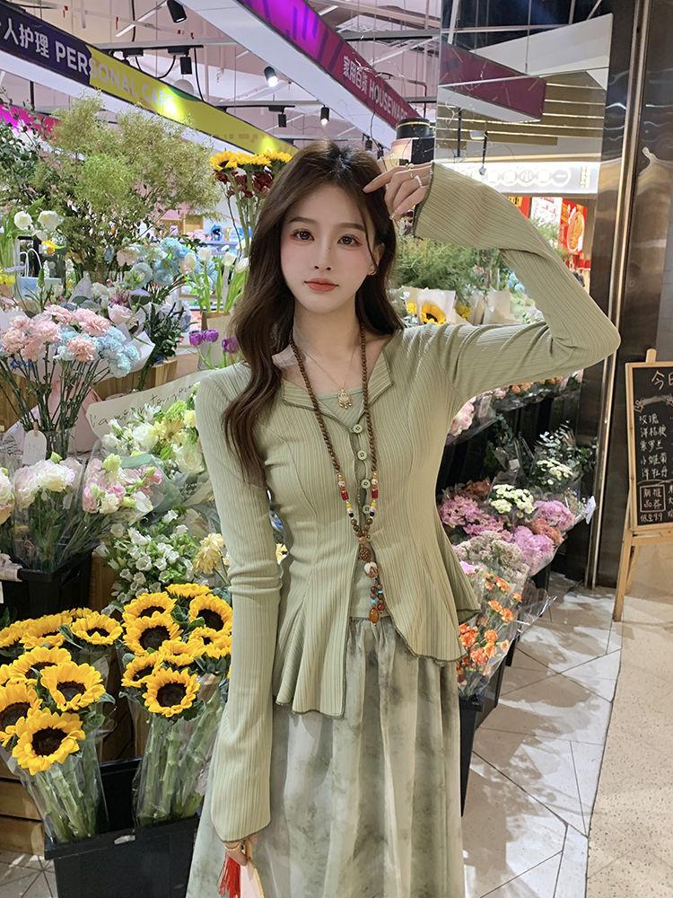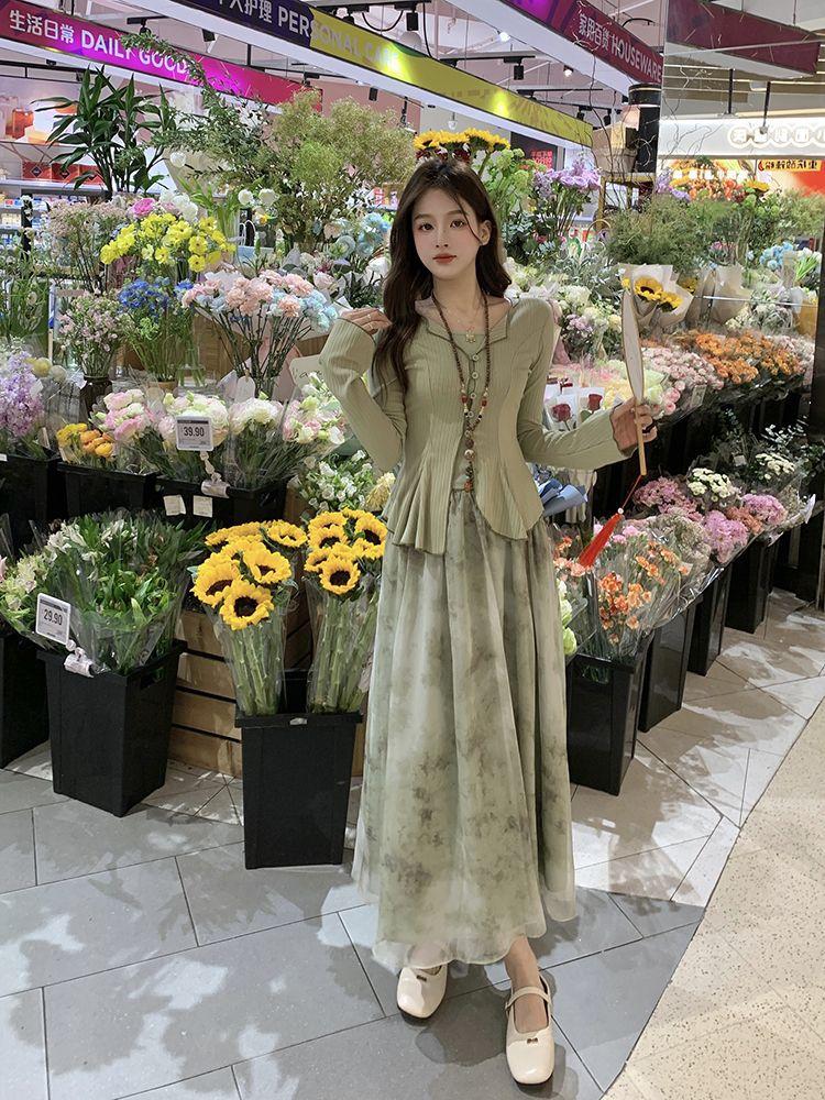 Green sling, Green cardigan, Green skirt, Green suspenders + green cardigan [two-piece set], Green skirt + gre...