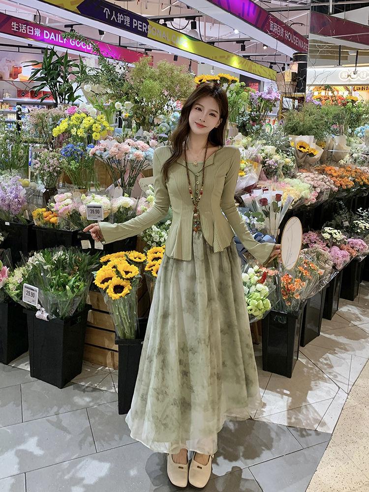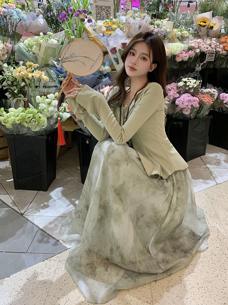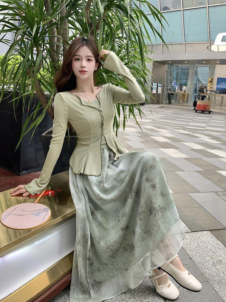 Nuevo Cárdigan Chinoiserie Fino de Manga Larga para Protección Solar + Tirantes + Falda Floral para Mujer Primavera 2025 Nuevo Traje de Moda