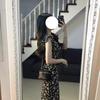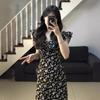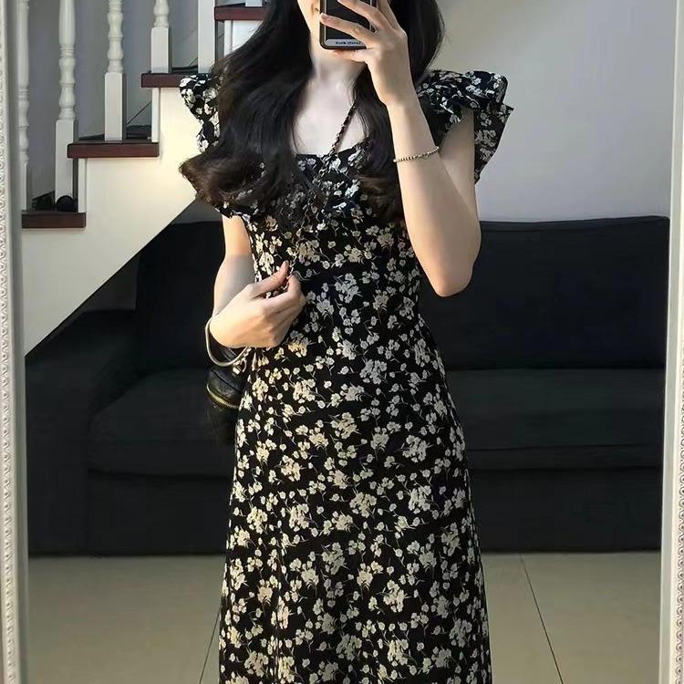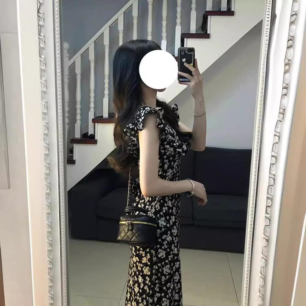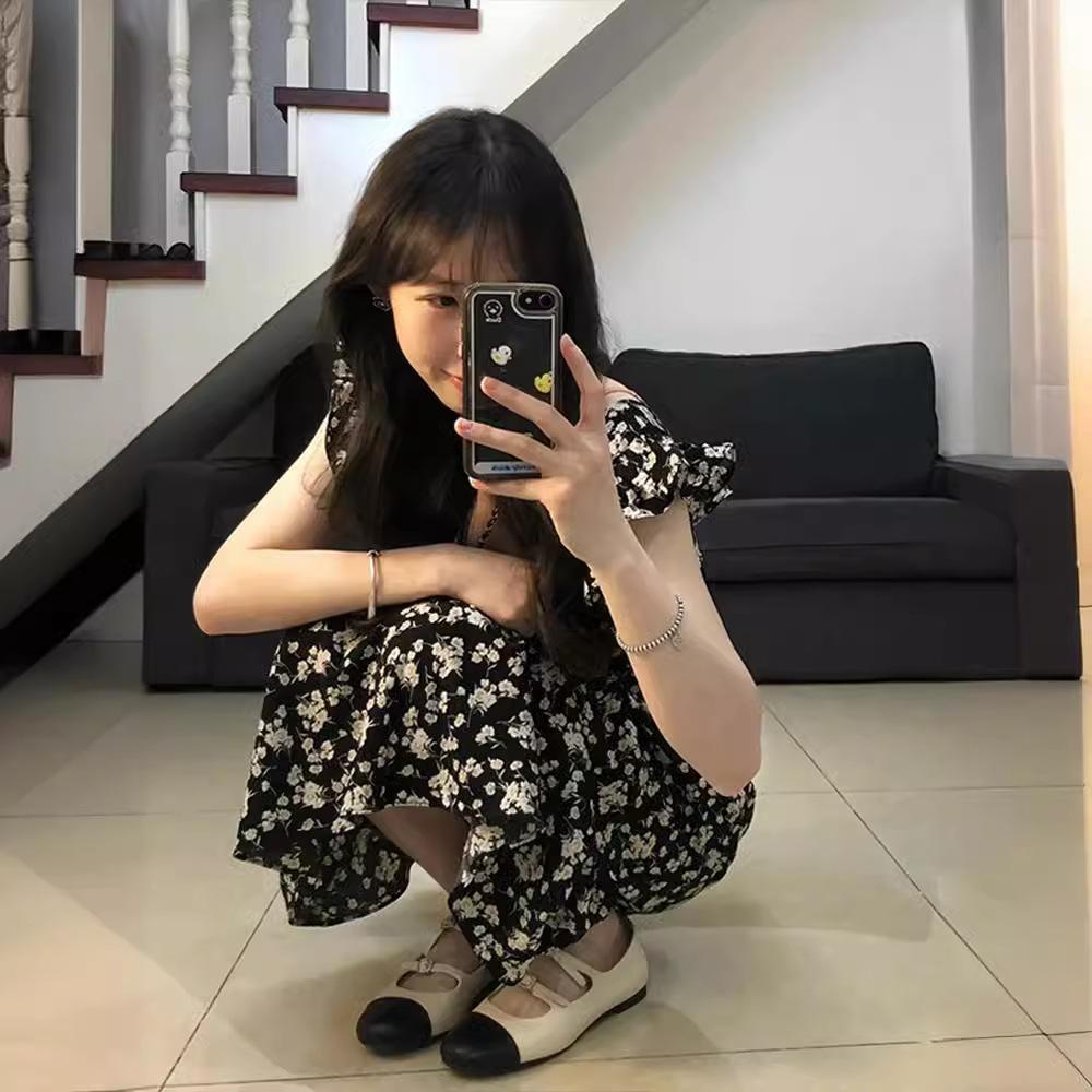 Vestido Floral Negro Estilo Hepburn Francés para la Hora del Té para Mujer Verano 2025 Nuevo Elegante Cintura Falda Larga para Mujer