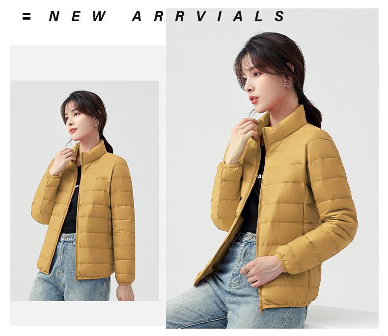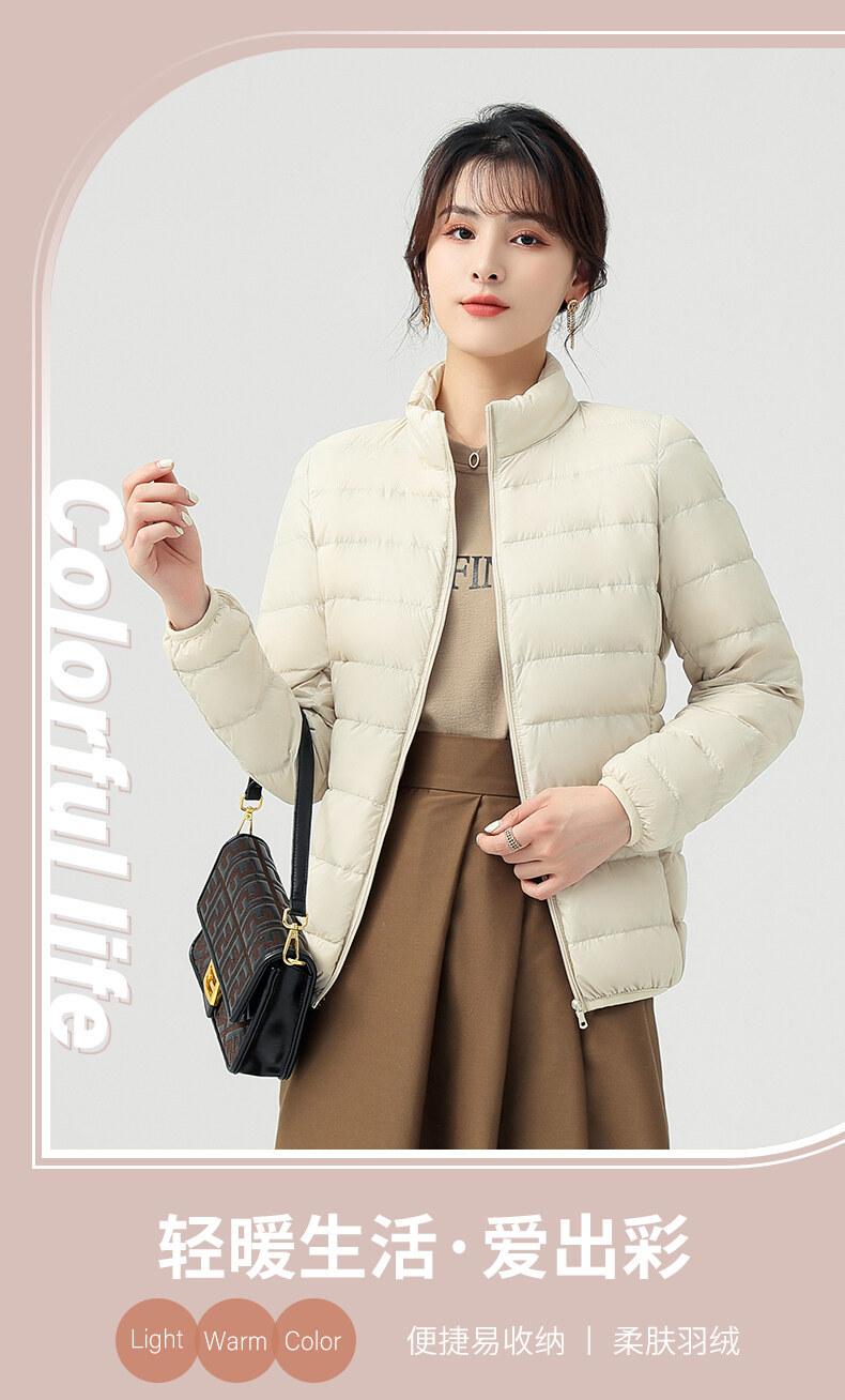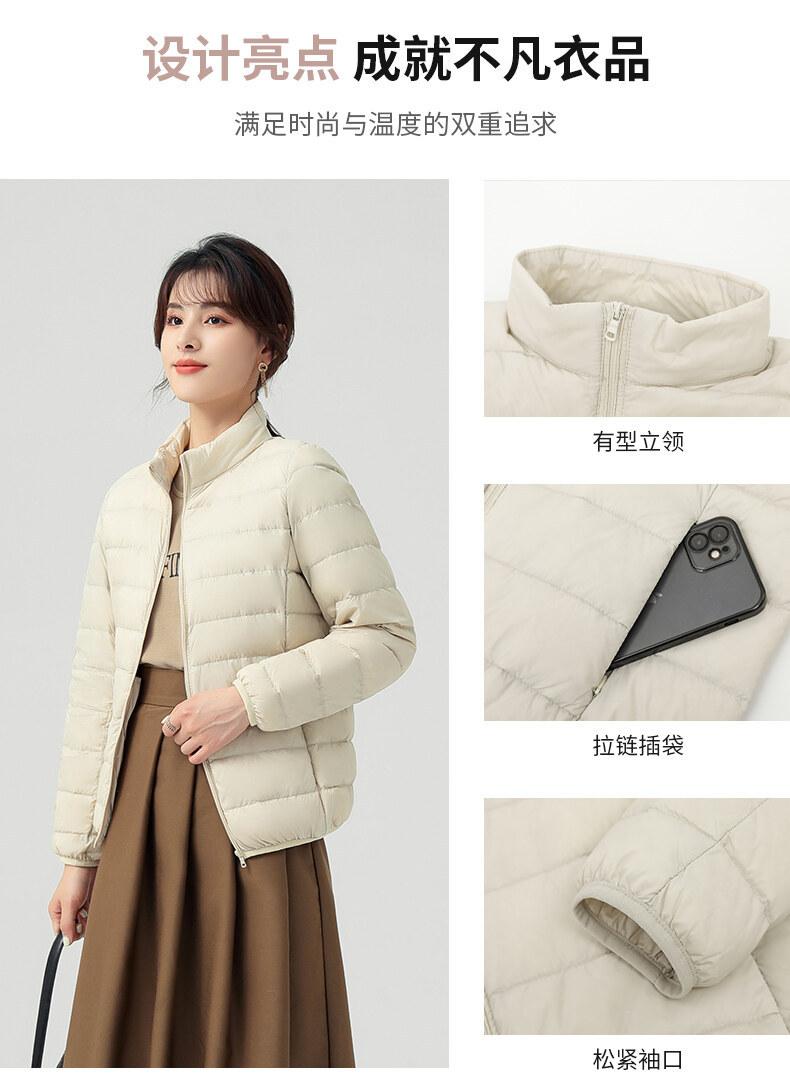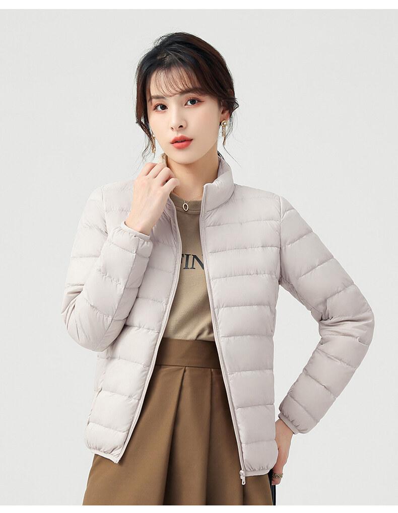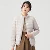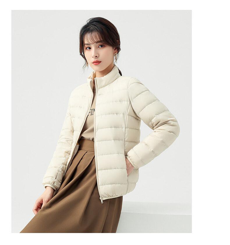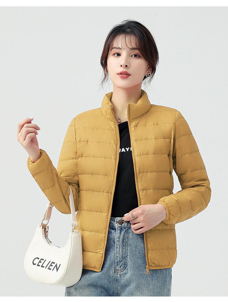 Chaqueta ligera de plumón para primavera y otoño, cálida, nueva, 2023, para mujer, cuello redondo corto, corte ajustado, color camello.