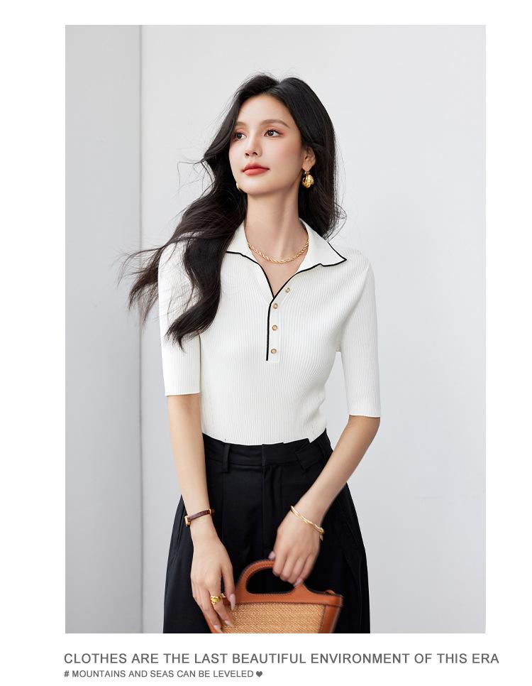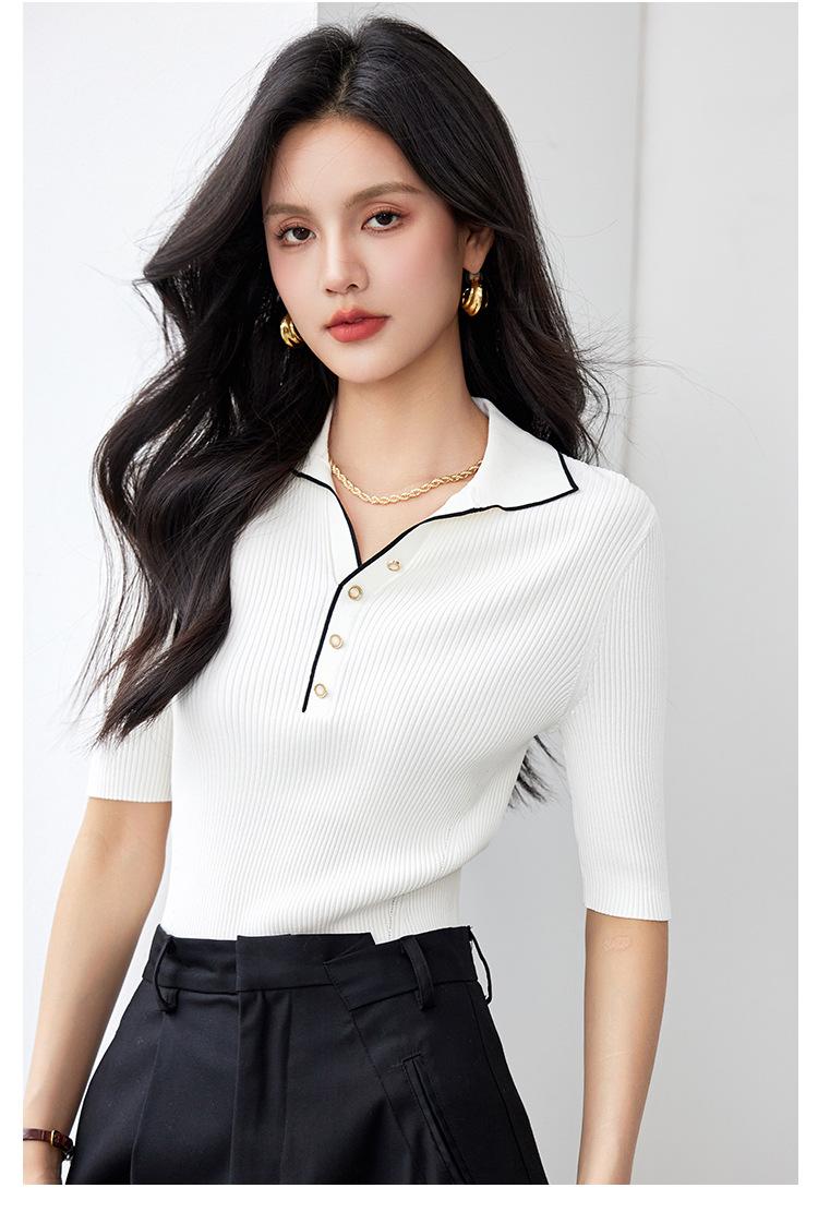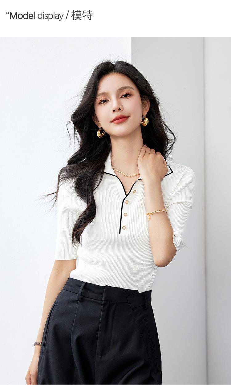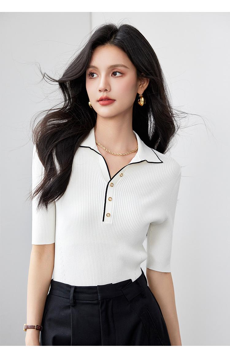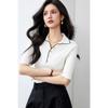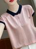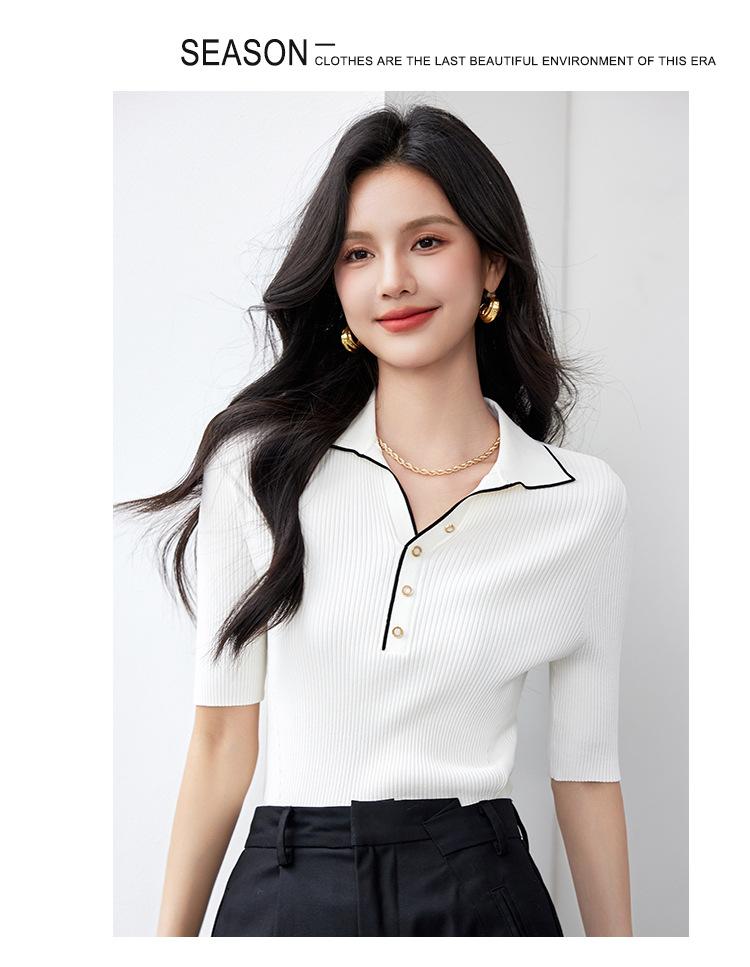 Suéter de verano de manga corta con solapa vertical y combinación de colores para mujer, top adelgazante estilo francés, polo estilo americano