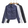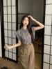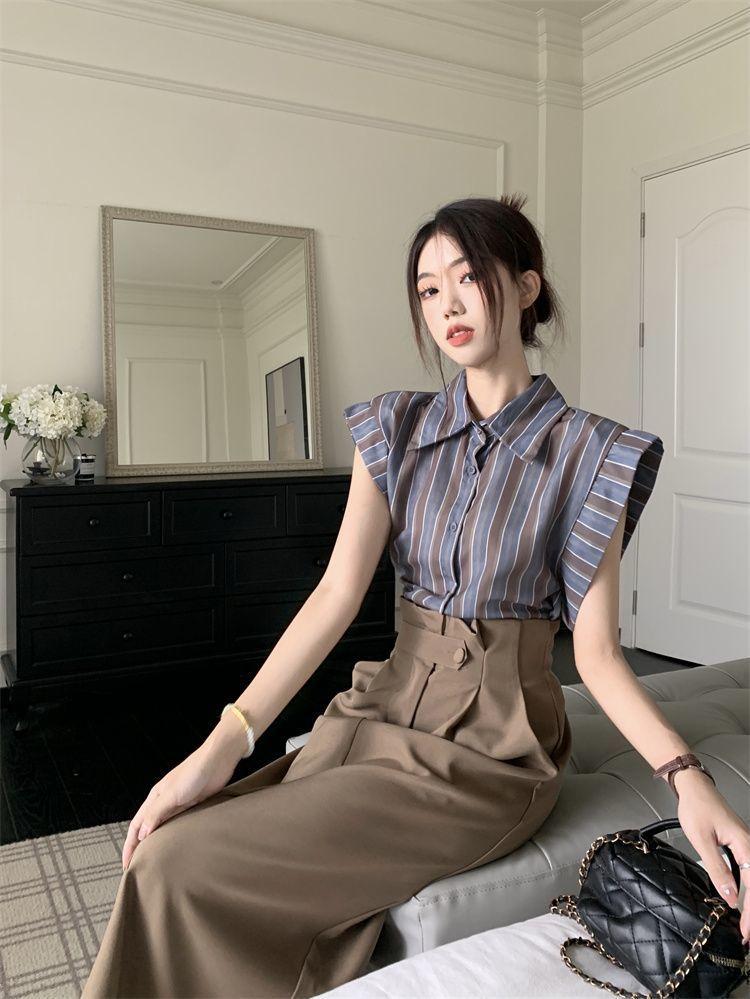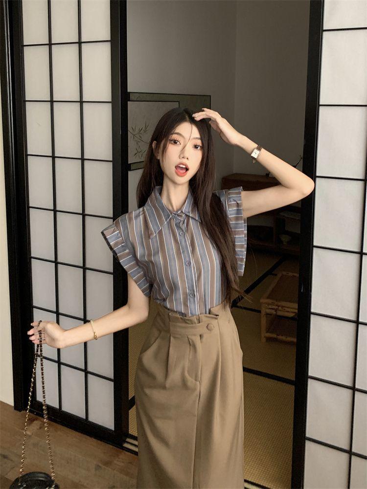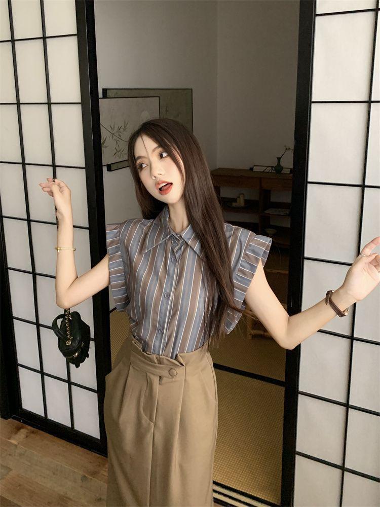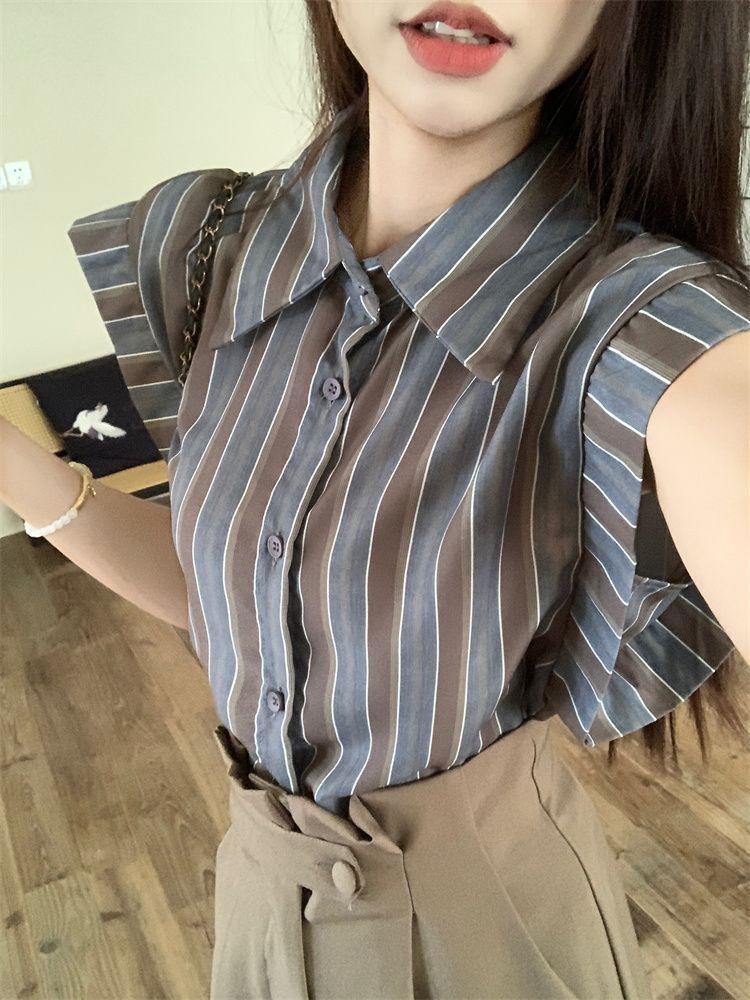 Camisa de cuello POLO a rayas vintage con mangas voladoras para mujer, top holgado y adelgazante de verano, traje de moda