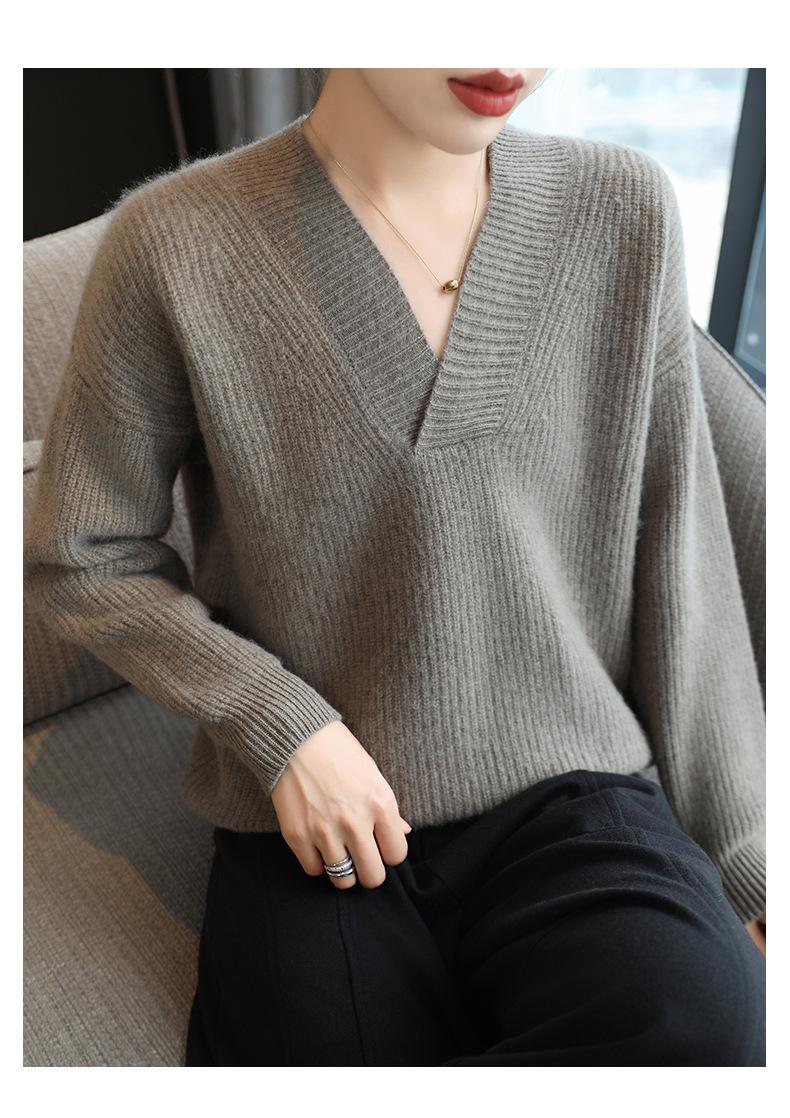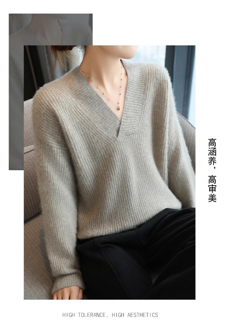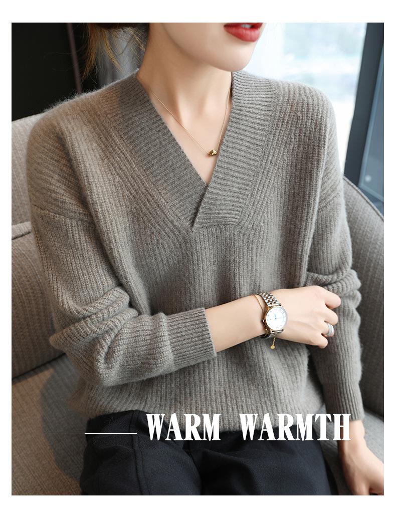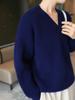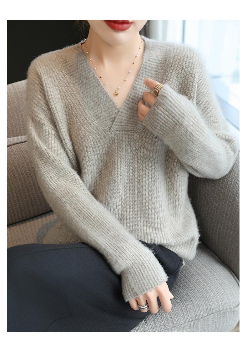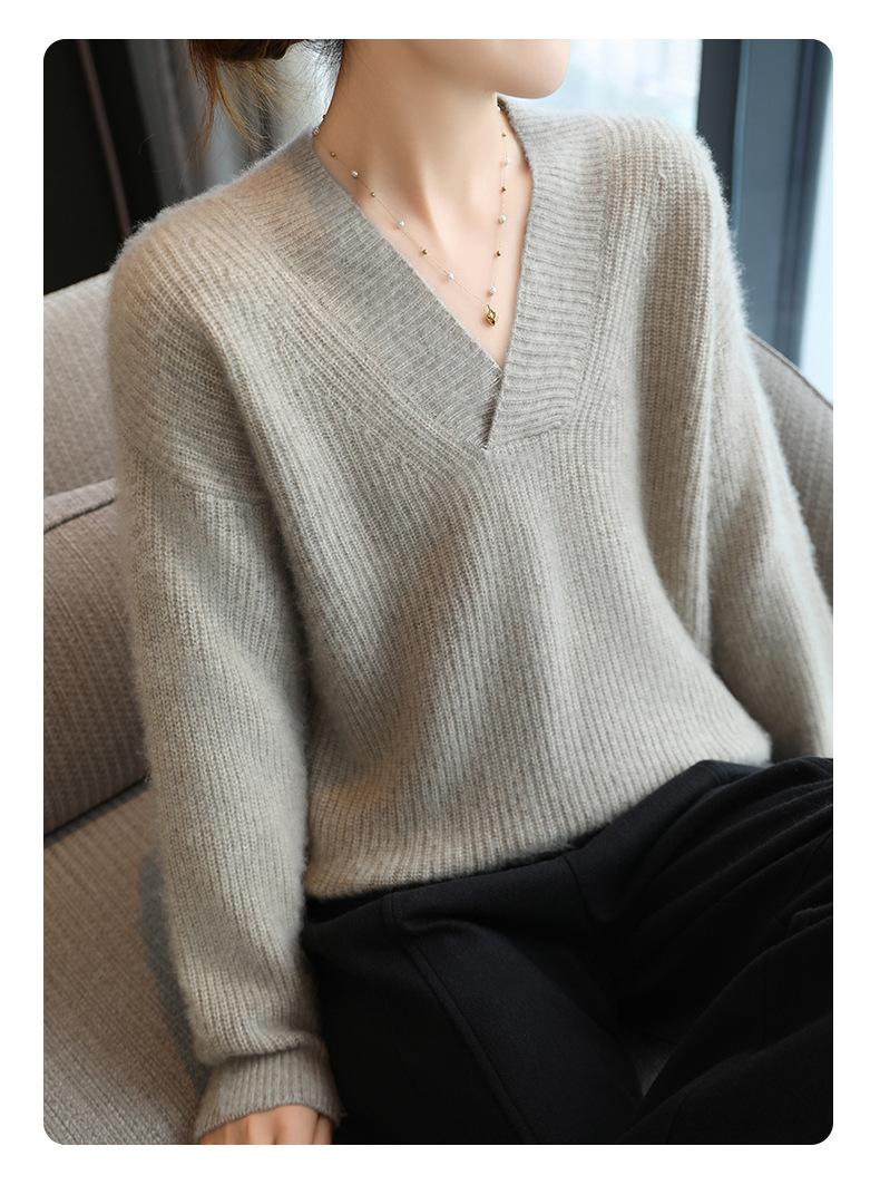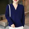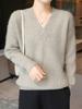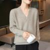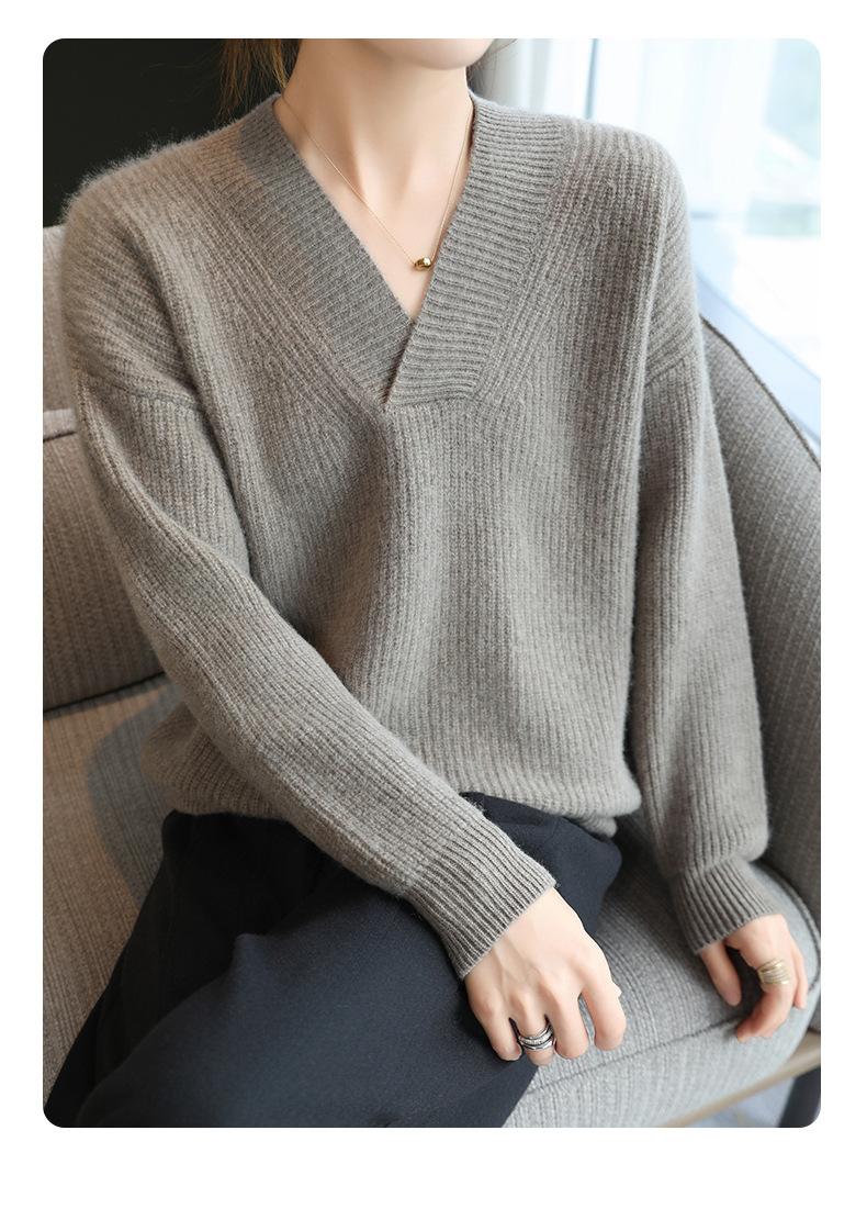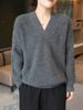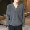 Suéter holgado de punto de lana pura con cuello en V y manga larga, elegante y holgado para mujer, nuevo estilo
