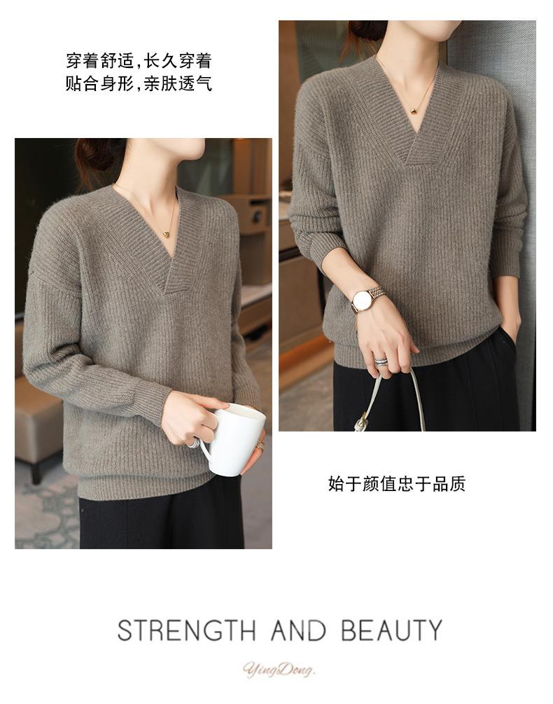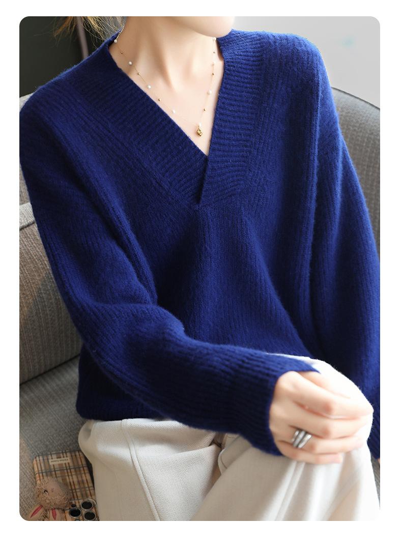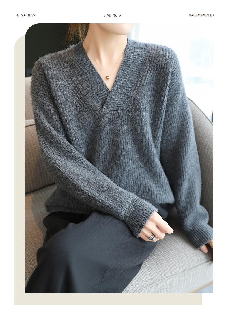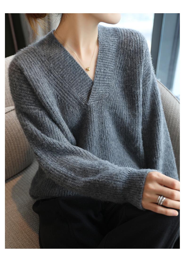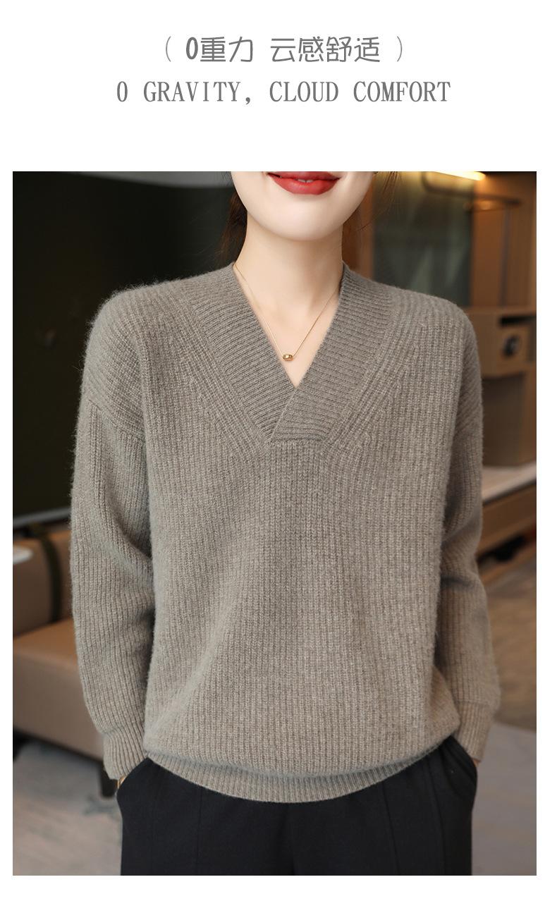 Suéter holgado de punto de lana pura con cuello en V y manga larga, elegante y holgado para mujer, nuevo estilo