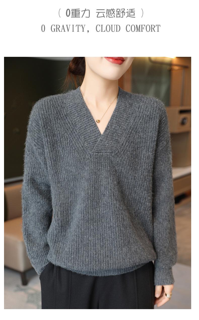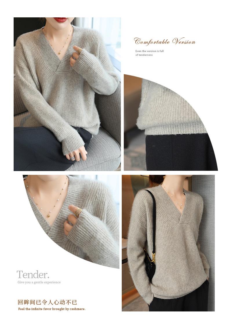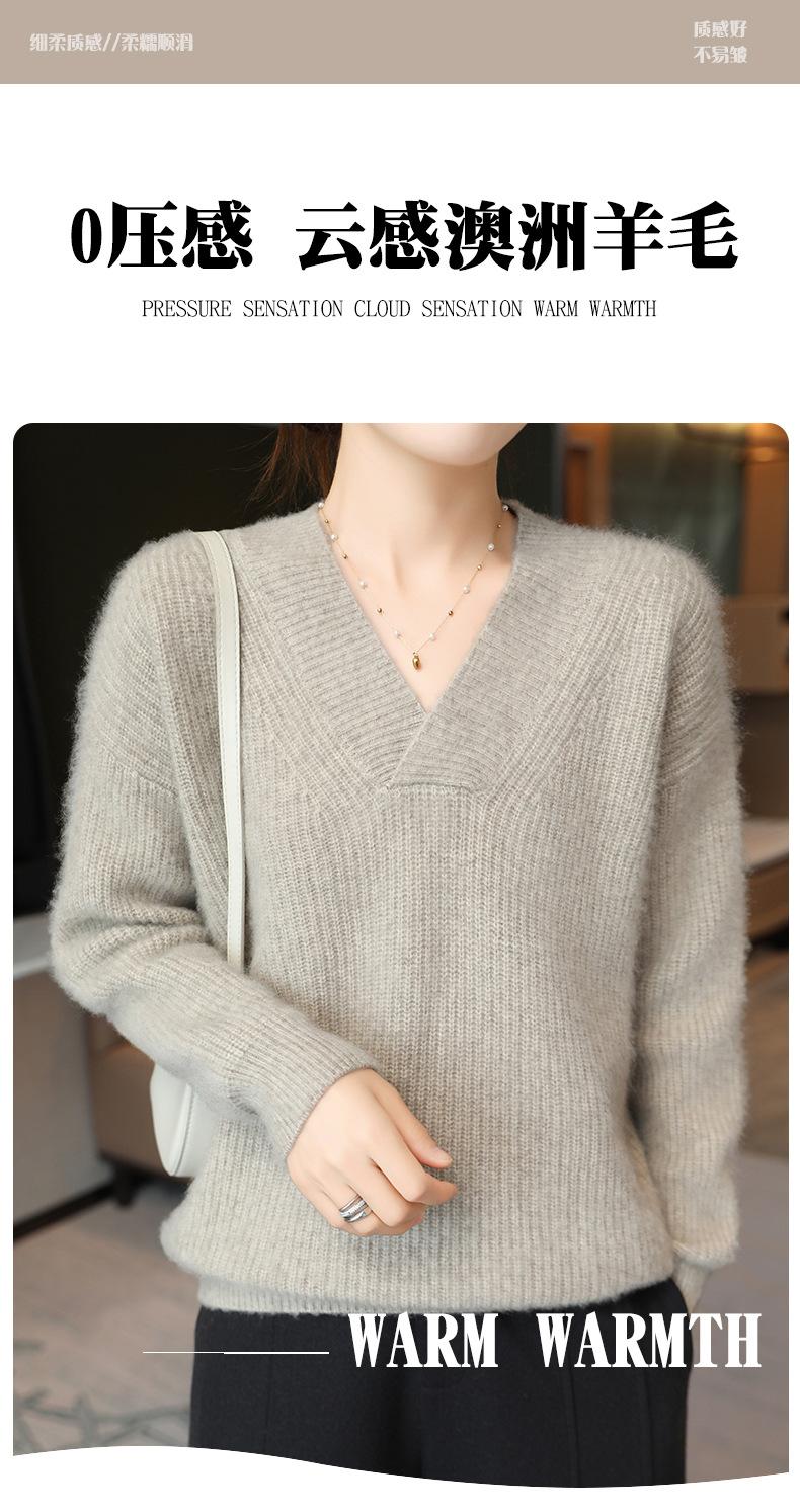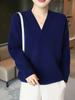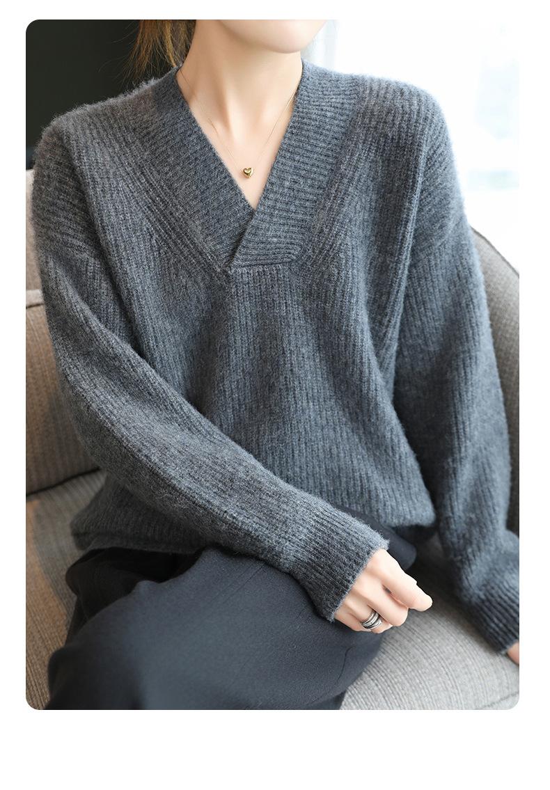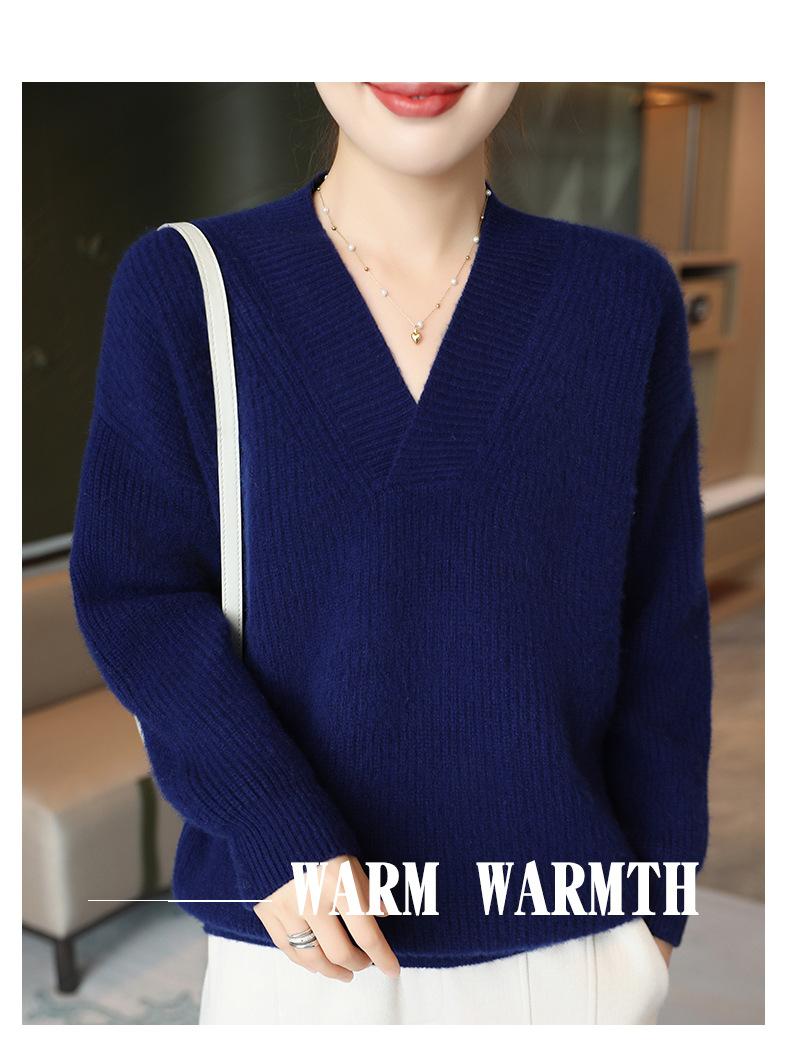 Suéter holgado de punto de lana pura con cuello en V y manga larga, elegante y holgado para mujer, nuevo estilo