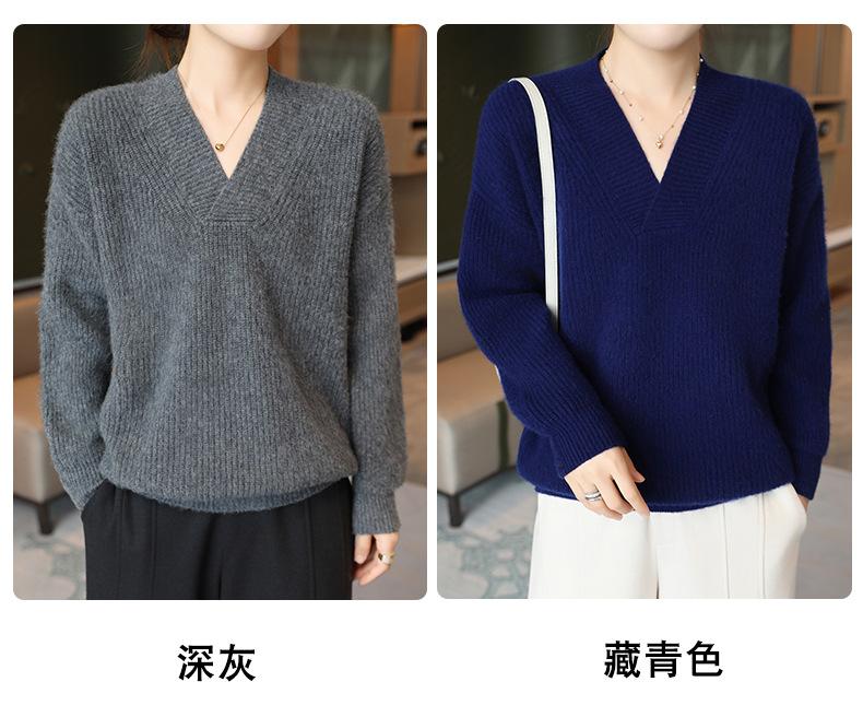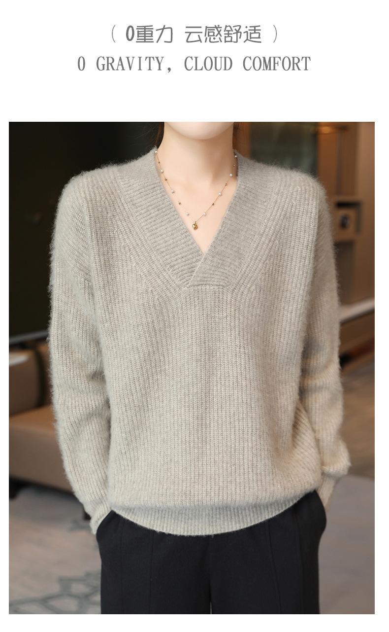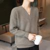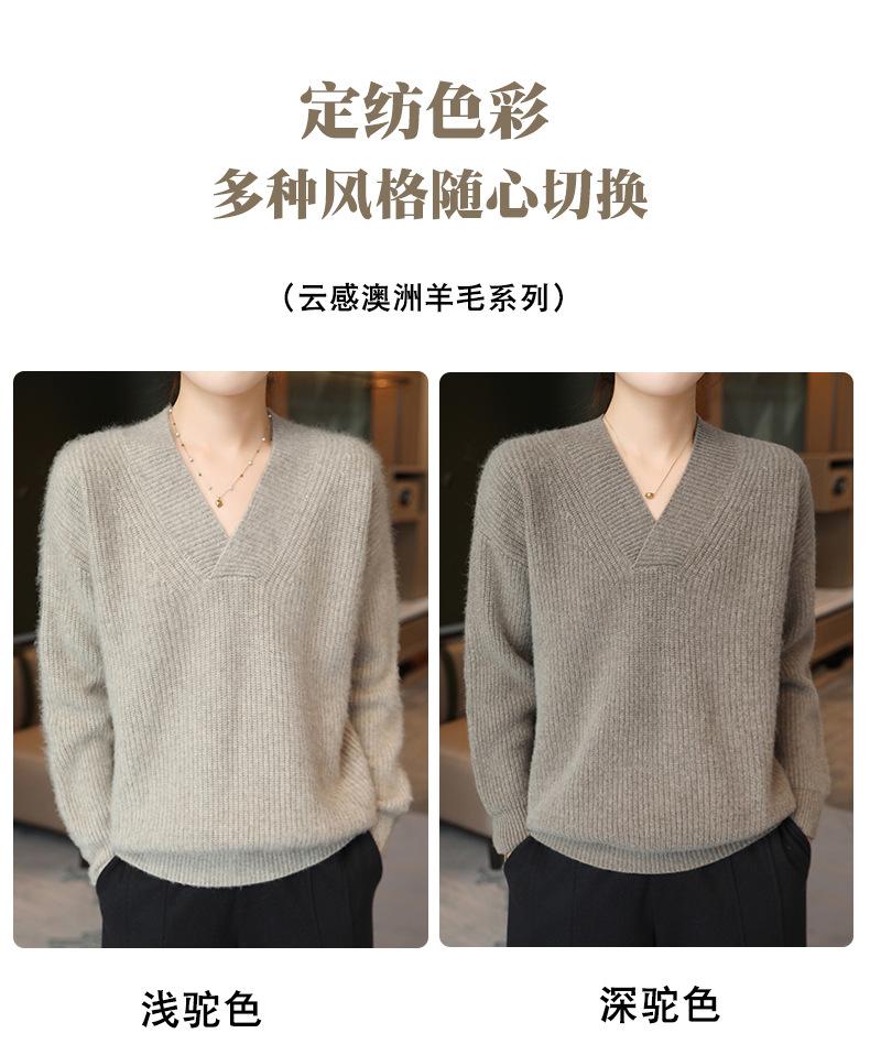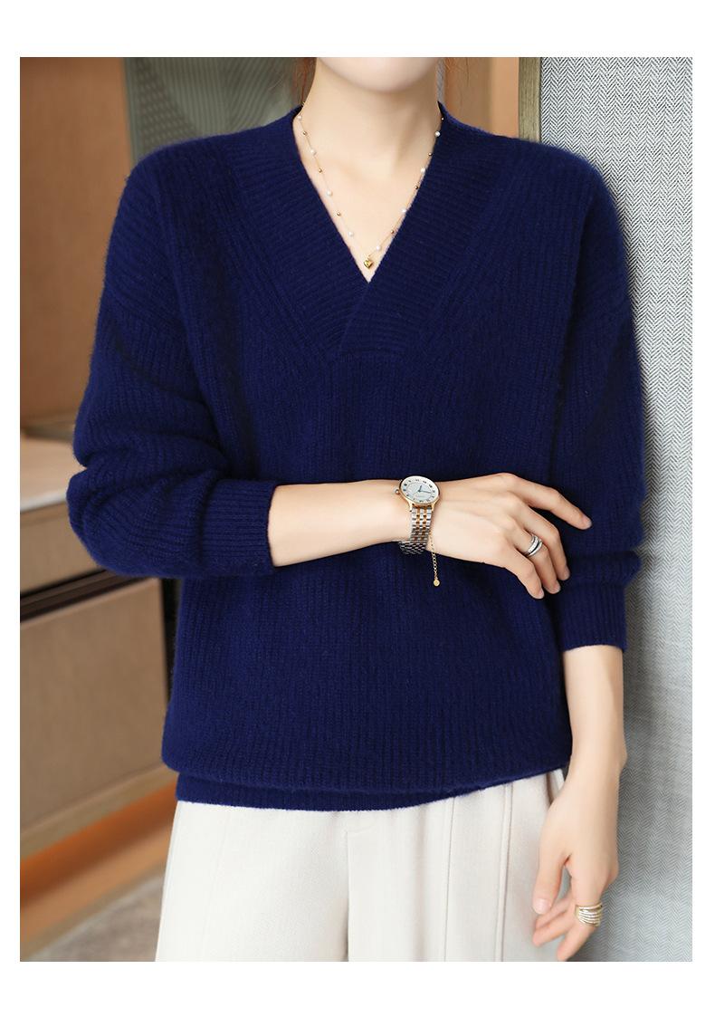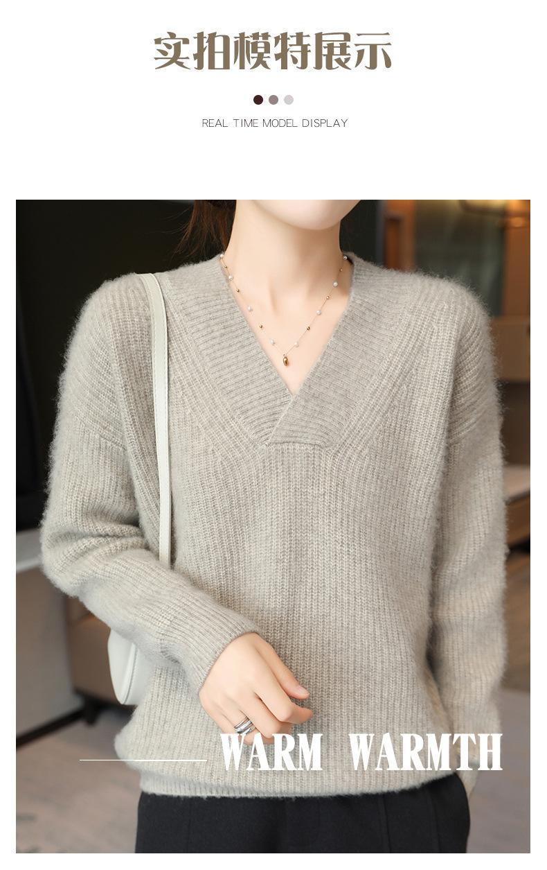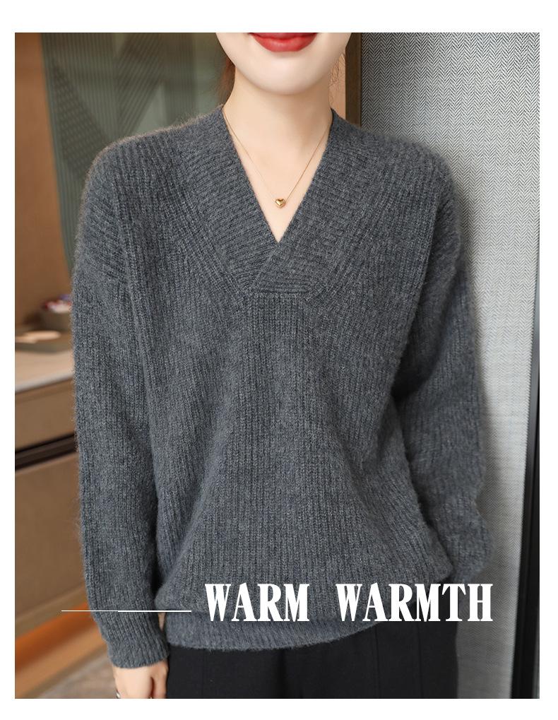 Suéter holgado de punto de lana pura con cuello en V y manga larga, elegante y holgado para mujer, nuevo estilo