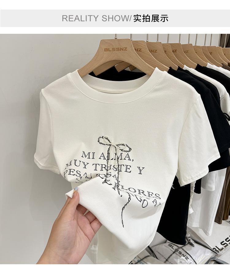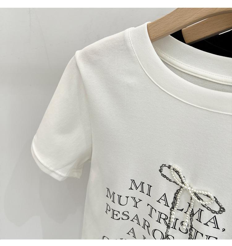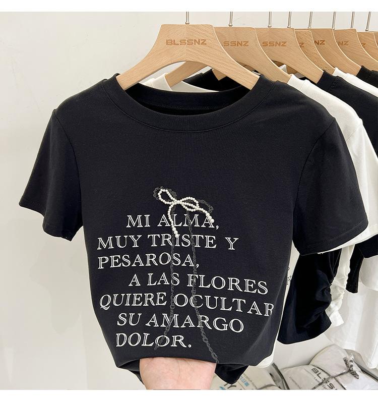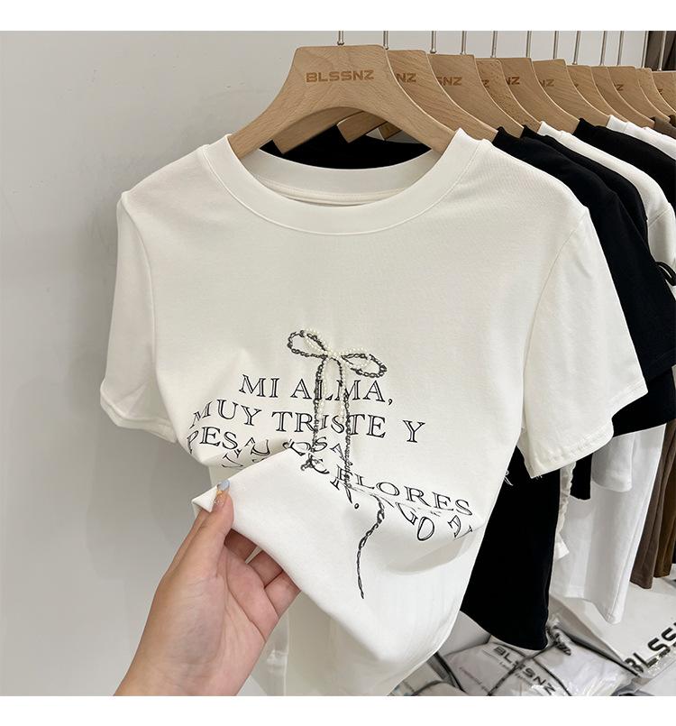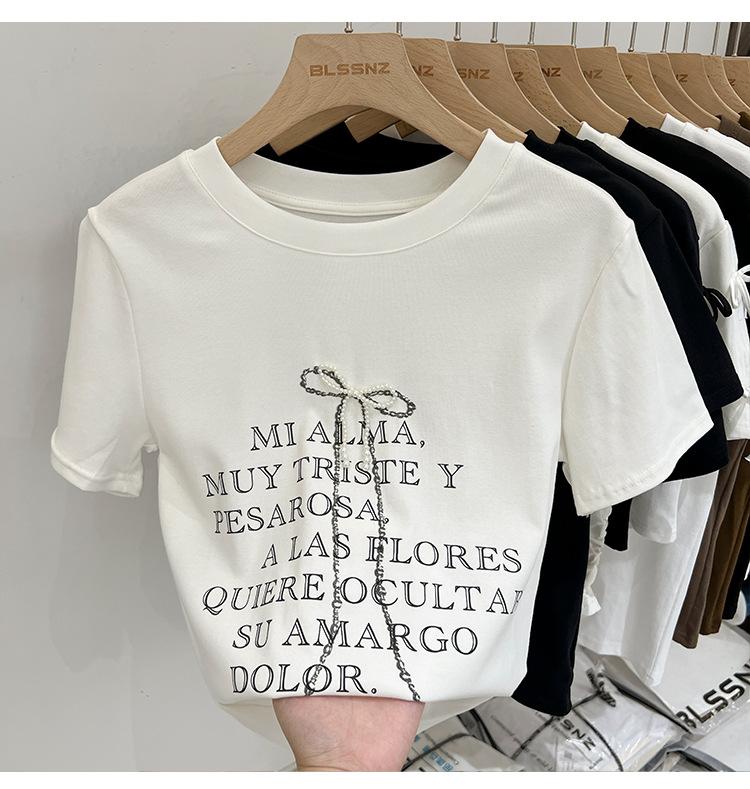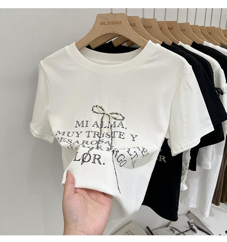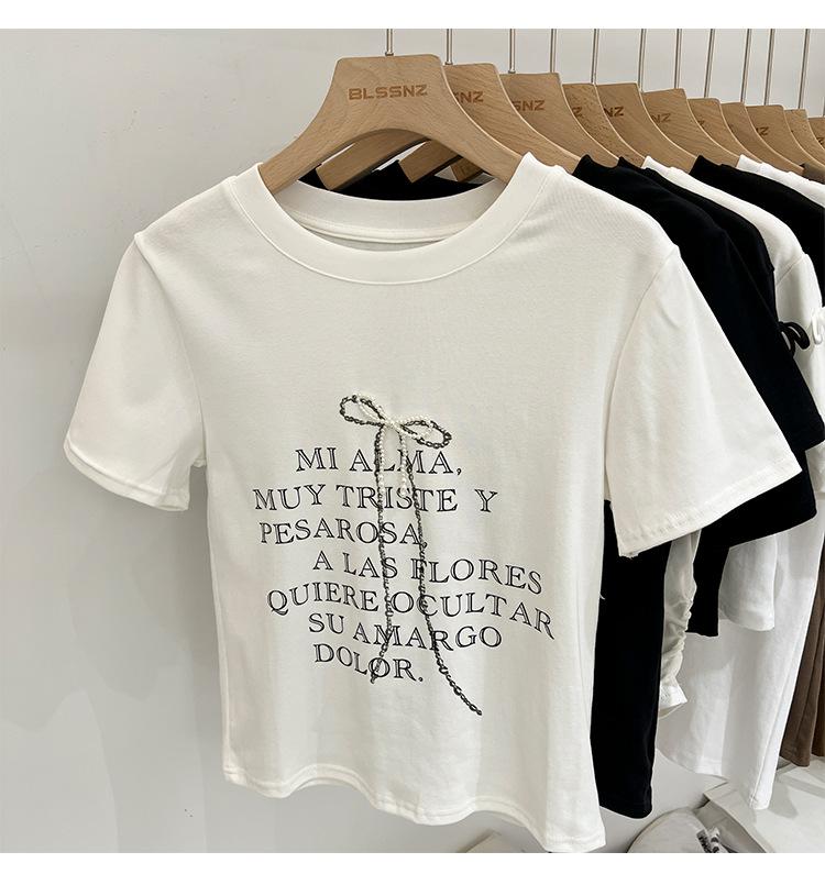 Camiseta de manga corta con cuello redondo y hombros descubiertos para mujer, con lazo estampado, de alta gama, para chicas atractivas, ajustada, de corte pequeño.