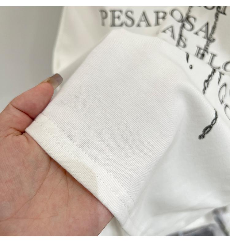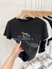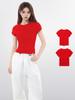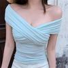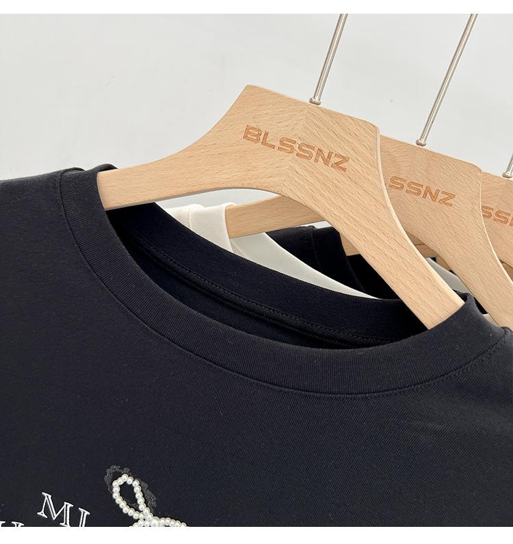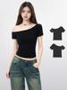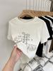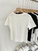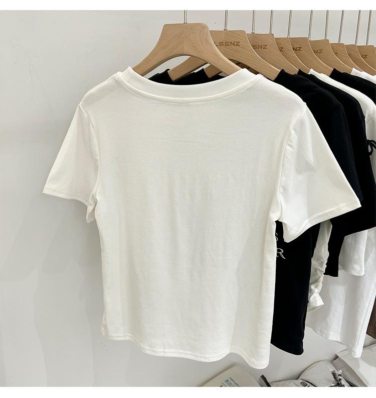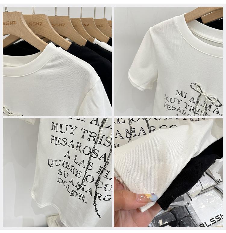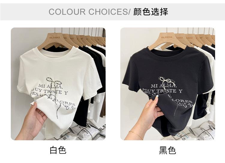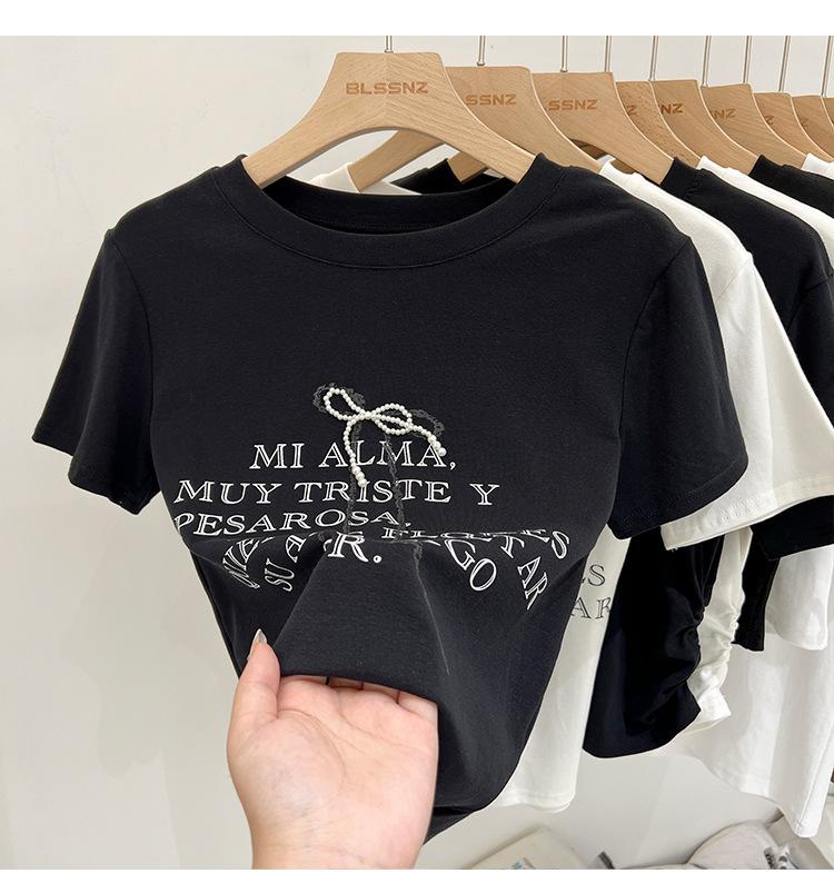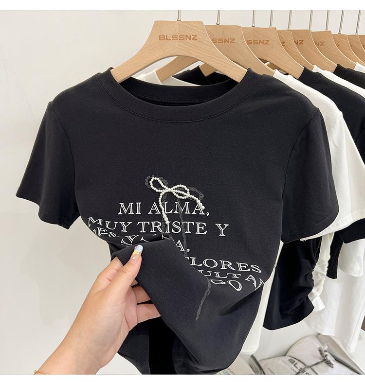Camiseta de manga corta con cuello redondo y hombros descubiertos para mujer, con lazo estampado, de alta gama, para chicas atractivas, ajustada, de corte pequeño.
