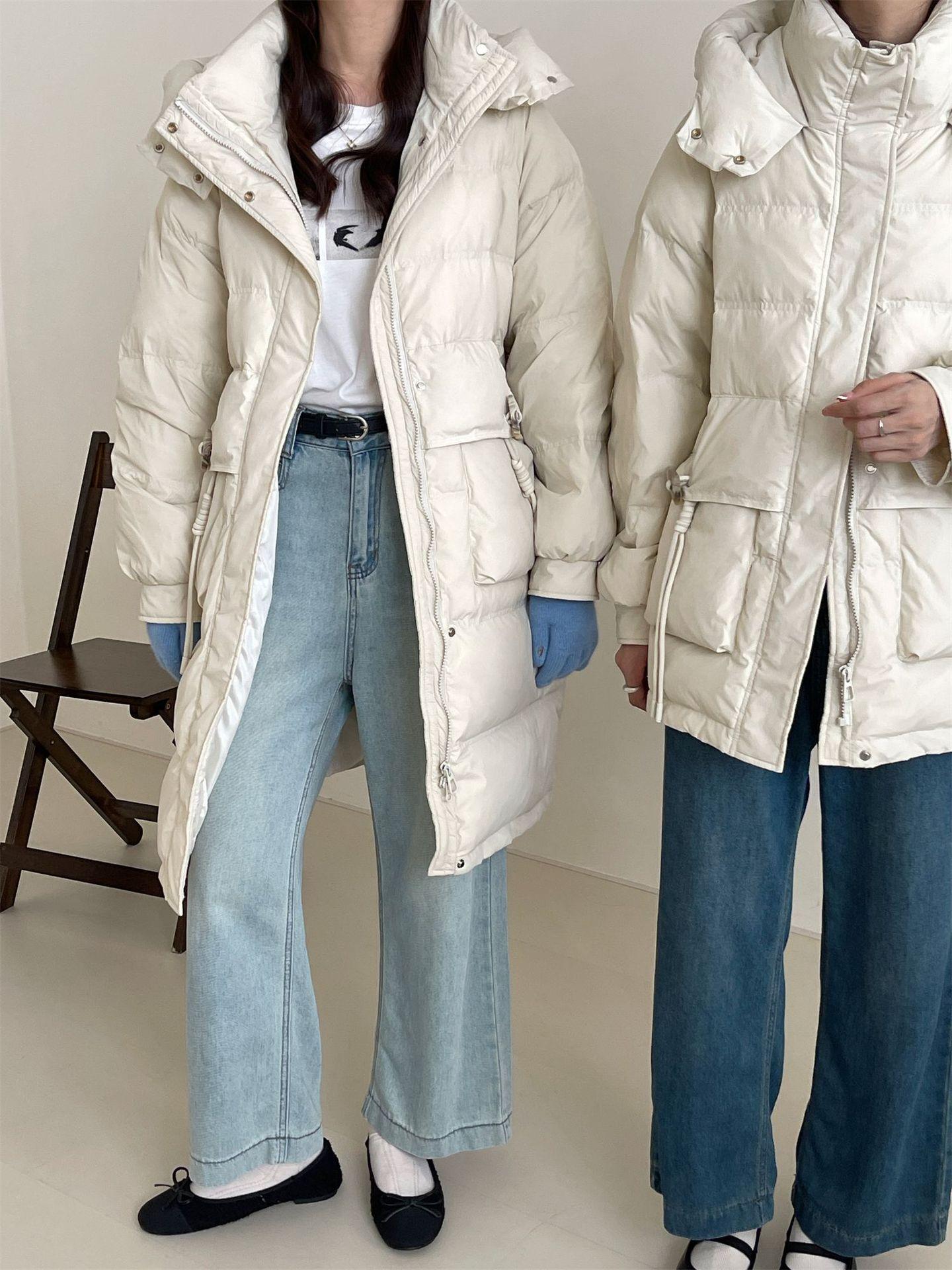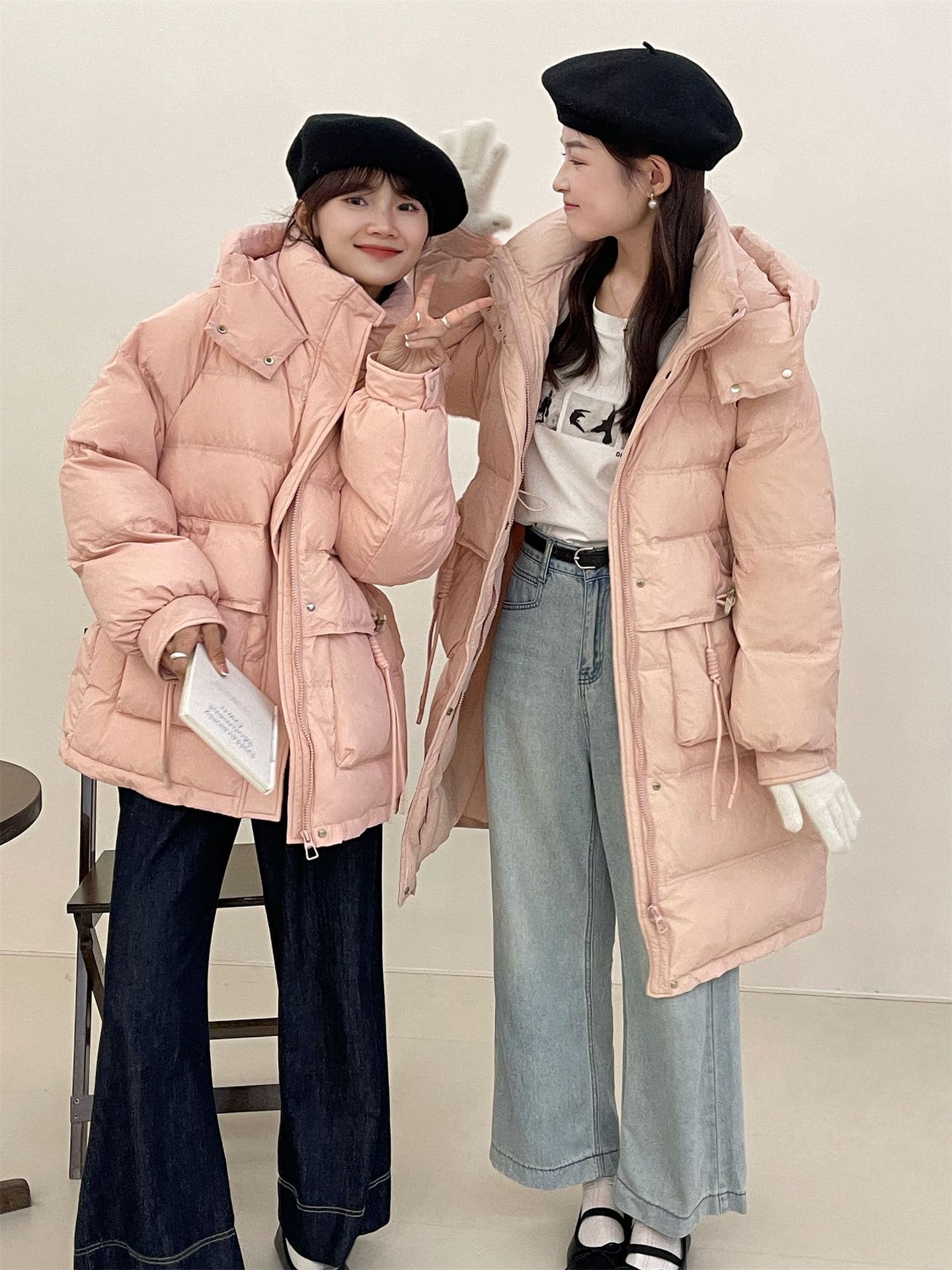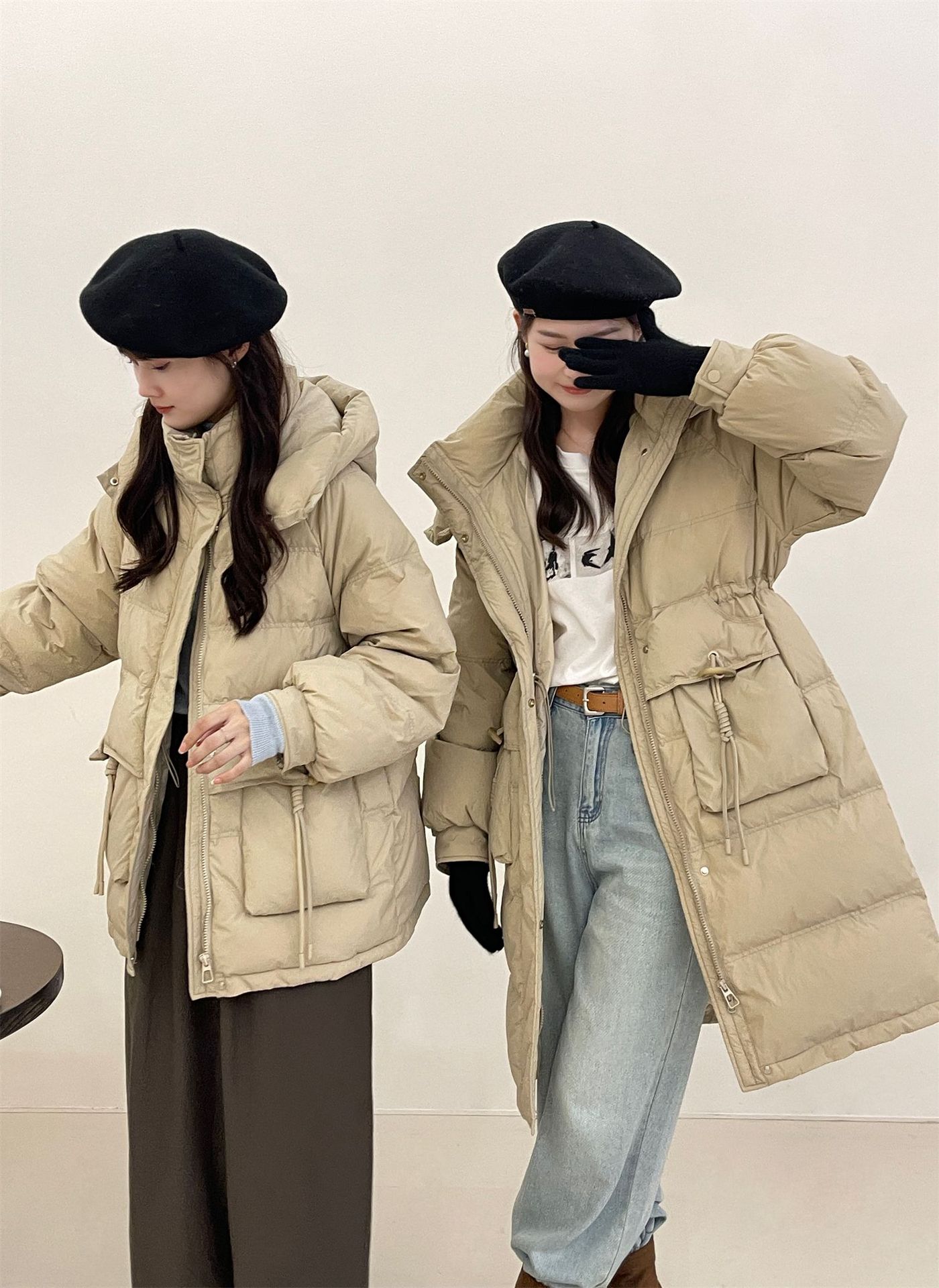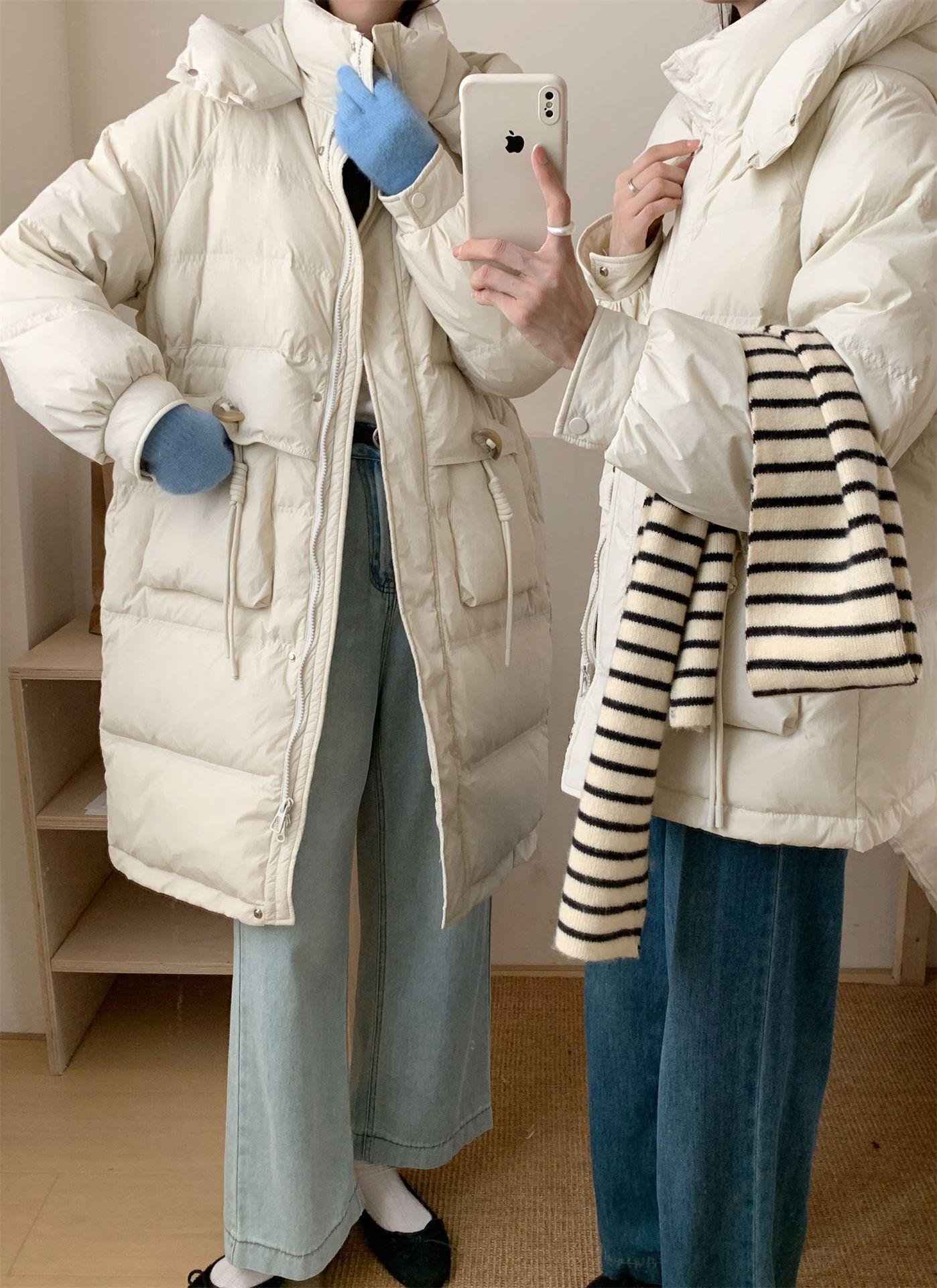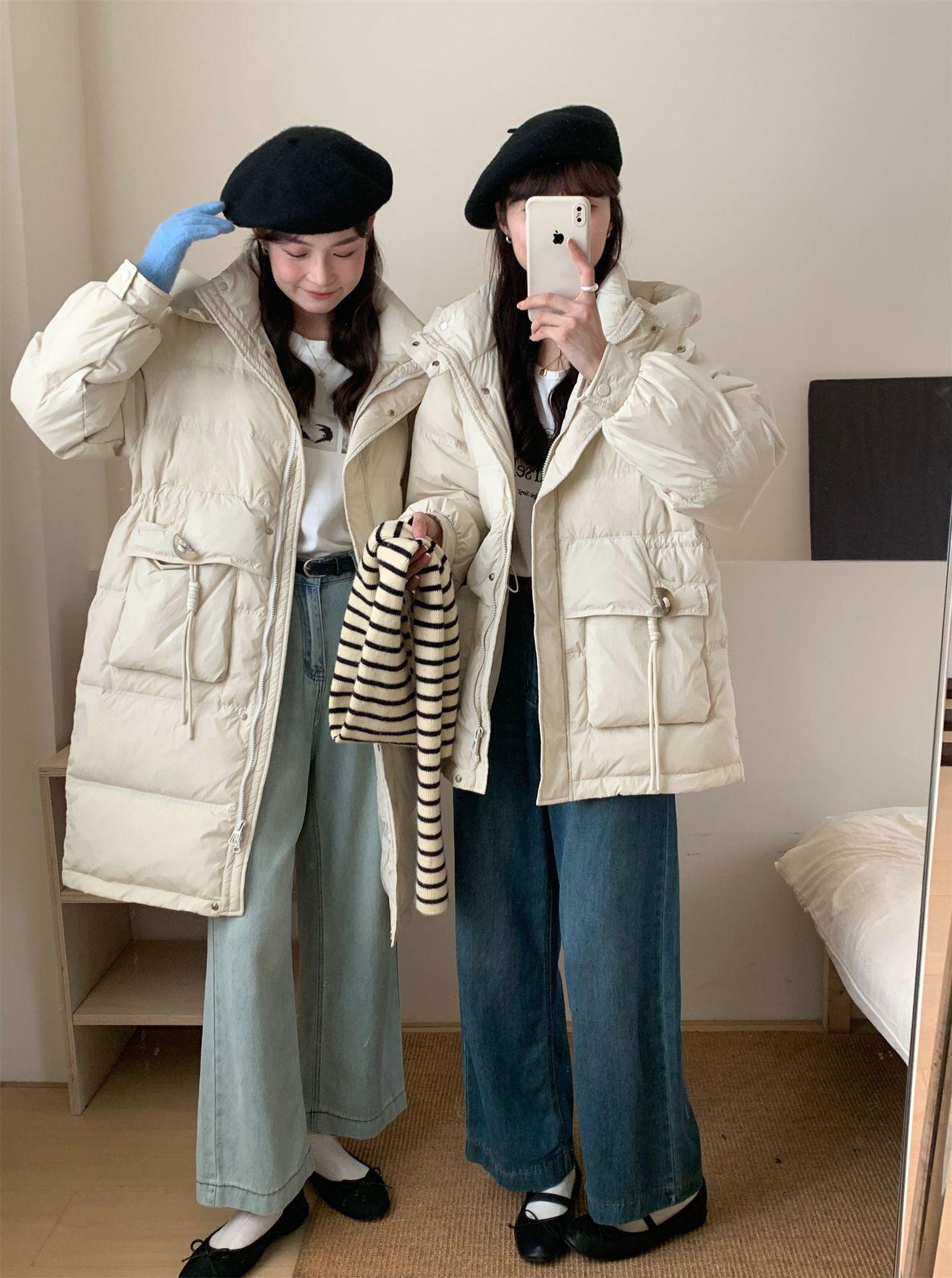 Chamarra corta de plumón con hebilla creciente para mujer Invierno Nuevo Estudiante con capucha Engrosada Cintura Adelgazante Look Plumón de pato blanco Chaqueta cálida