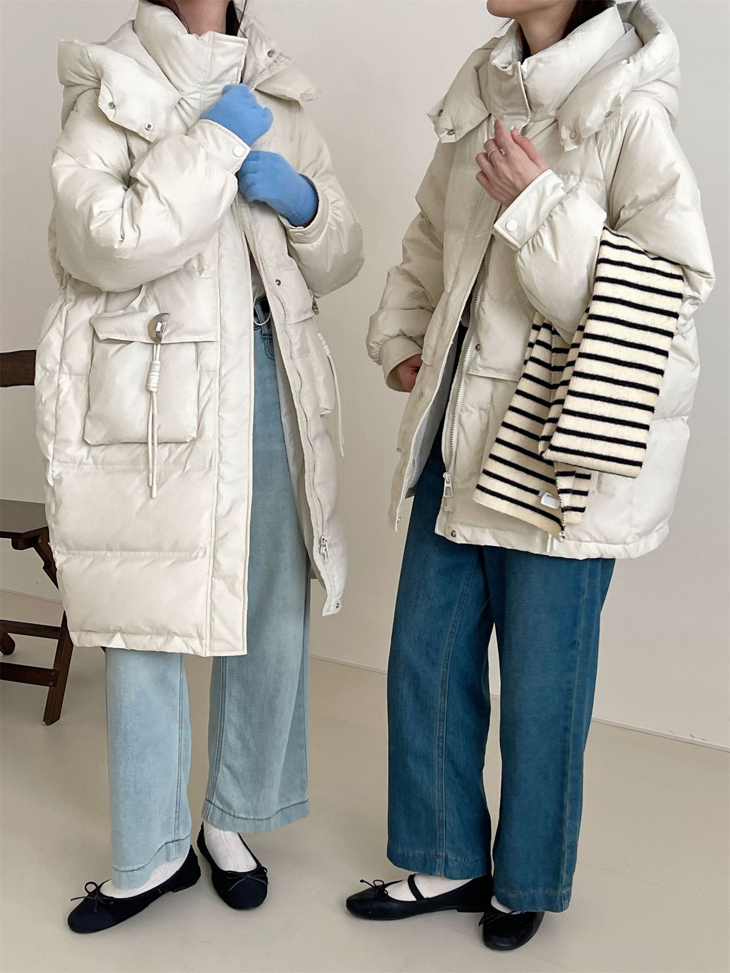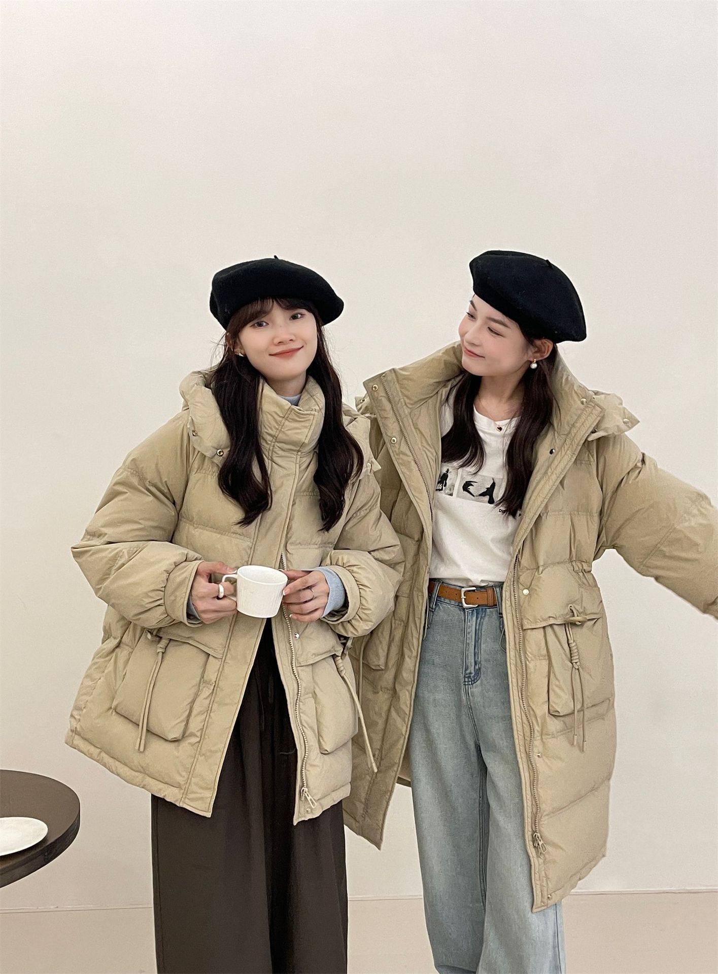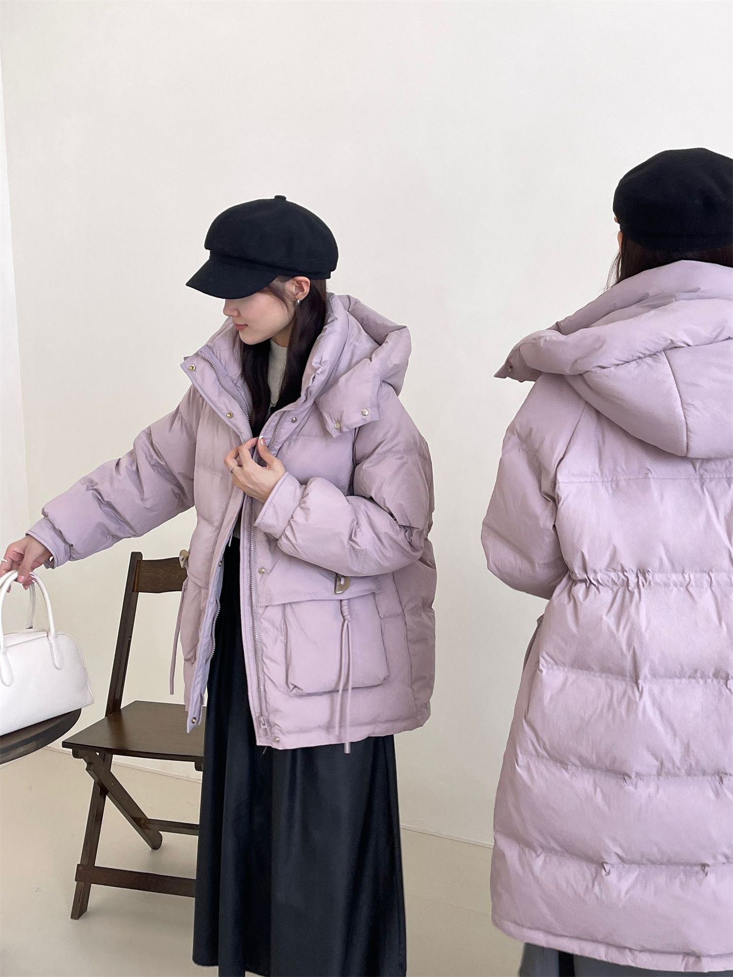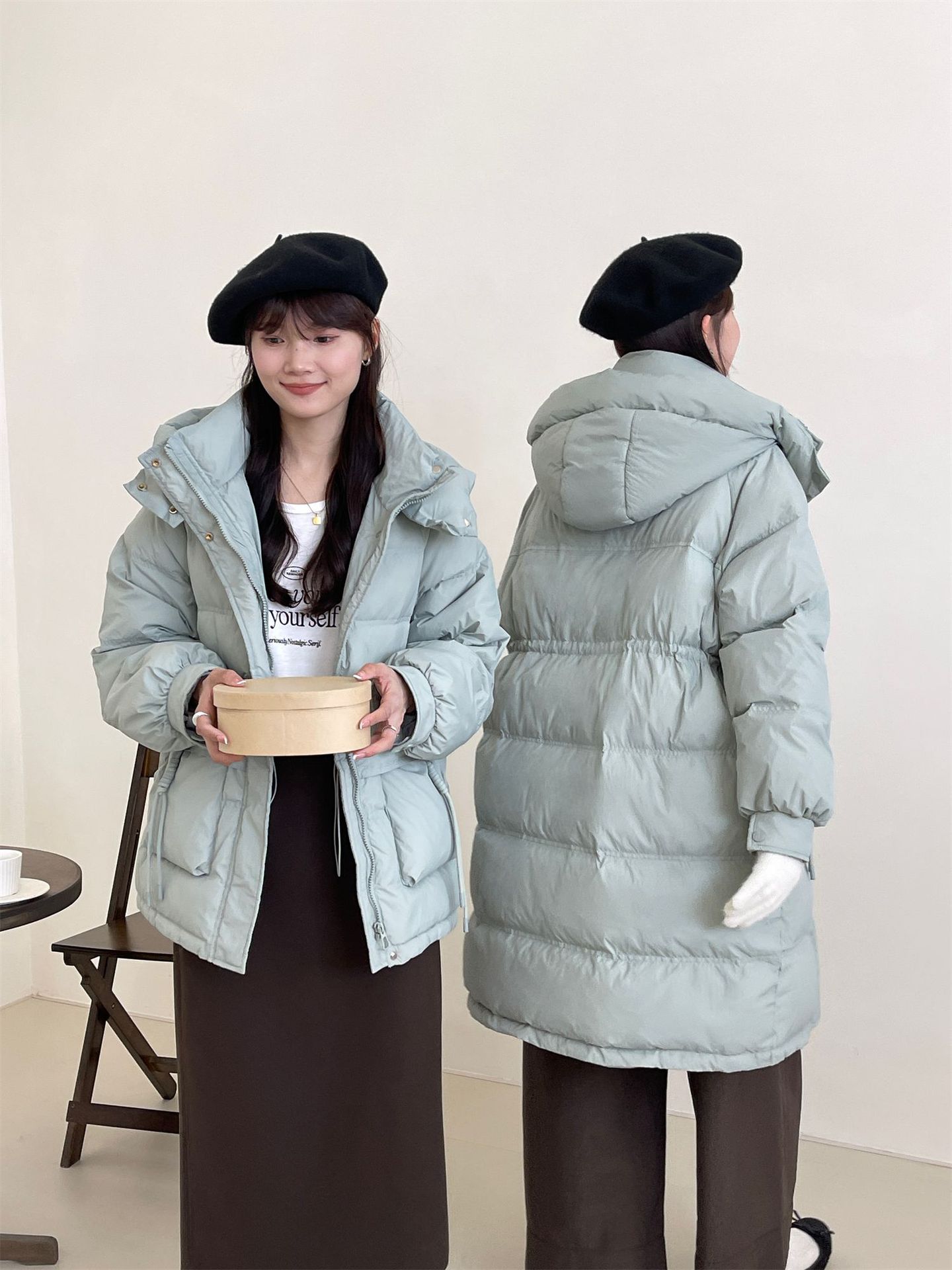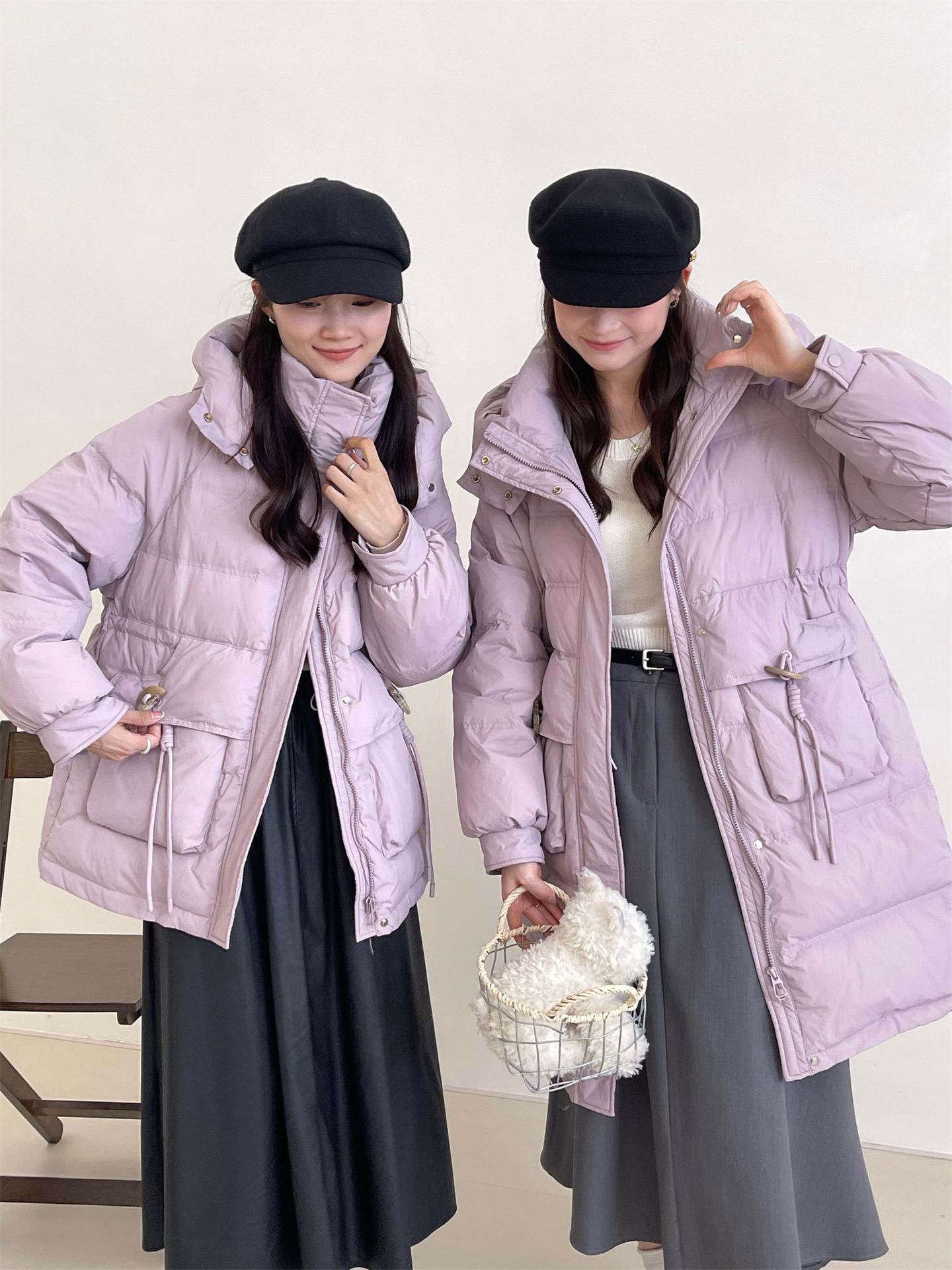 Chamarra corta de plumón con hebilla creciente para mujer Invierno Nuevo Estudiante con capucha Engrosada Cintura Adelgazante Look Plumón de pato blanco Chaqueta cálida