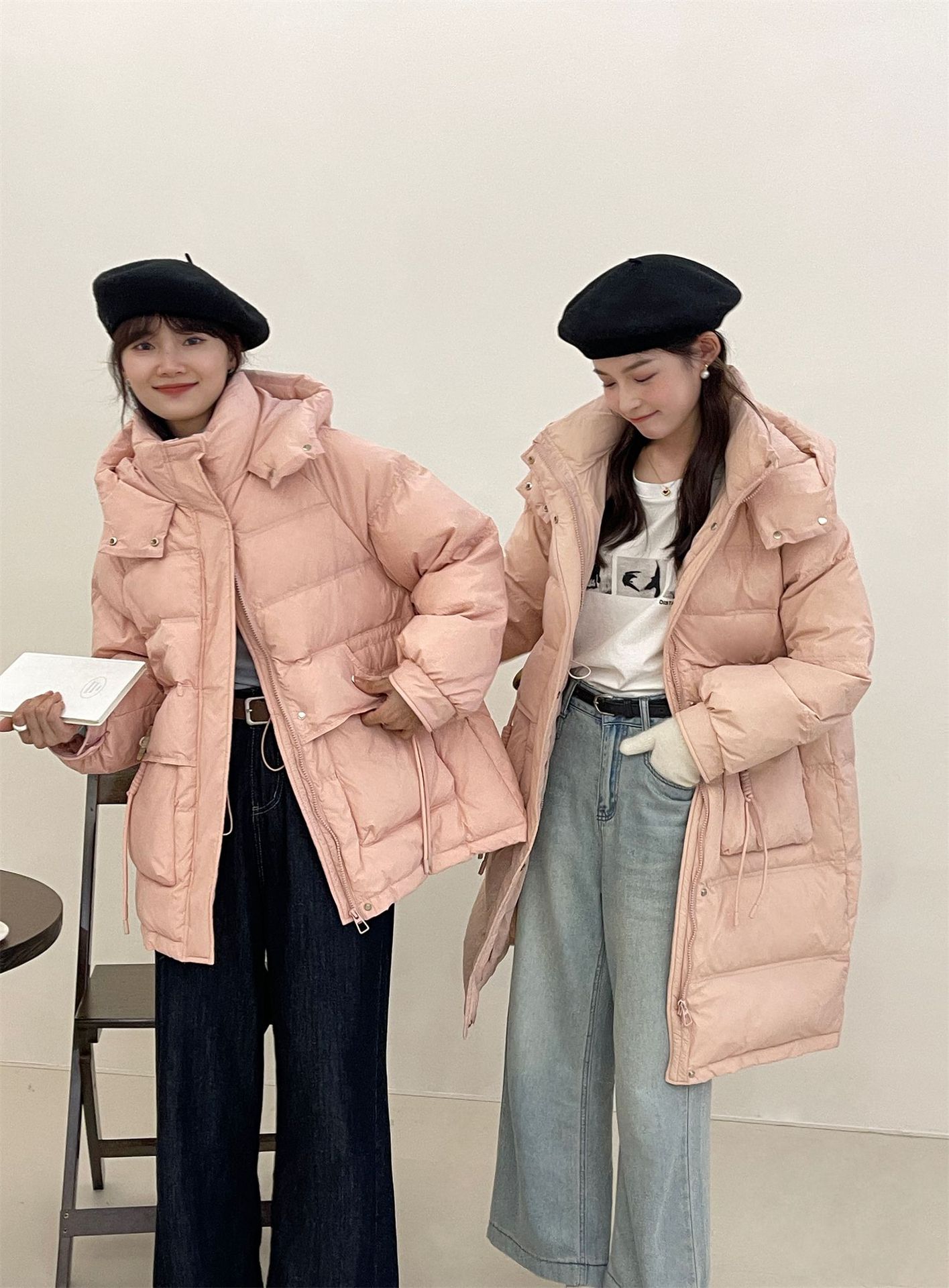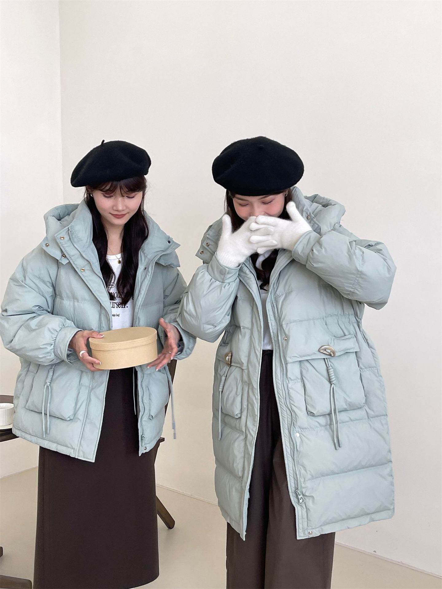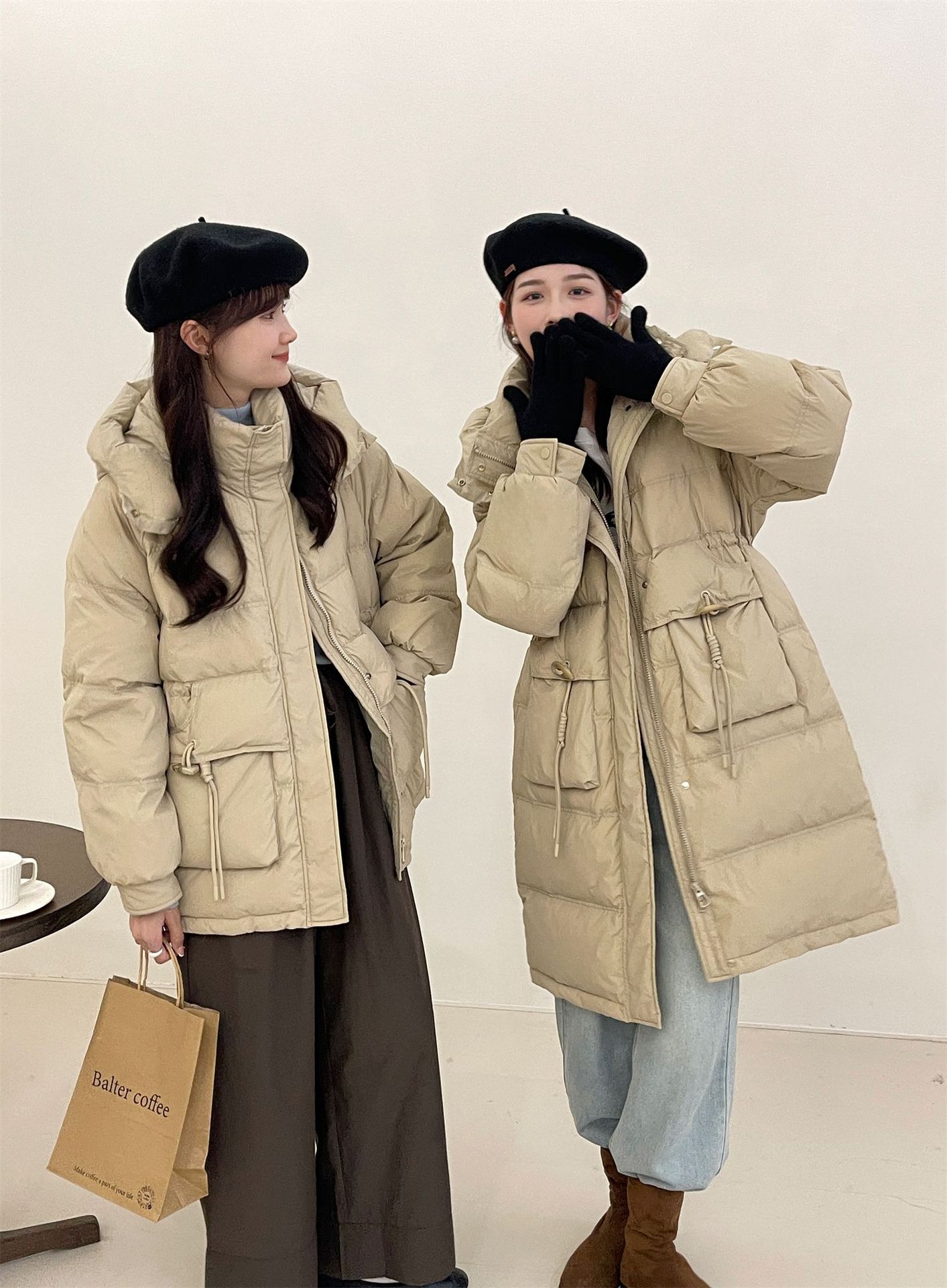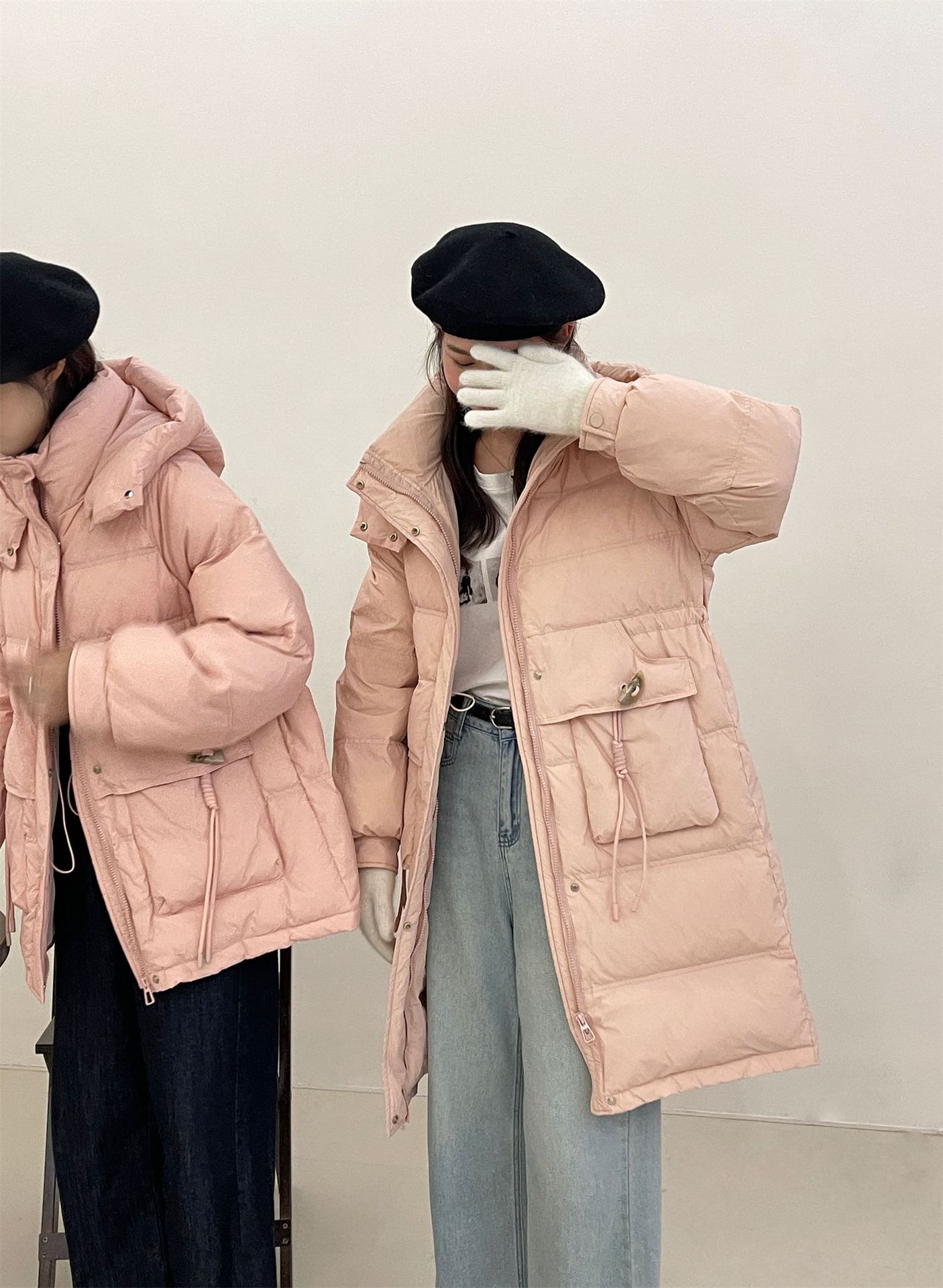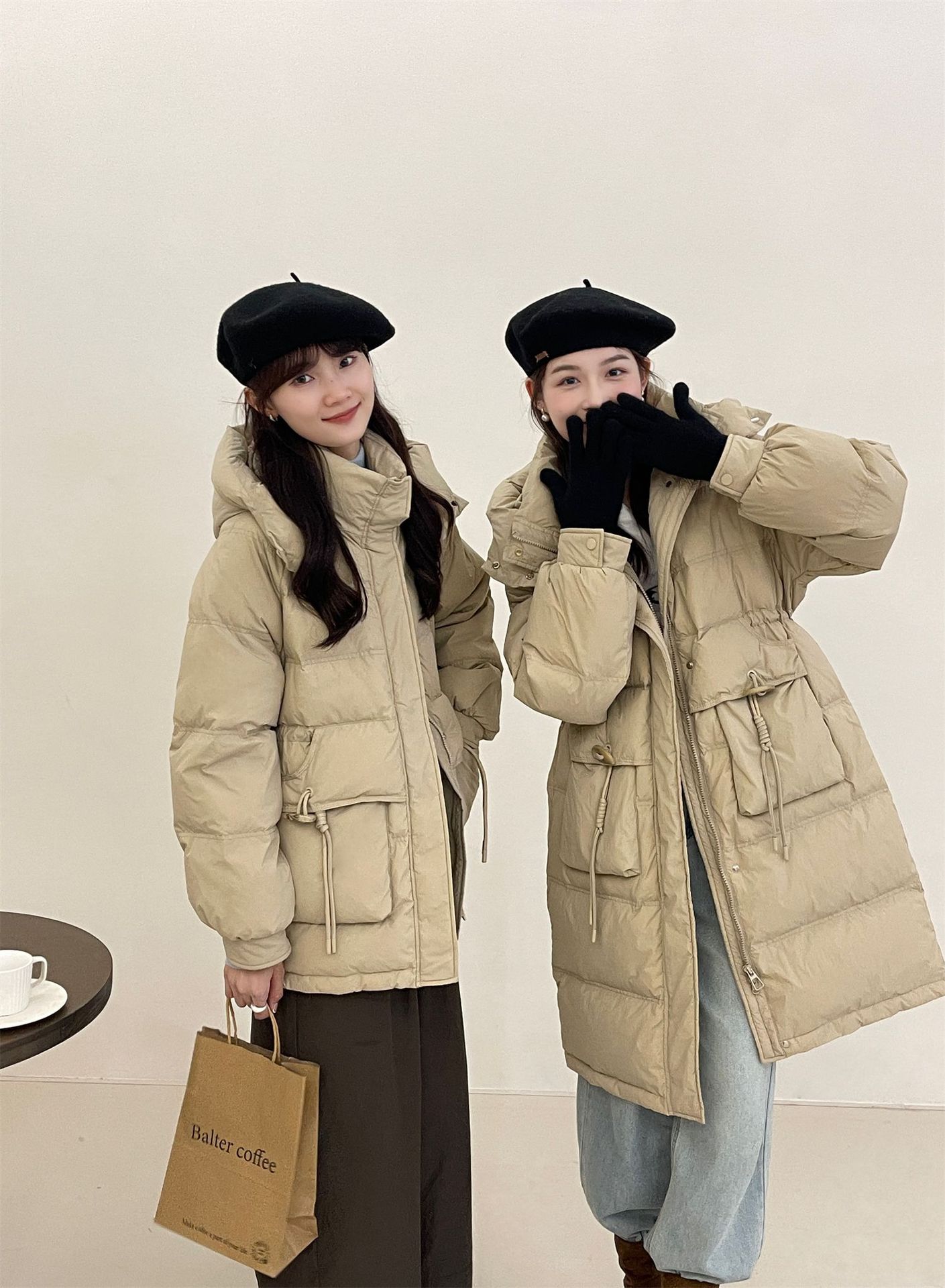 Chamarra corta de plumón con hebilla creciente para mujer Invierno Nuevo Estudiante con capucha Engrosada Cintura Adelgazante Look Plumón de pato blanco Chaqueta cálida