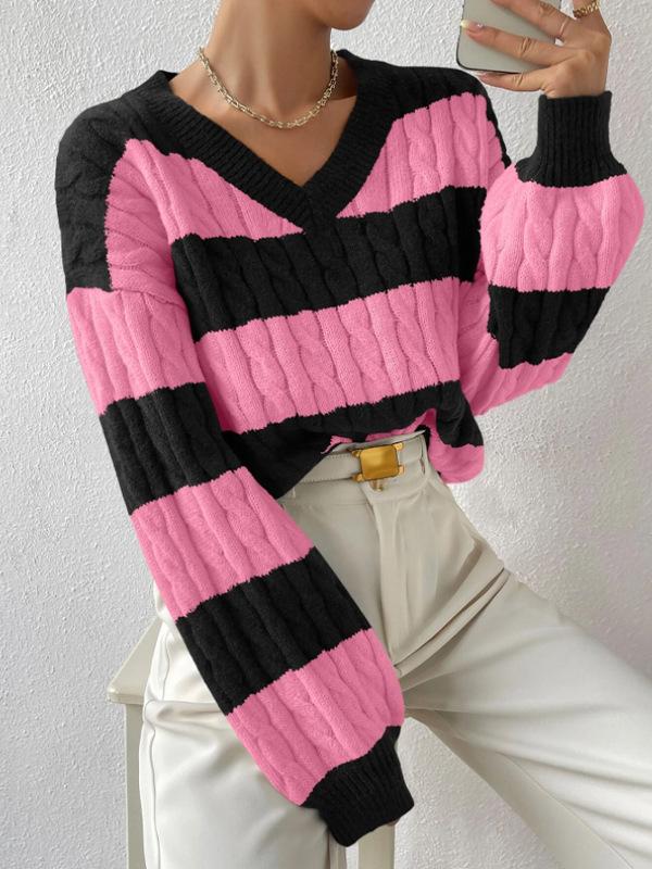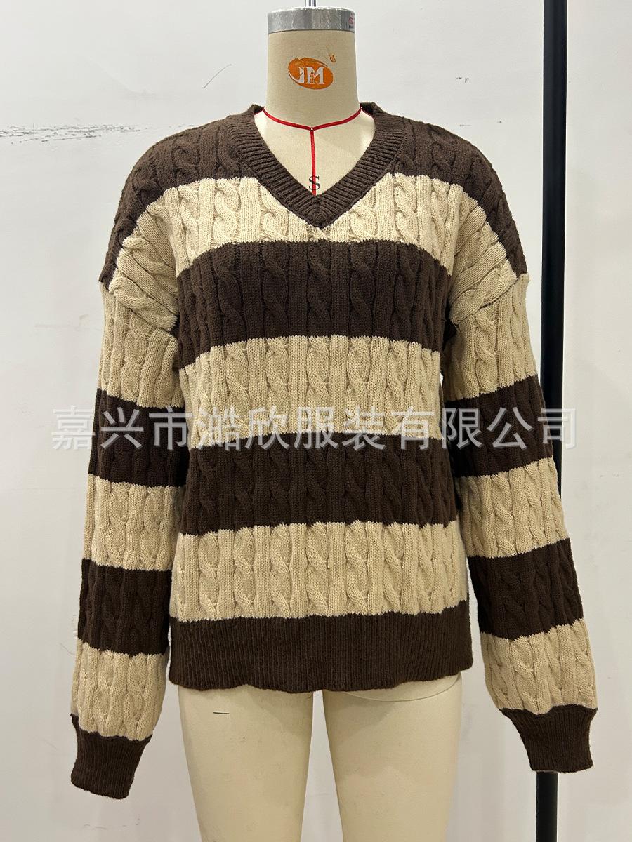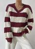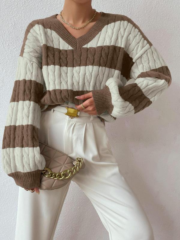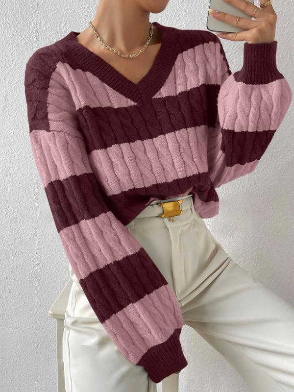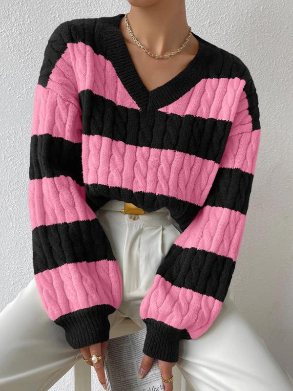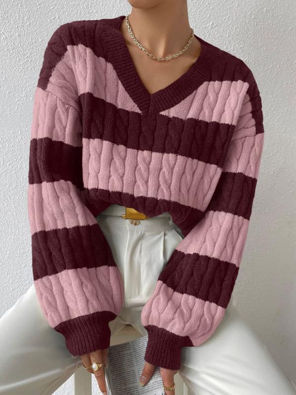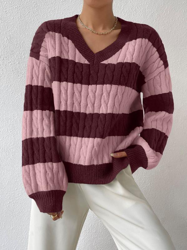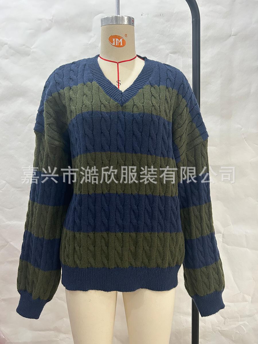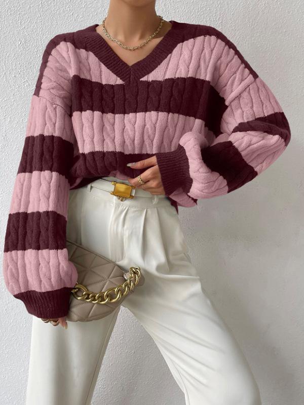 Suéter de punto holgado de estilo perezoso para otoño e invierno, nuevo, de moda transfronteriza, de comercio exterior, con cuello en V, estilo retro, a rayas y contraste de colores para mujer
