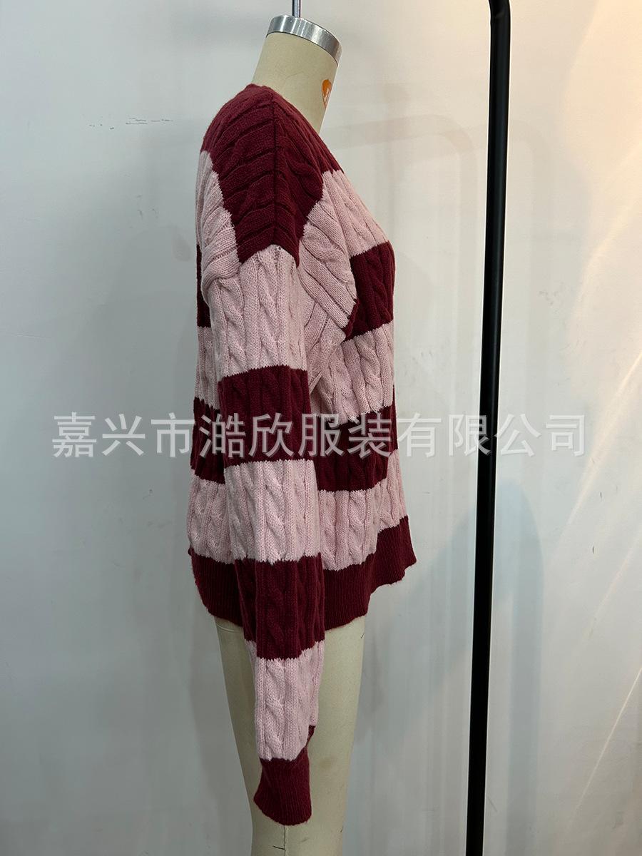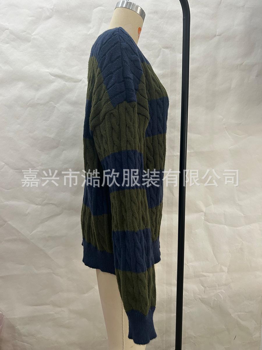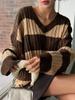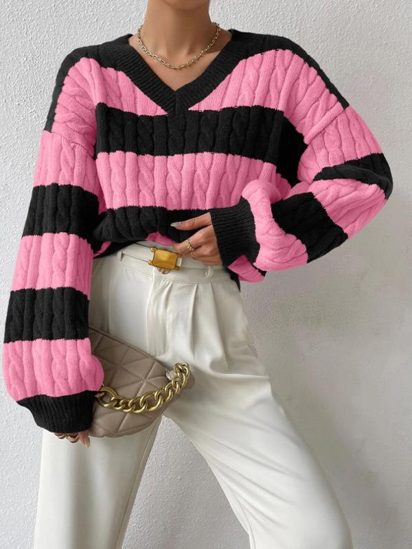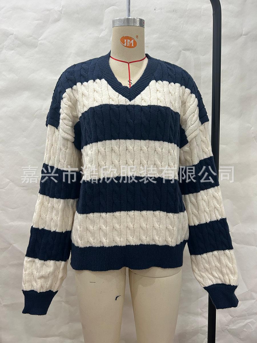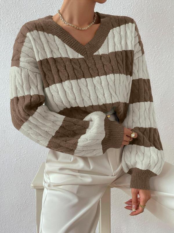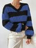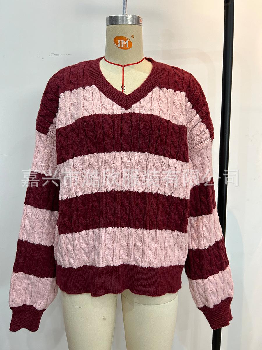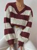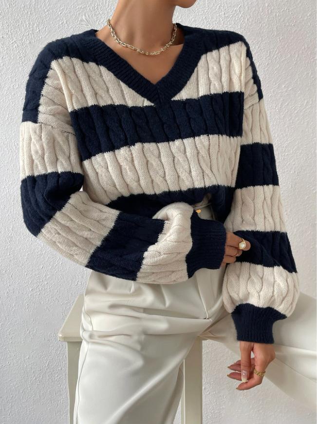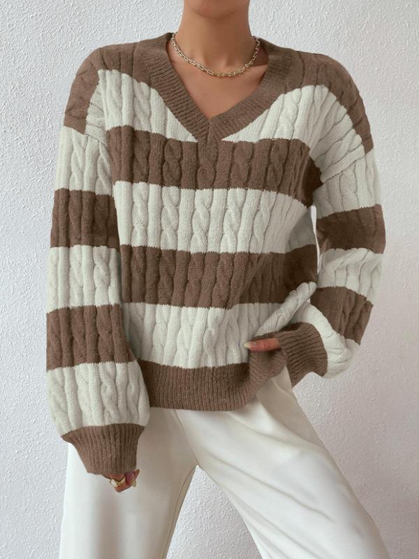 Suéter de punto holgado de estilo perezoso para otoño e invierno, nuevo, de moda transfronteriza, de comercio exterior, con cuello en V, estilo retro, a rayas y contraste de colores para mujer