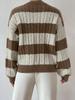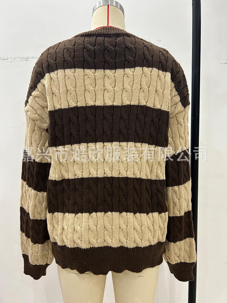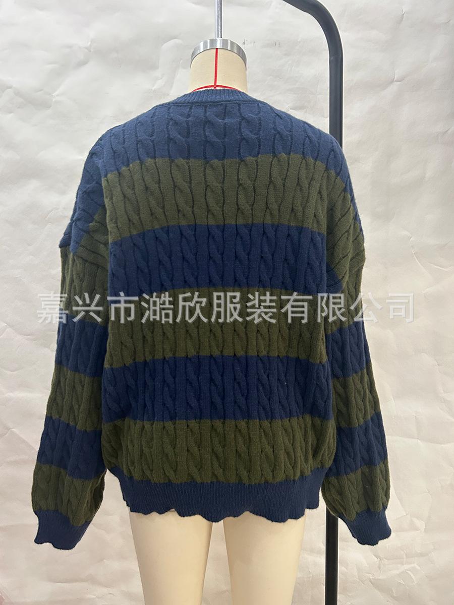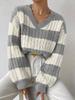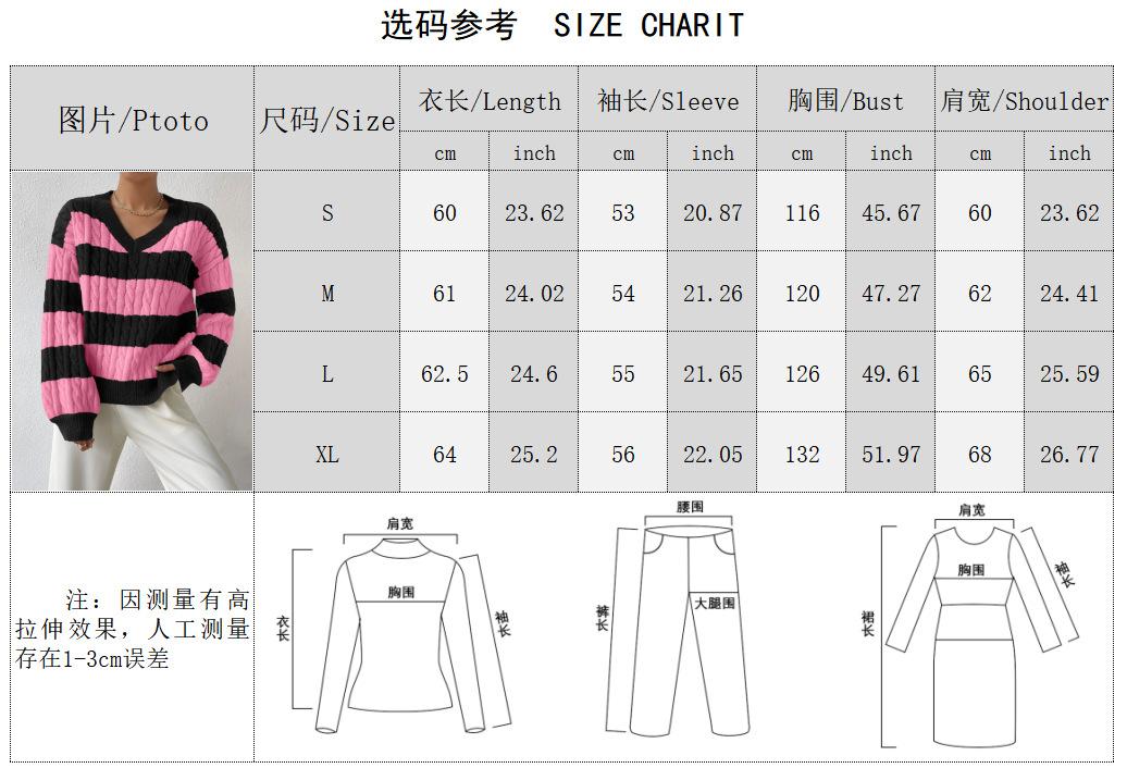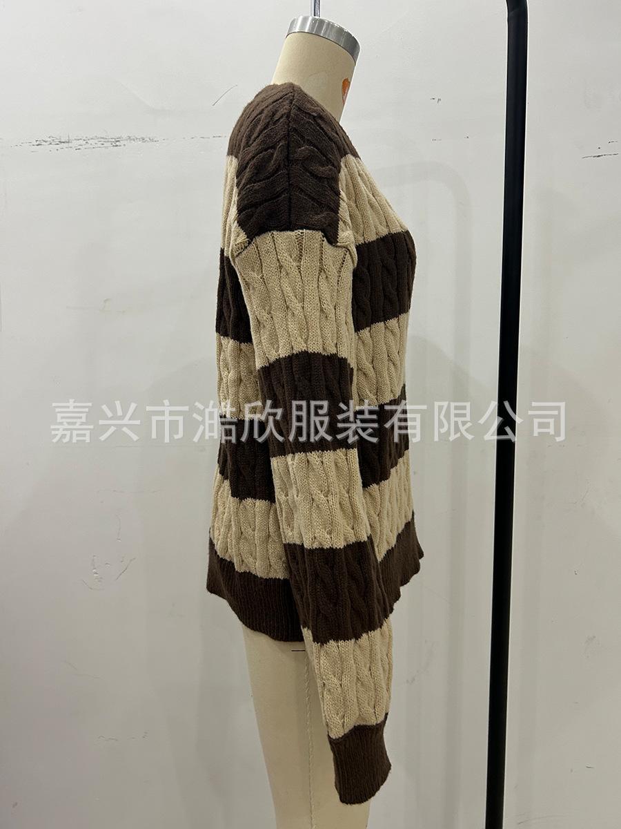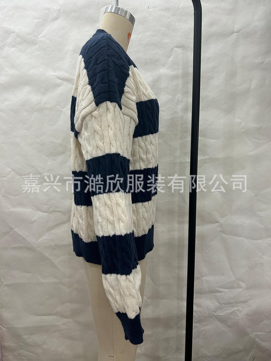 Suéter de punto holgado de estilo perezoso para otoño e invierno, nuevo, de moda transfronteriza, de comercio exterior, con cuello en V, estilo retro, a rayas y contraste de colores para mujer