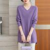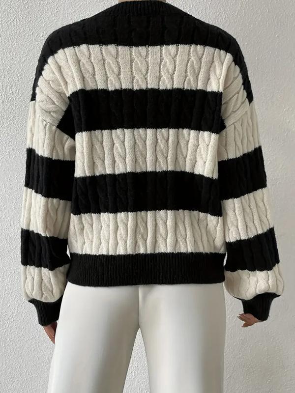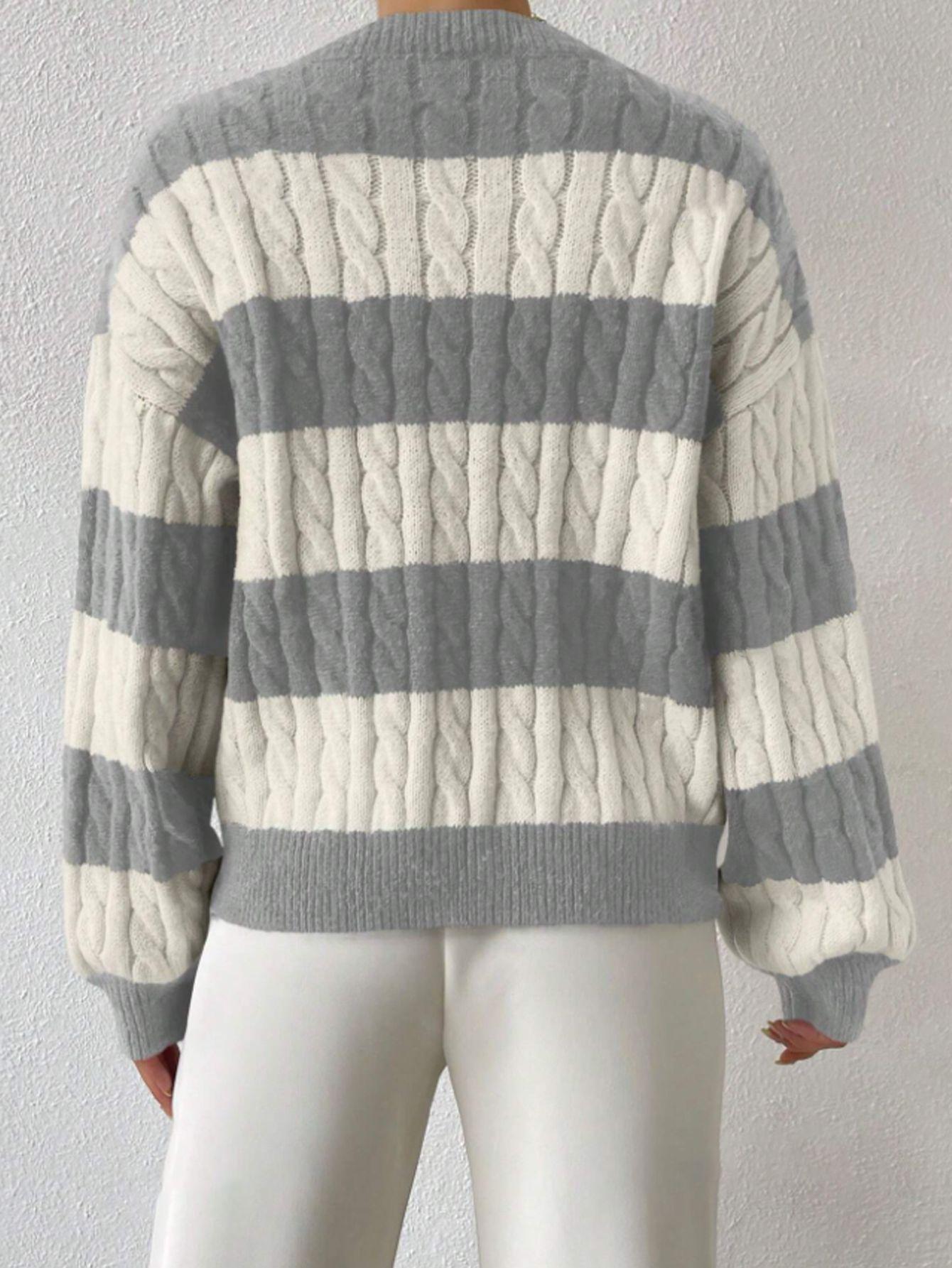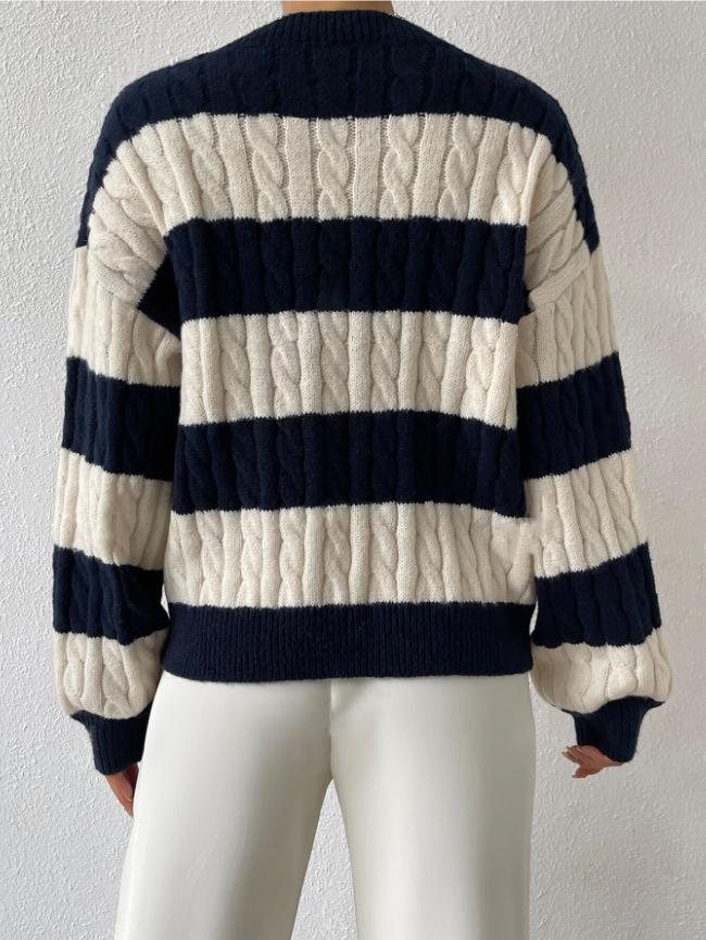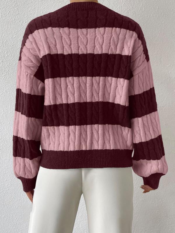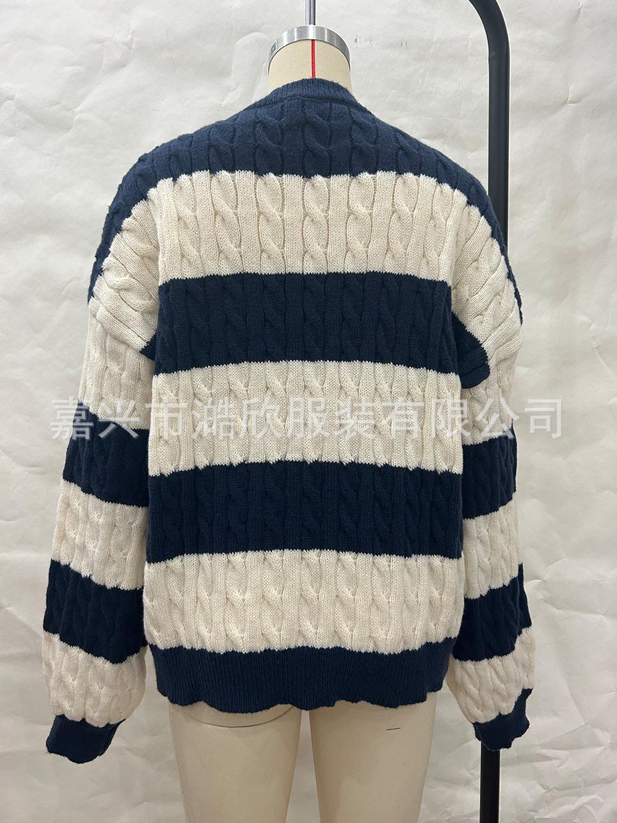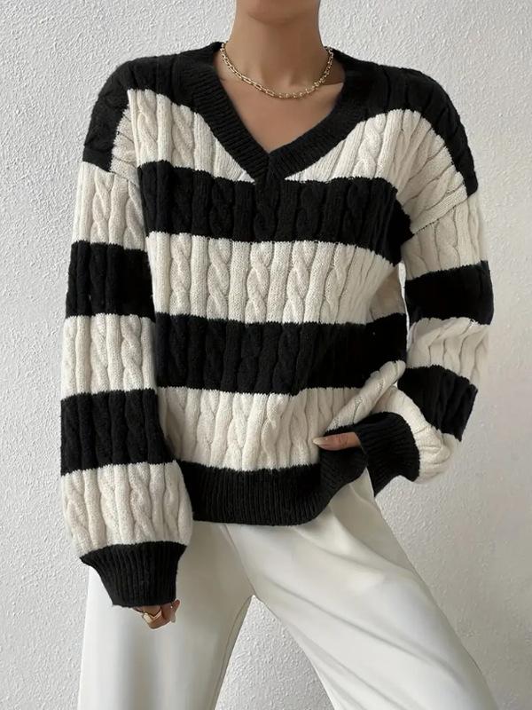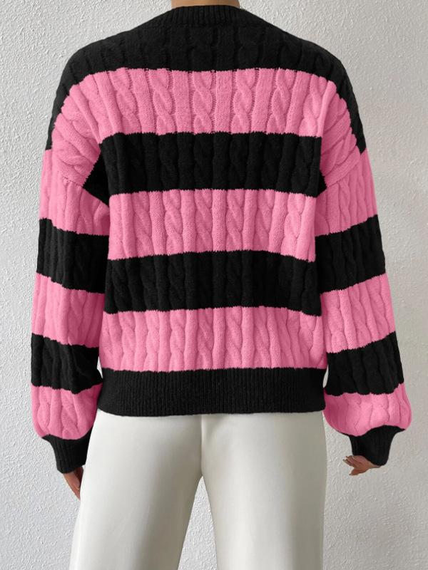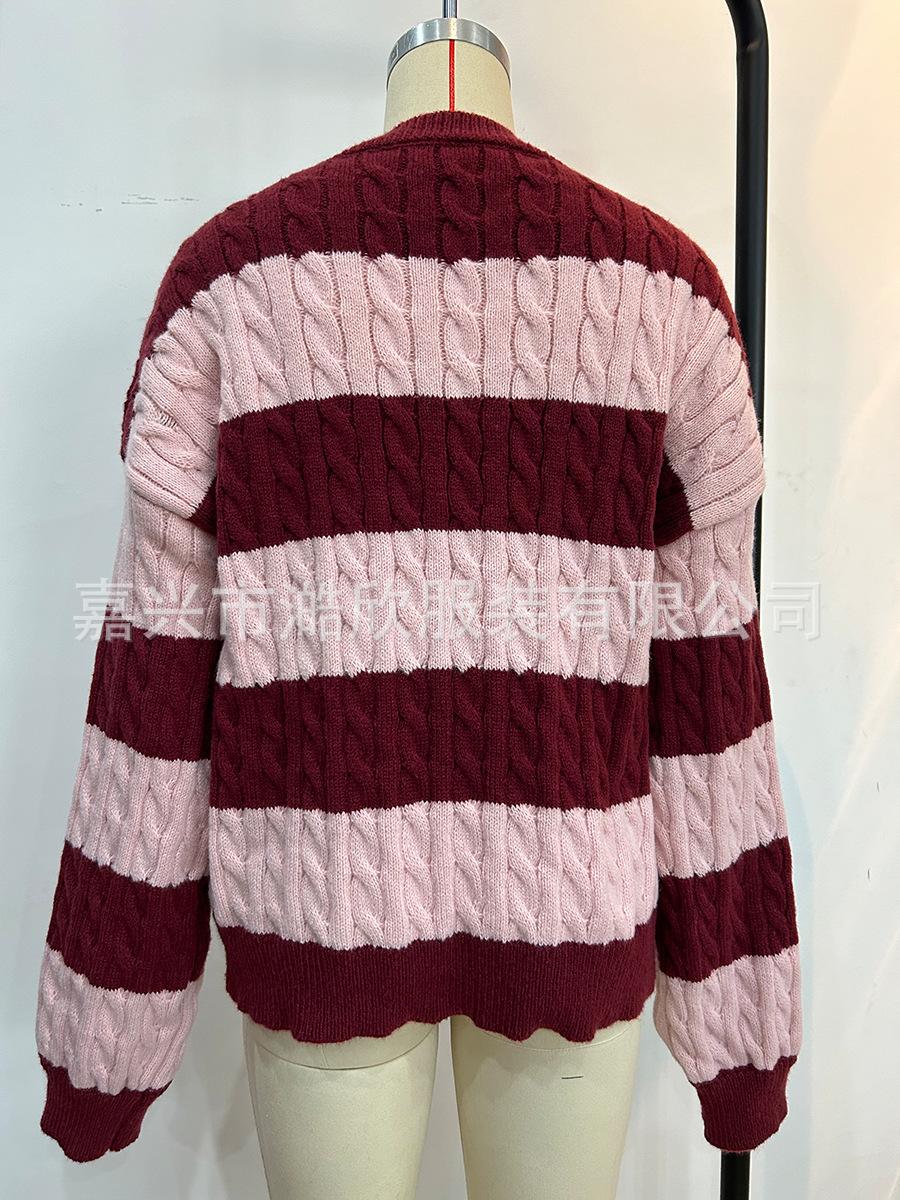 Suéter de punto holgado de estilo perezoso para otoño e invierno, nuevo, de moda transfronteriza, de comercio exterior, con cuello en V, estilo retro, a rayas y contraste de colores para mujer