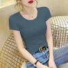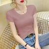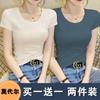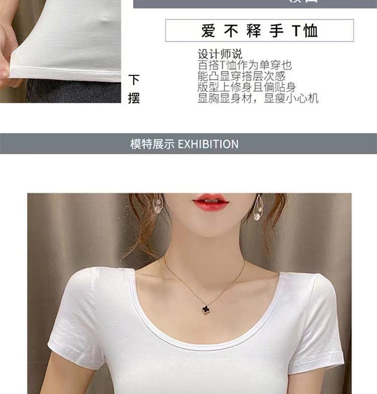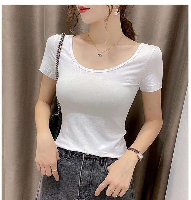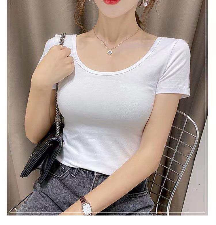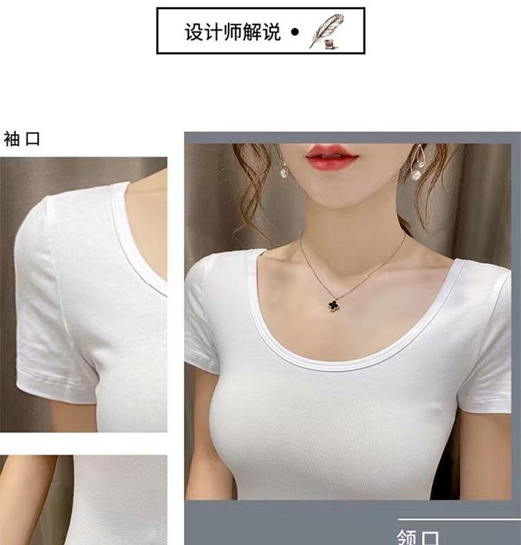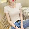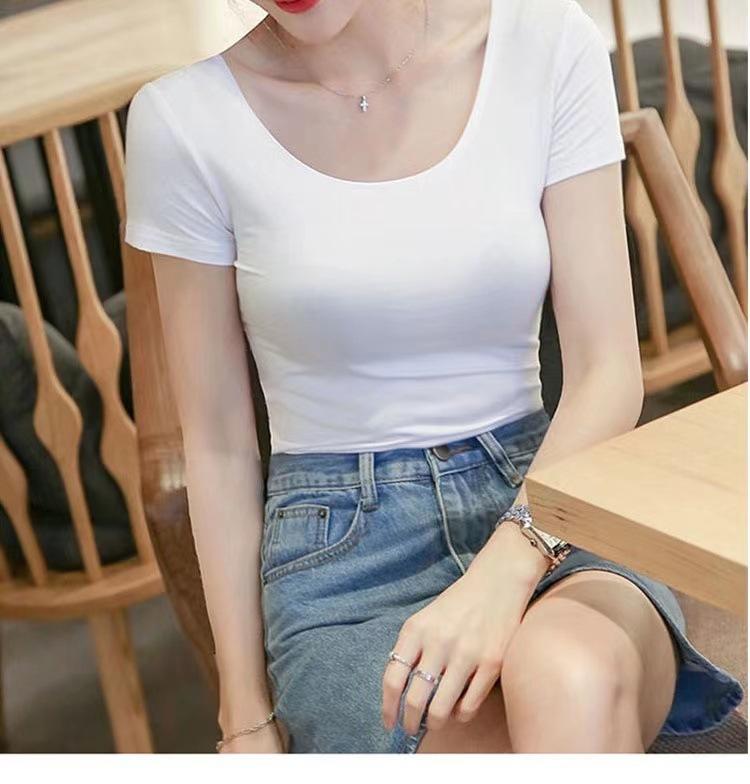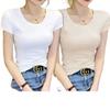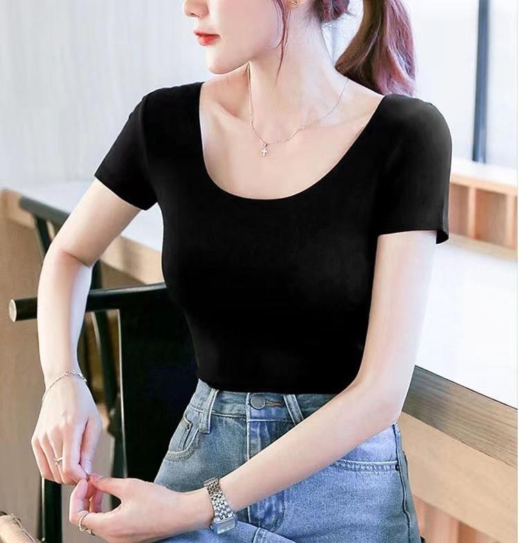 Camiseta de manga corta con cuello redondo modal para mujer, de verano, ajustada, con base de seda helada y hombros descubiertos, con media manga interior, 2023