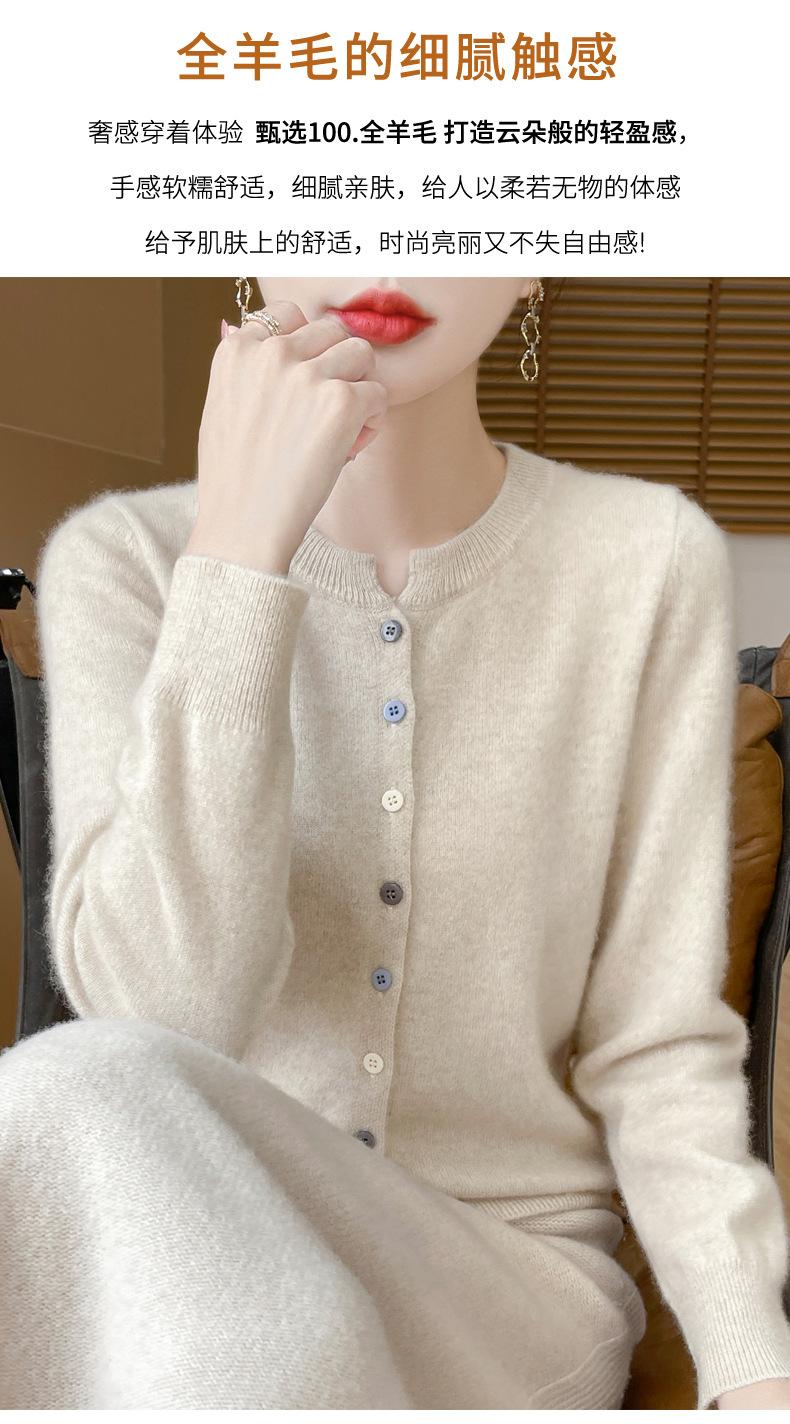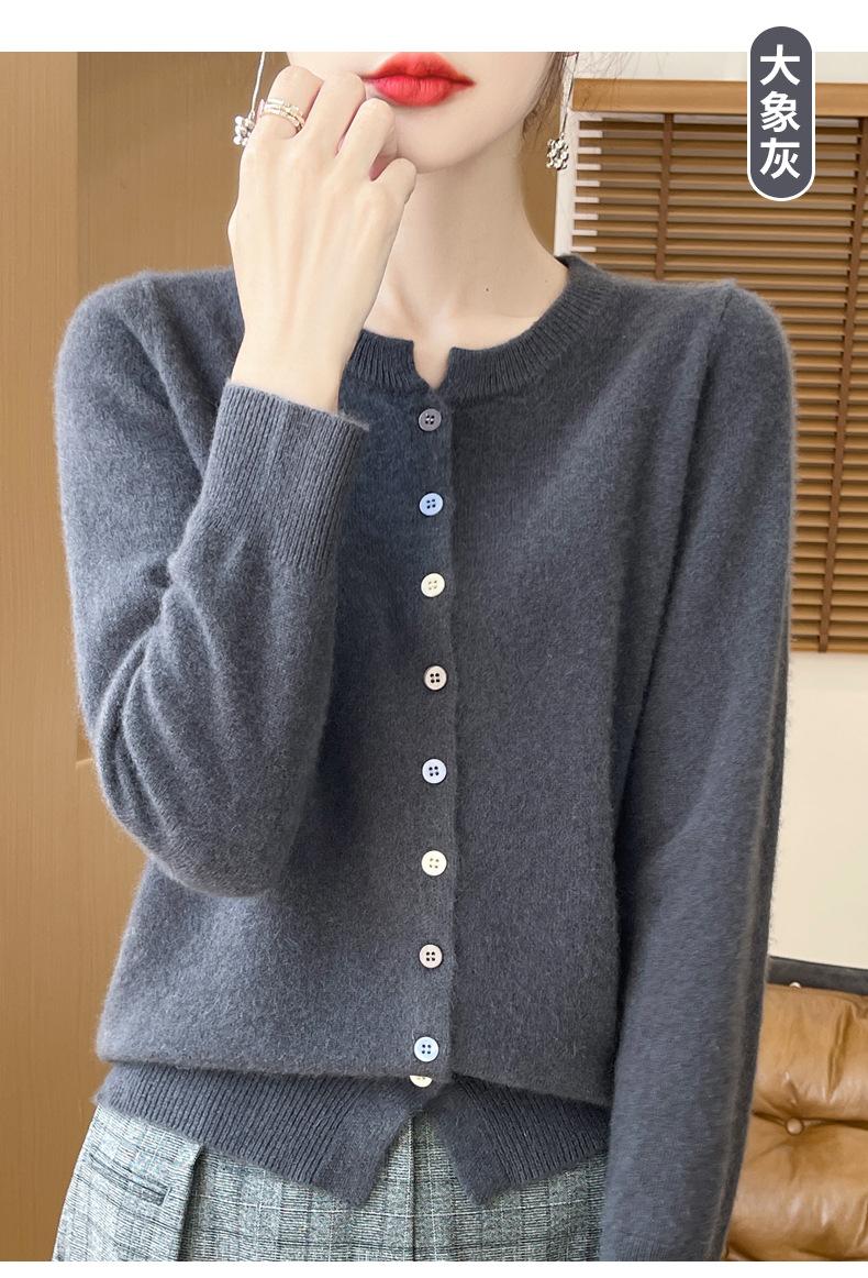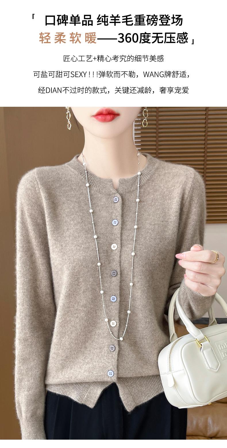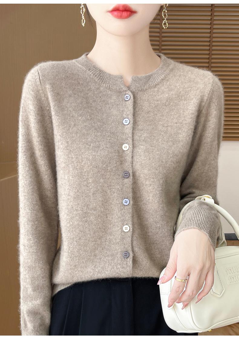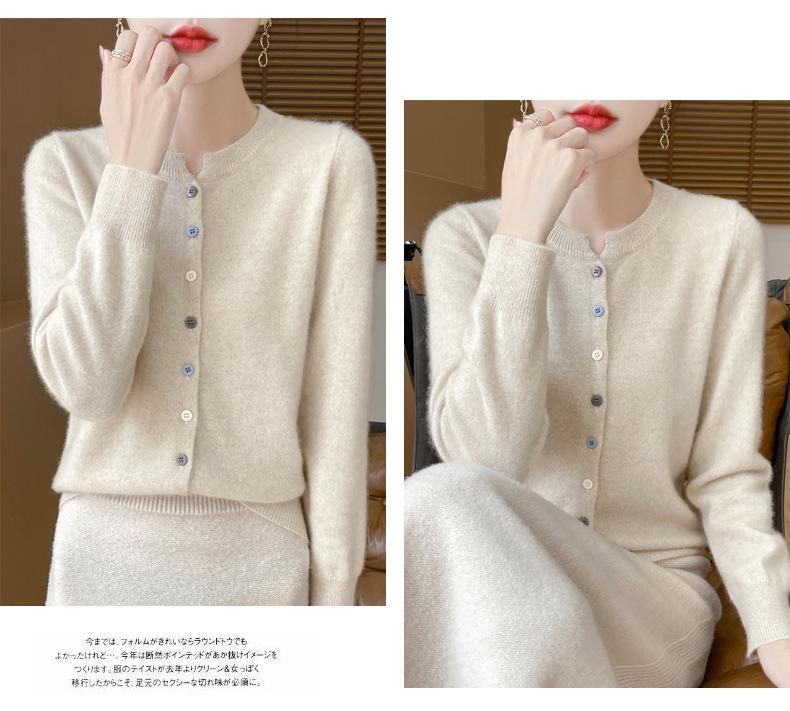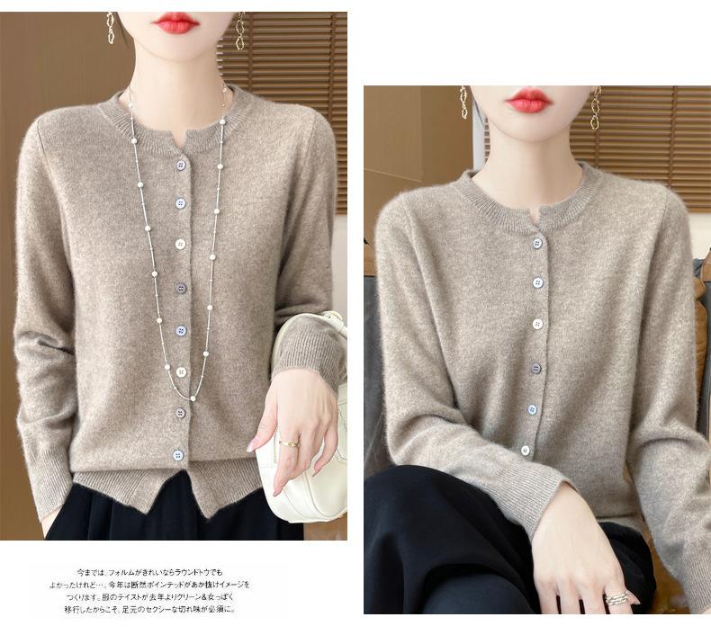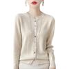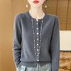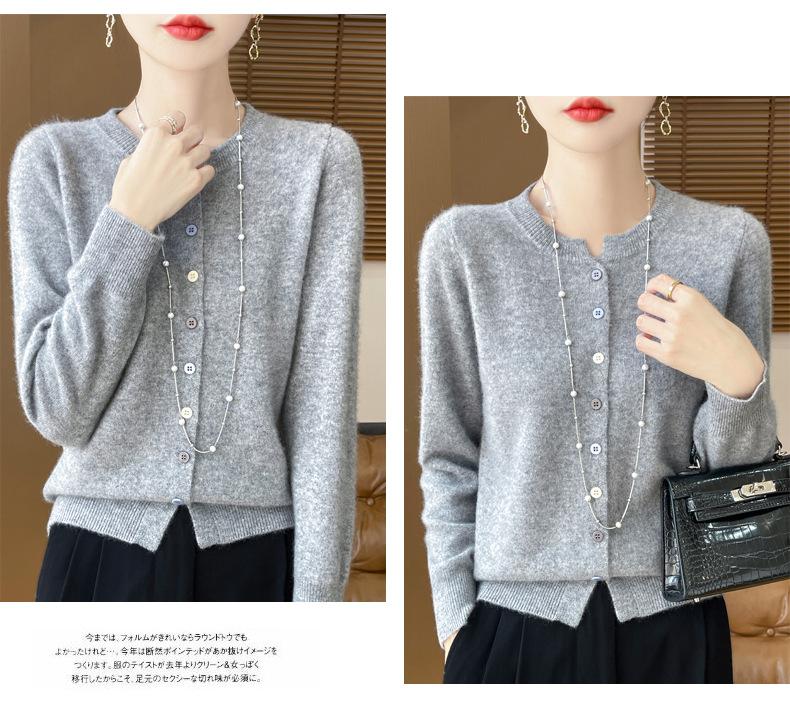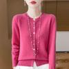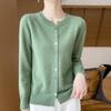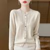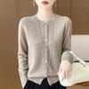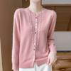 Cárdigan de punto de lana pura sencillo de otoño e invierno para mujer, novedad de 2024, camisa básica de manga larga con cuello redondo y abrigo con hebilla para uso diario.