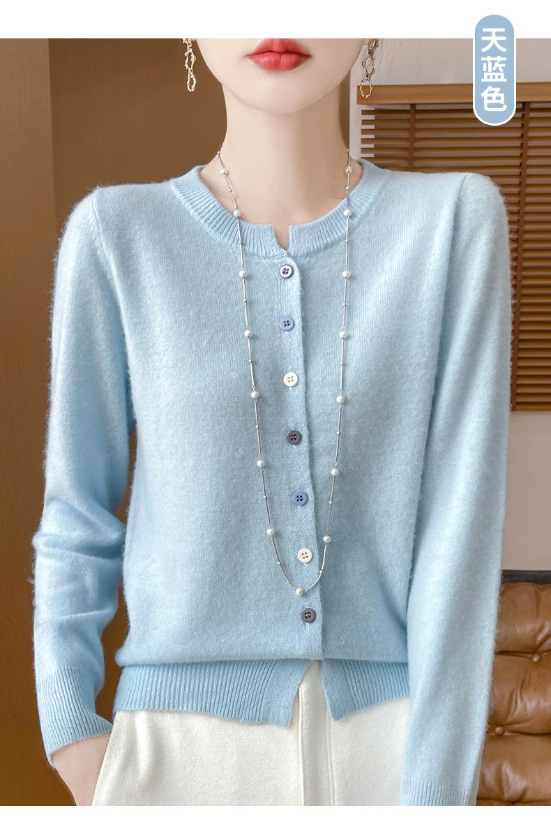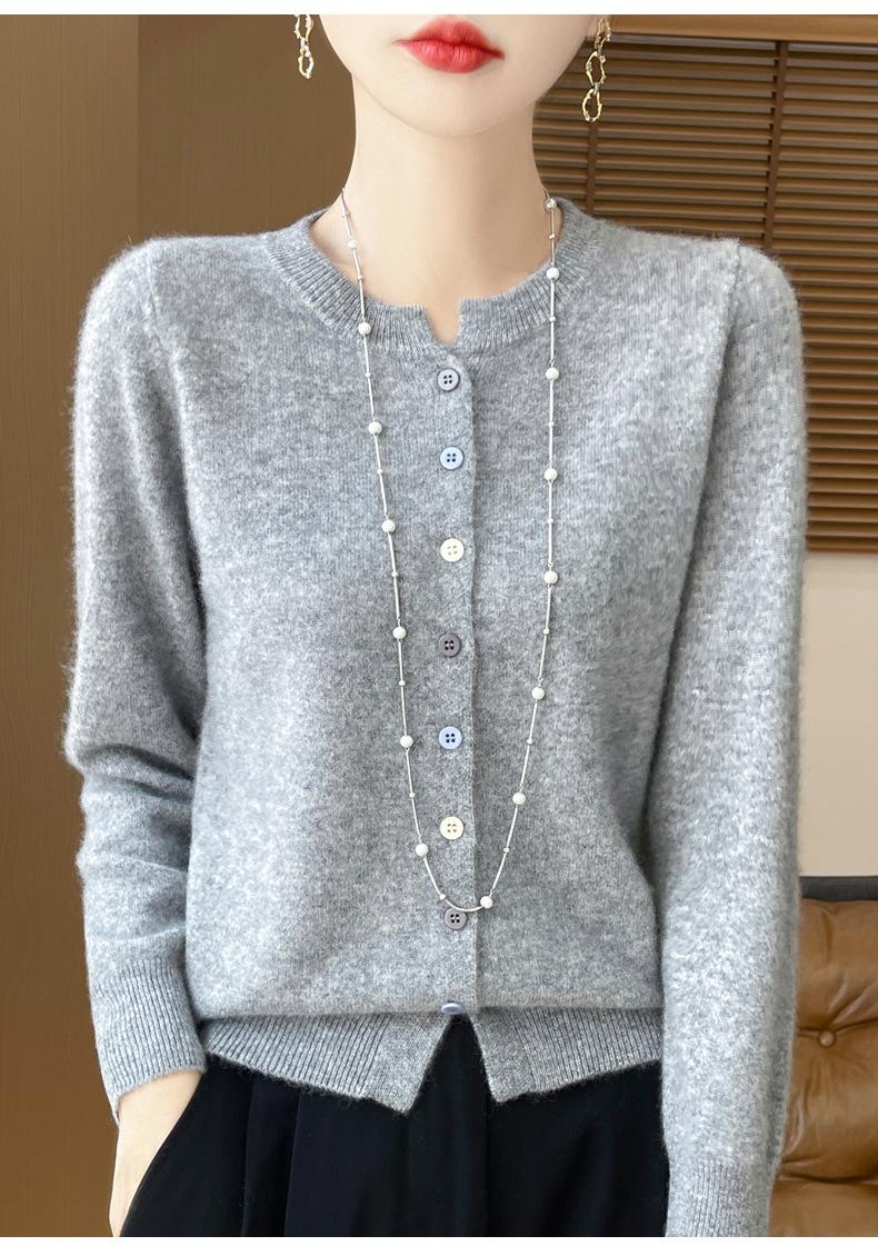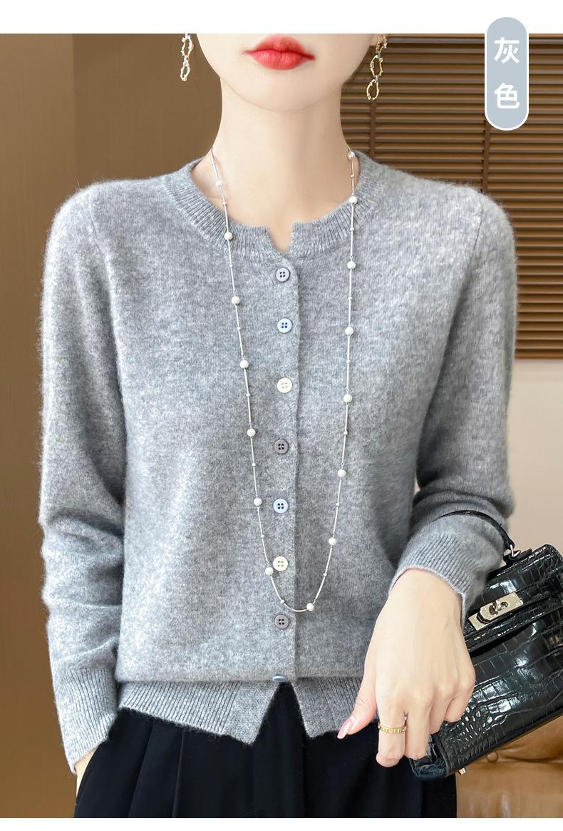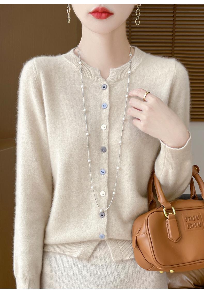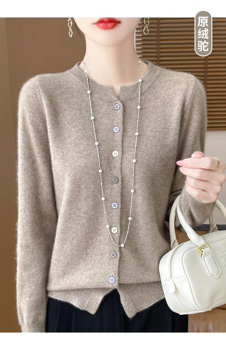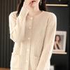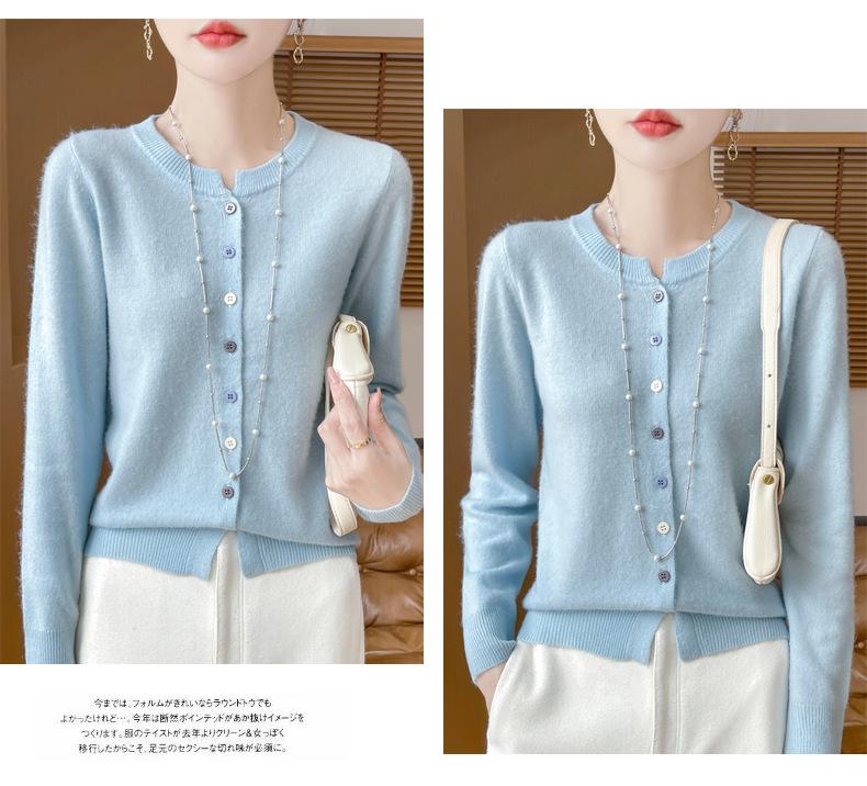 Cárdigan de punto de lana pura sencillo de otoño e invierno para mujer, novedad de 2024, camisa básica de manga larga con cuello redondo y abrigo con hebilla para uso diario.