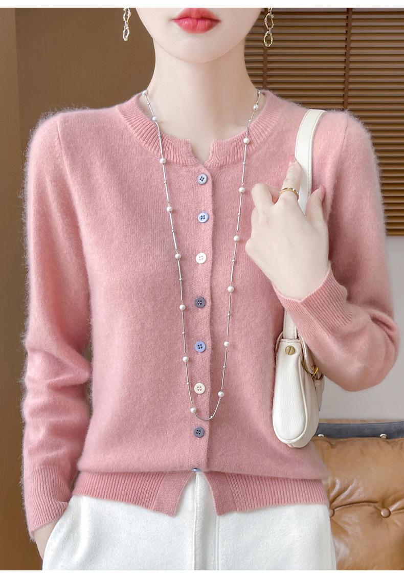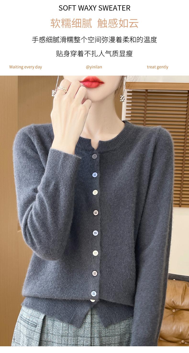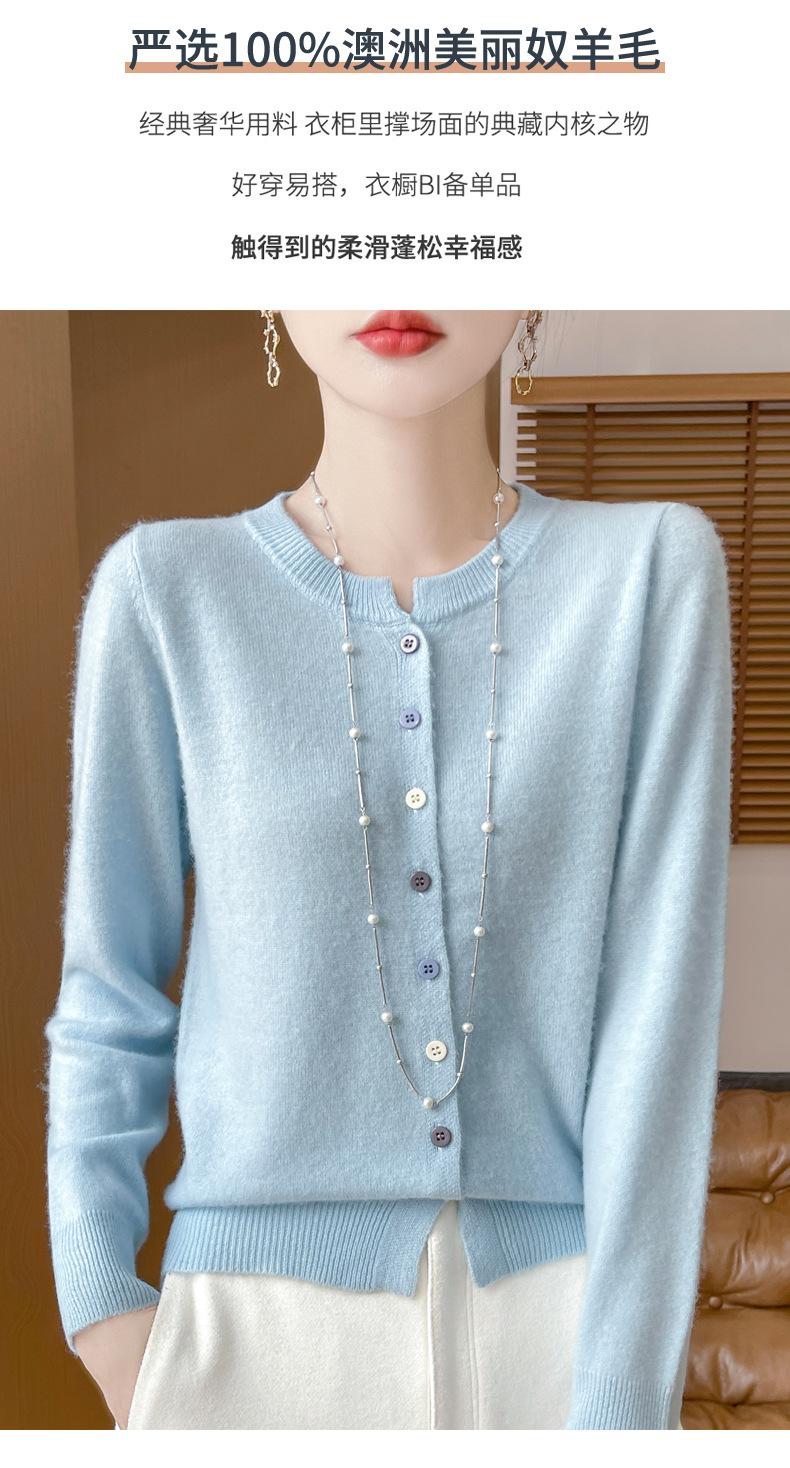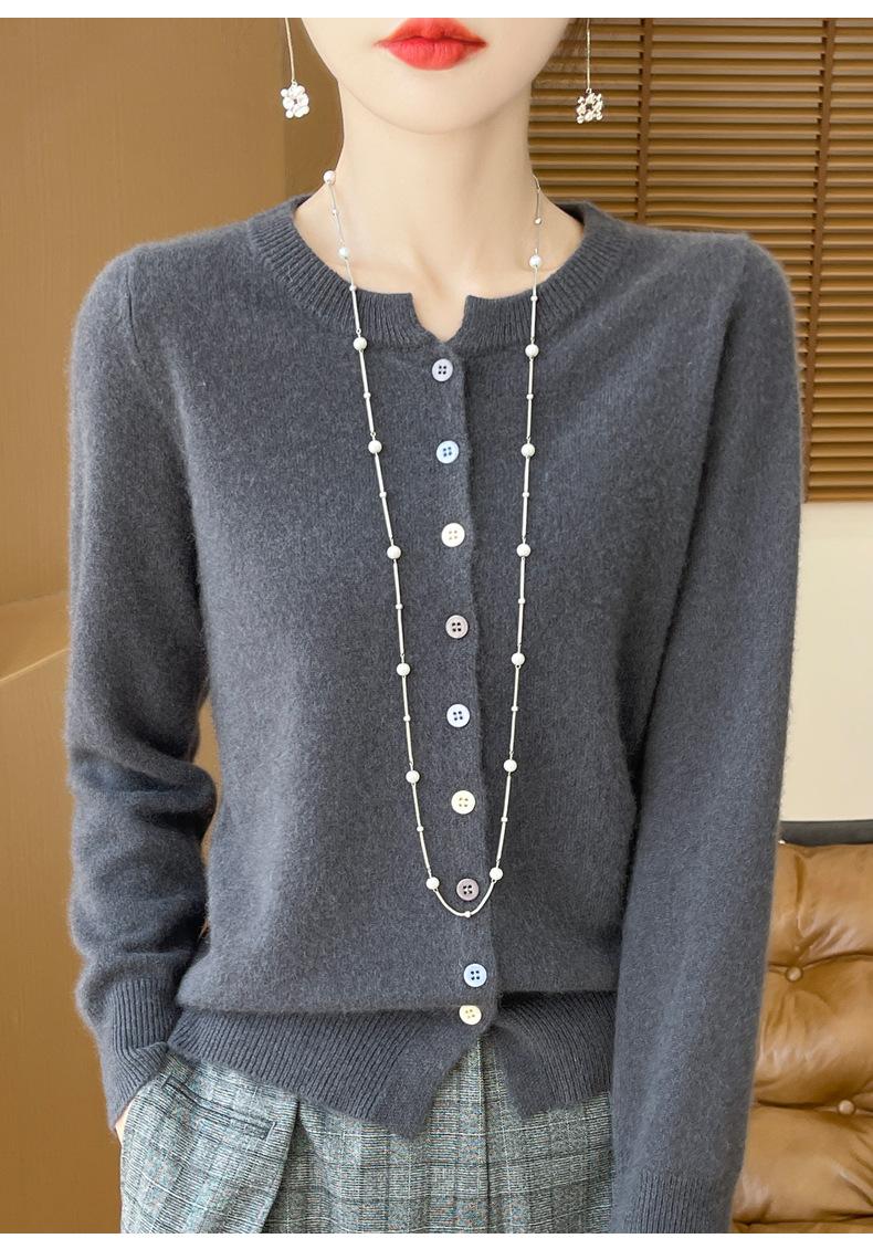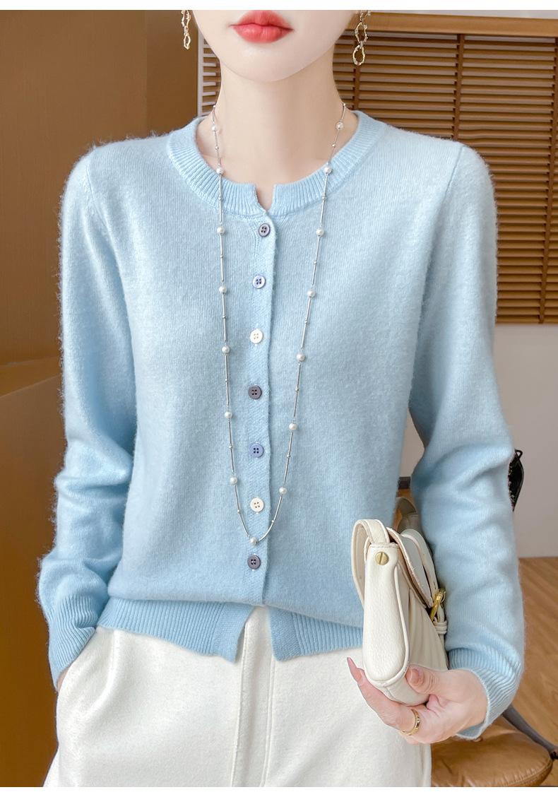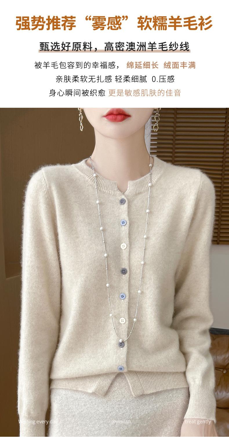 Cárdigan de punto de lana pura sencillo de otoño e invierno para mujer, novedad de 2024, camisa básica de manga larga con cuello redondo y abrigo con hebilla para uso diario.