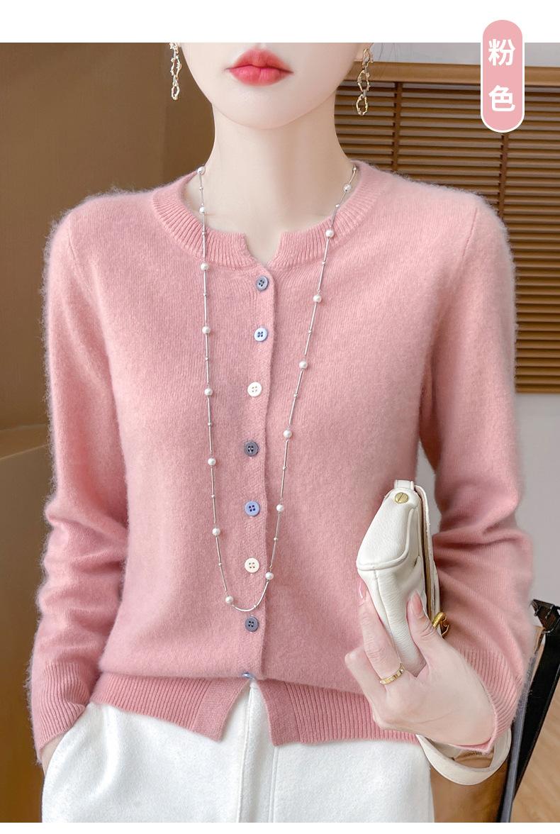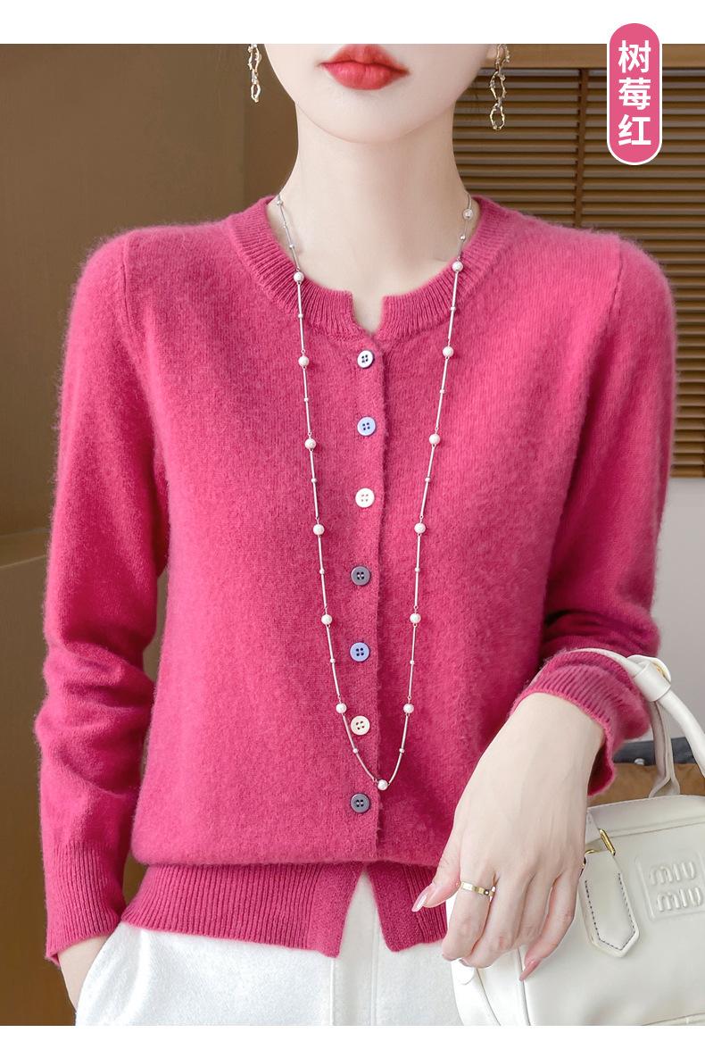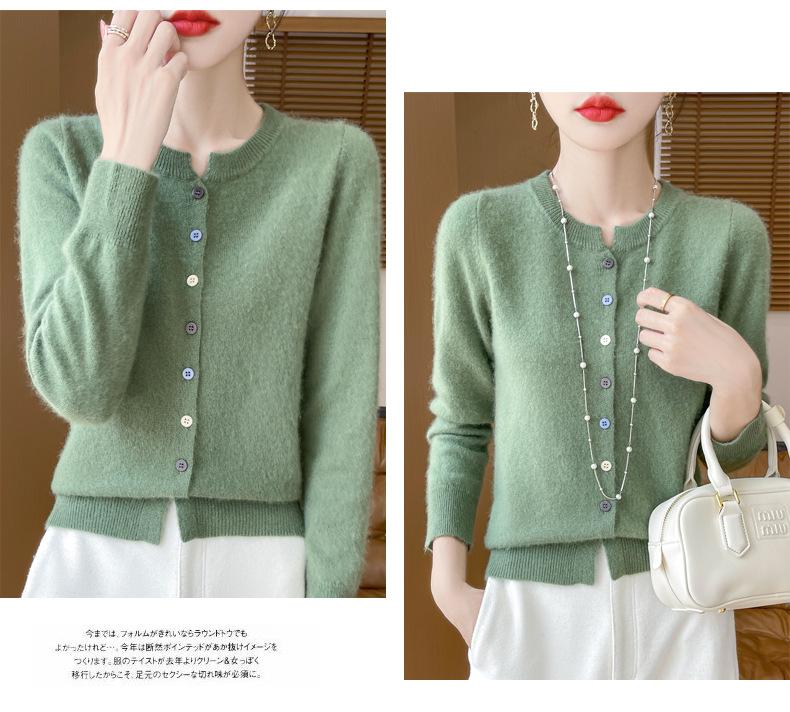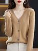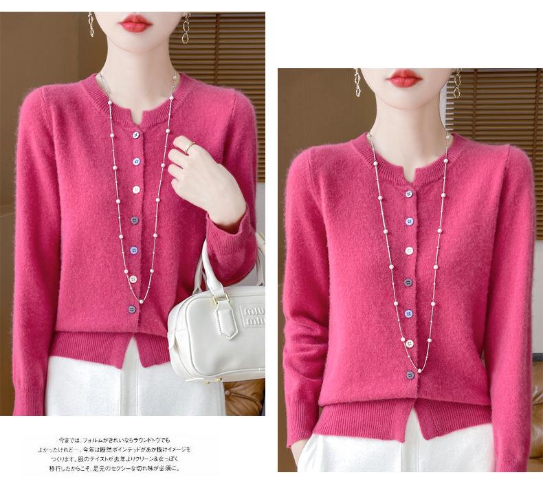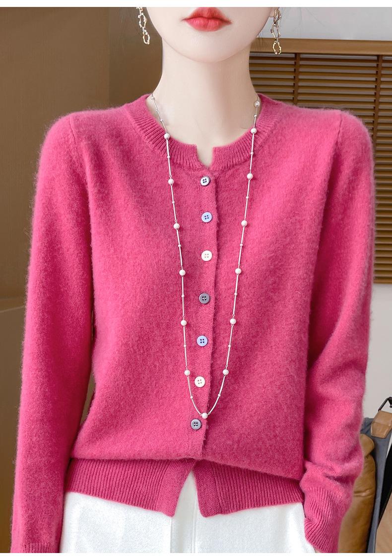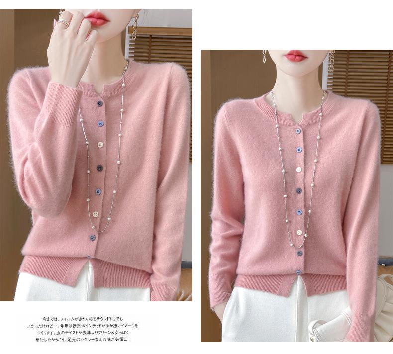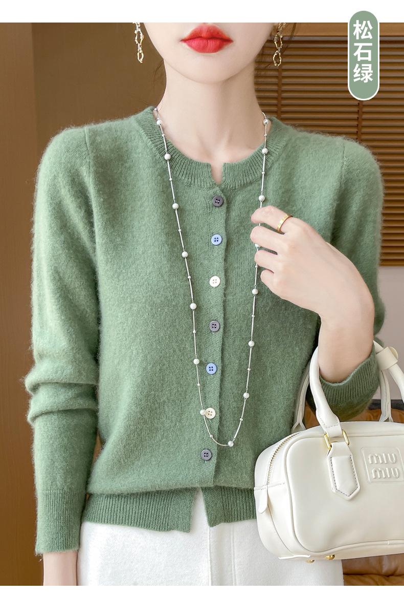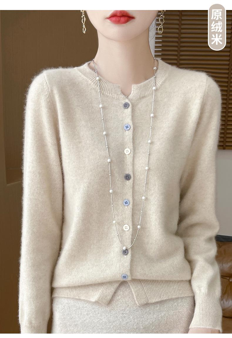 Cárdigan de punto de lana pura sencillo de otoño e invierno para mujer, novedad de 2024, camisa básica de manga larga con cuello redondo y abrigo con hebilla para uso diario.