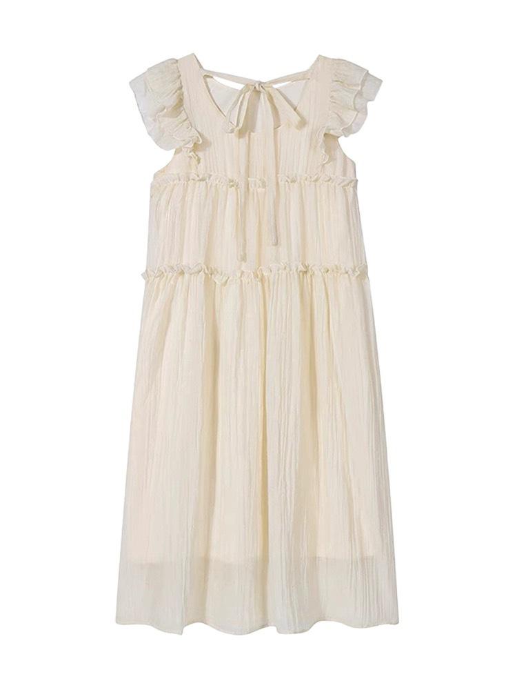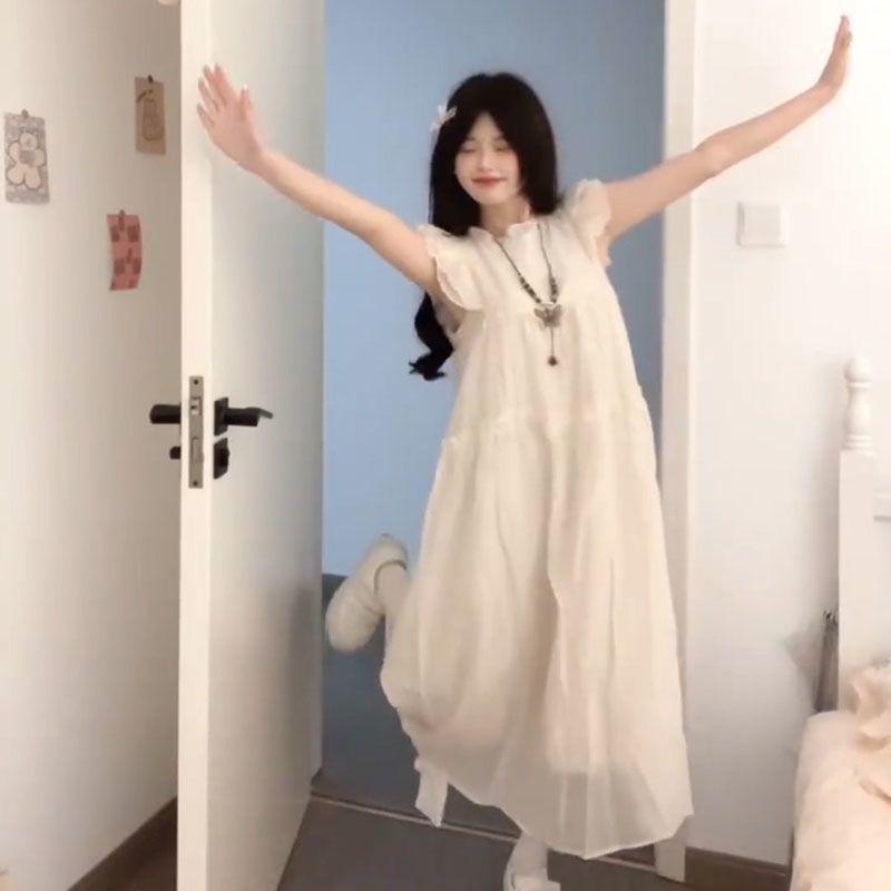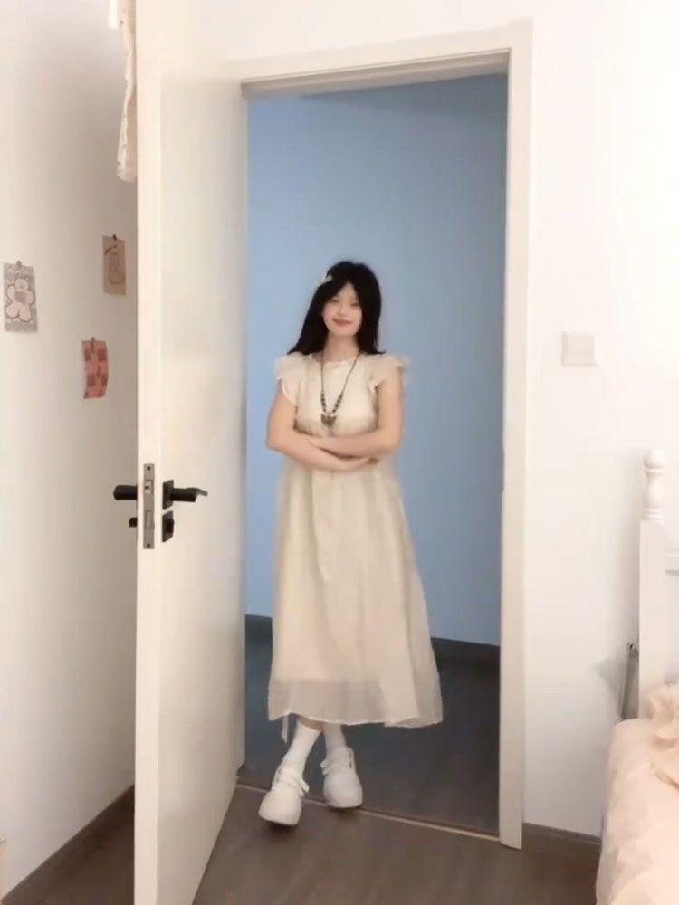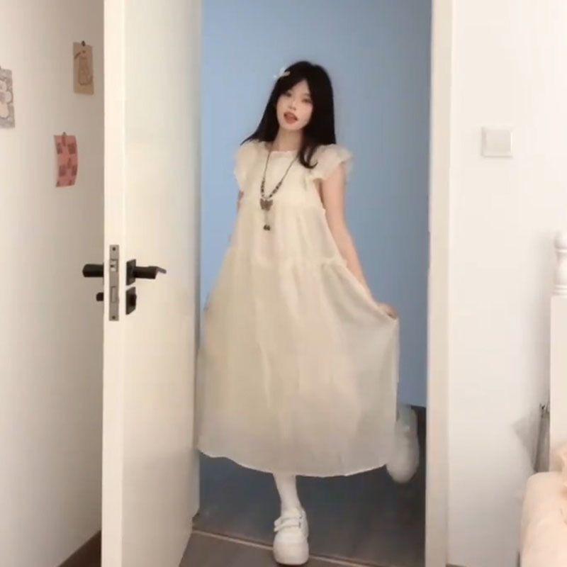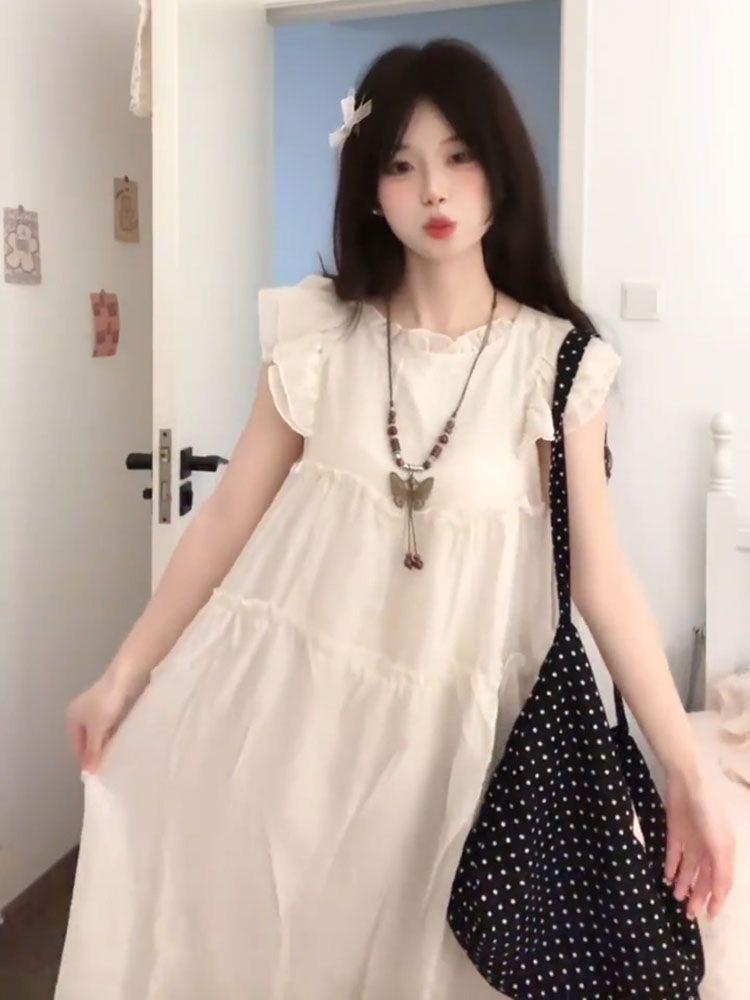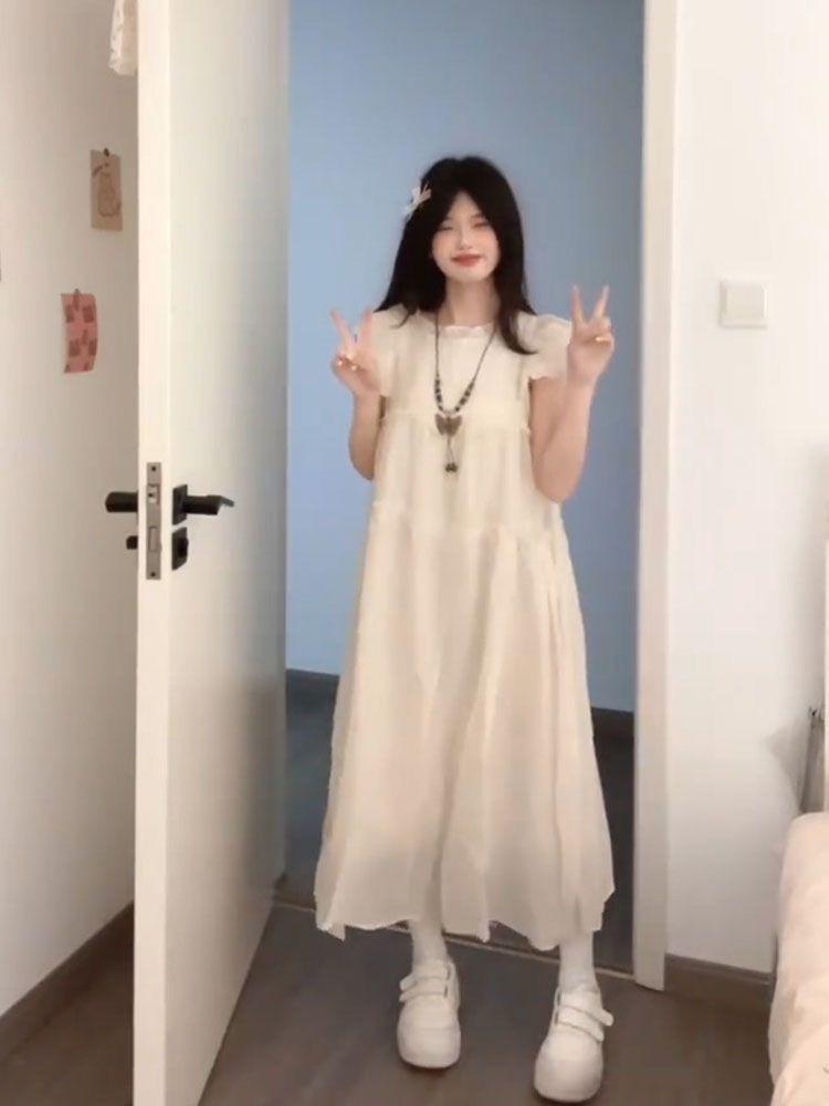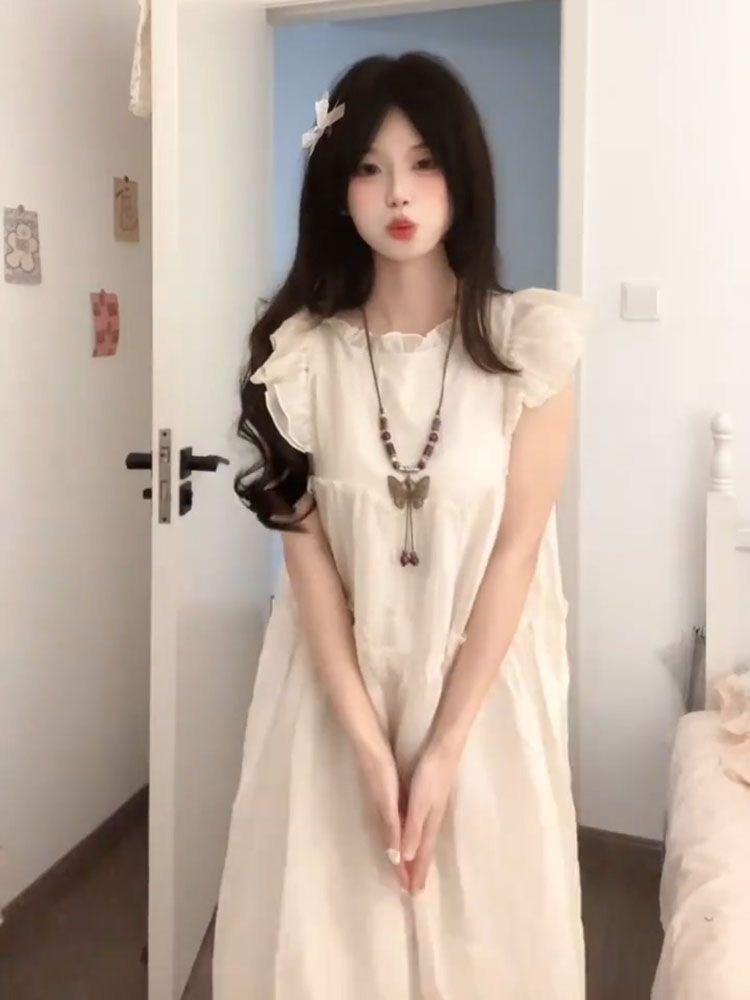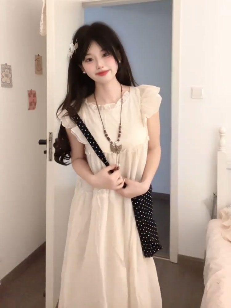 Estilo Dulce y Gentil, Mangas Cortas Voladas, Vestido Moderno que Reduce la Edad para Estudiantes, Falda Línea A Holgada Cubre-Carne de Verano