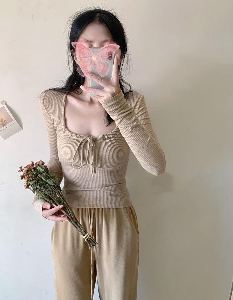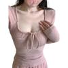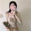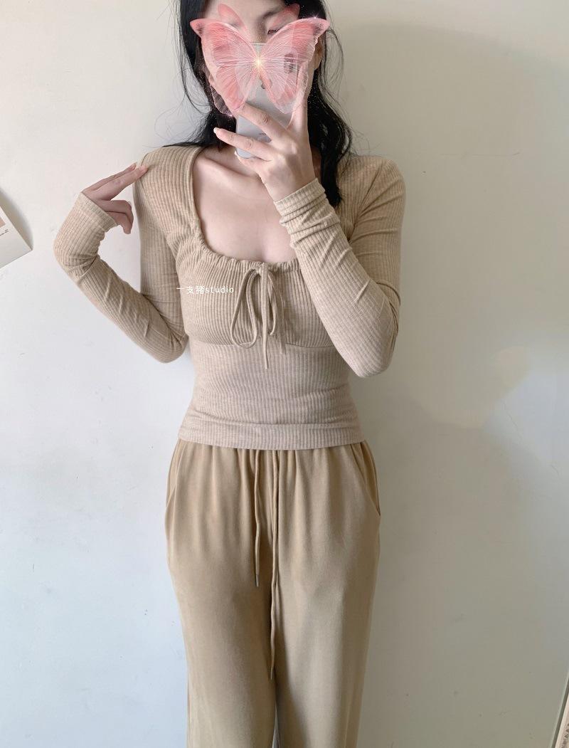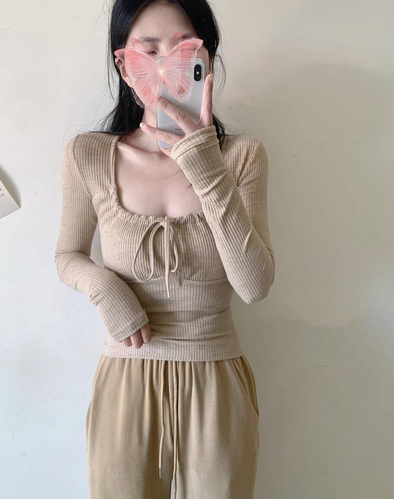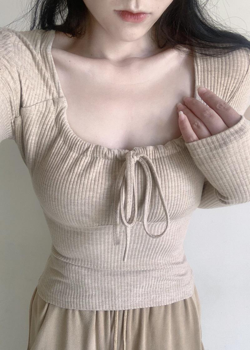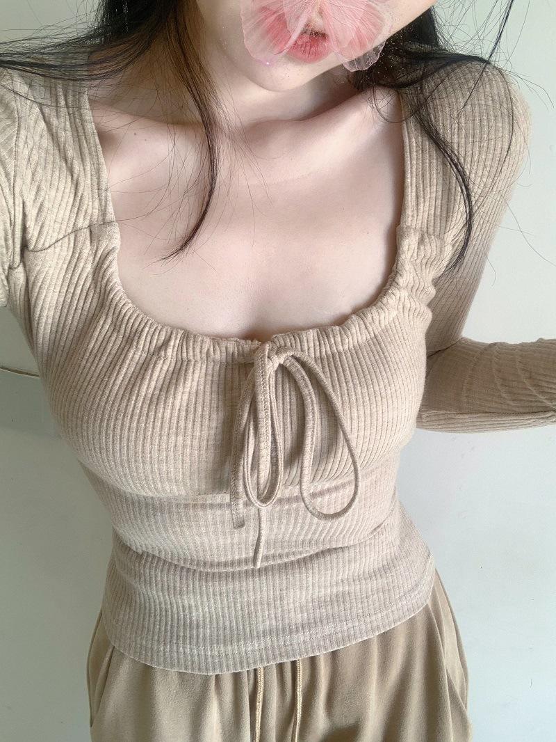 Camiseta de manga larga con cordones, cuello cuadrado, corte entallado, color miel melocotón, escote pronunciado, estilo delicado, con escote pronunciado, ideal para lucir en el pecho.