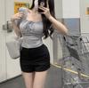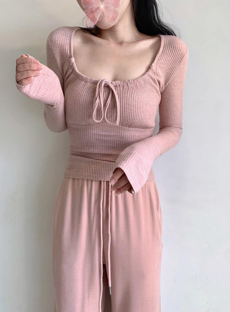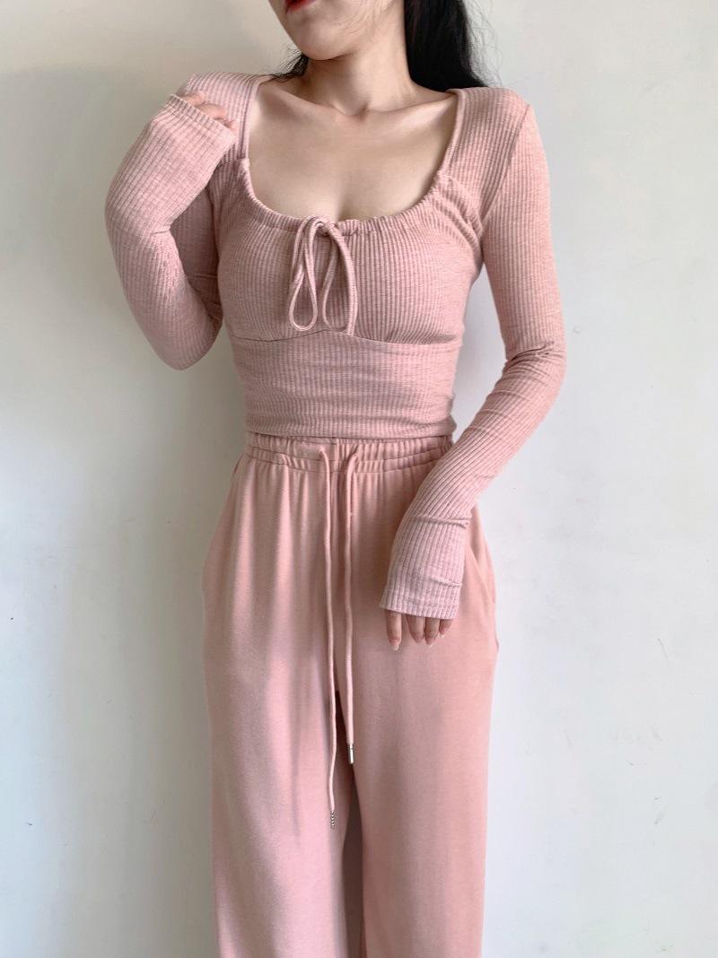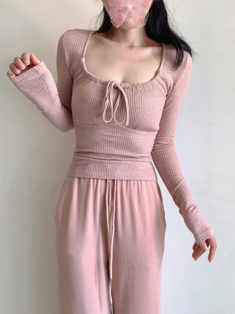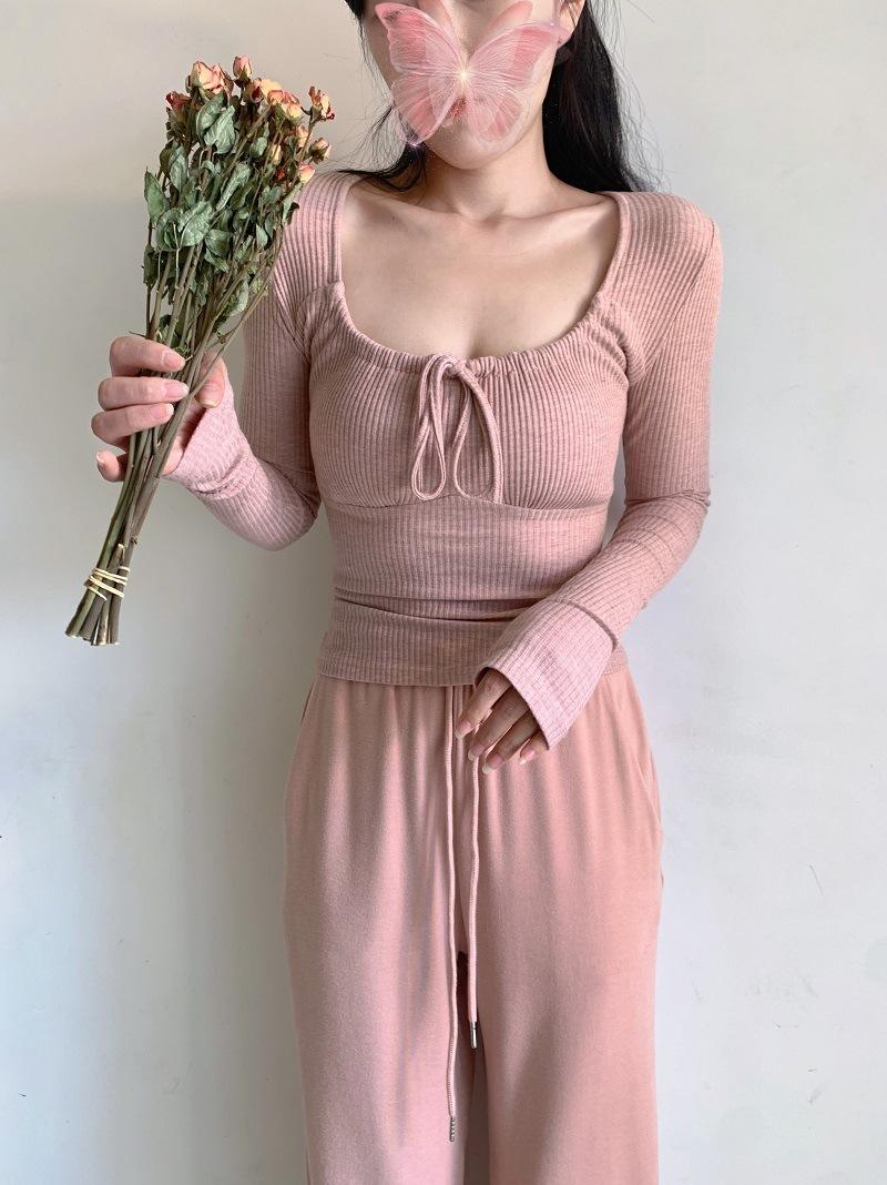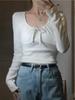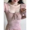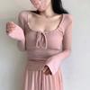 Camiseta de manga larga con cordones, cuello cuadrado, corte entallado, color miel melocotón, escote pronunciado, estilo delicado, con escote pronunciado, ideal para lucir en el pecho.