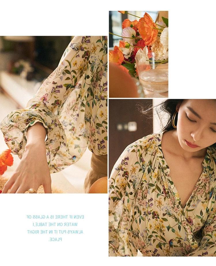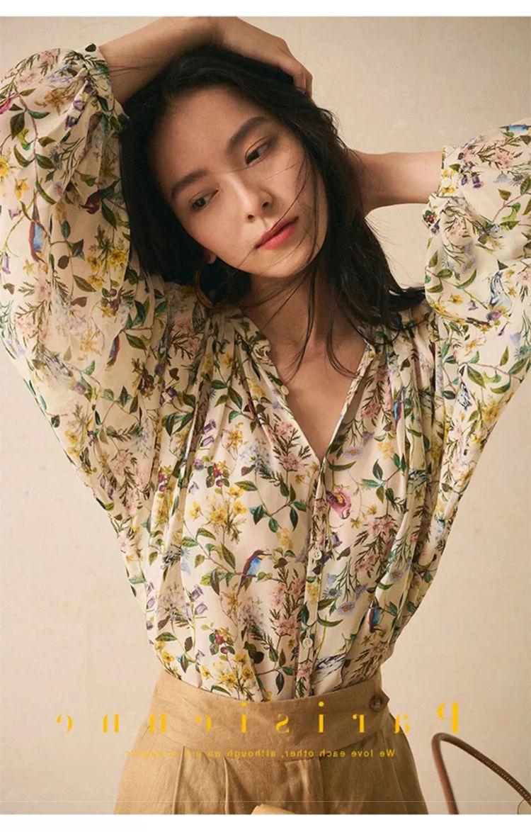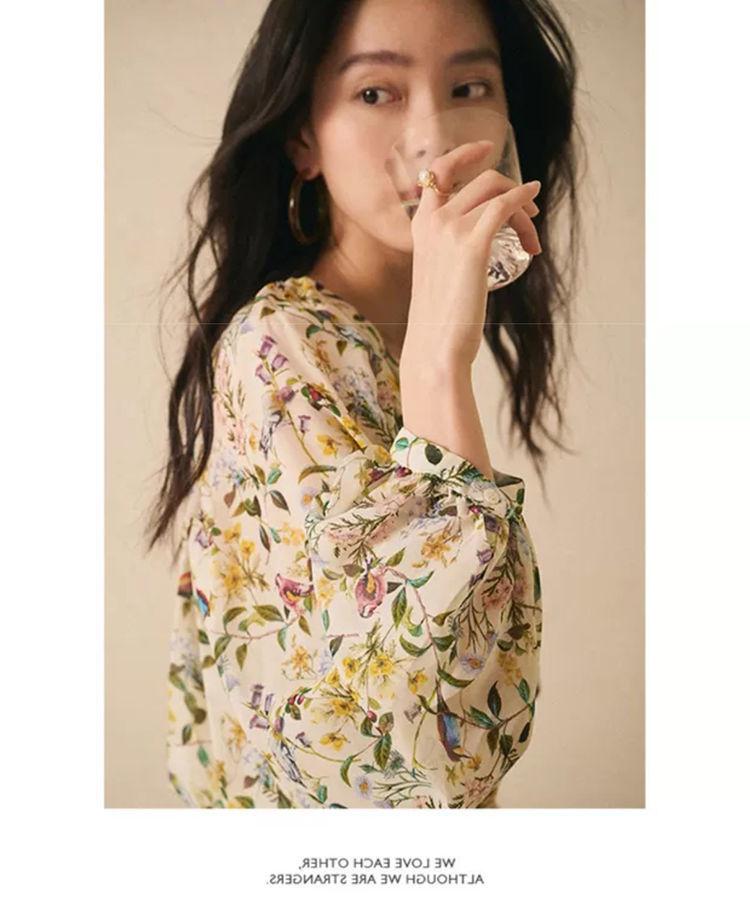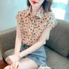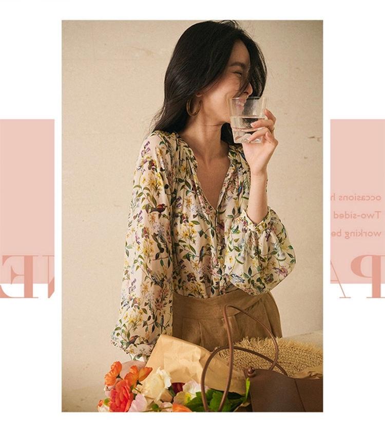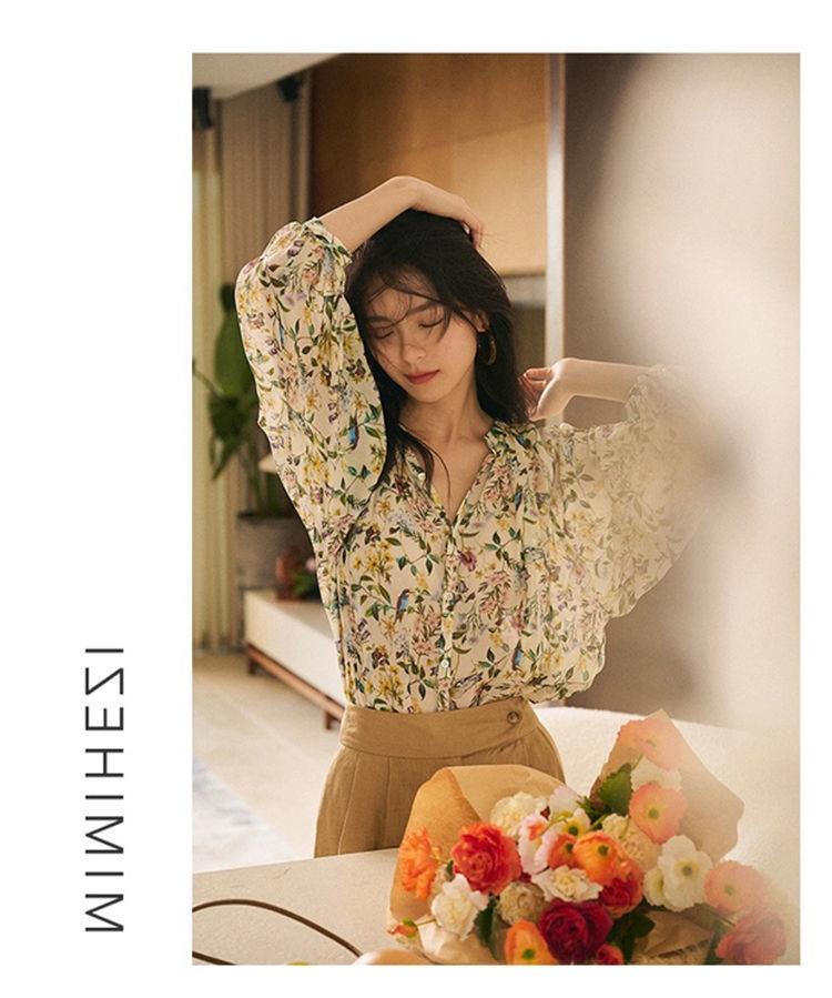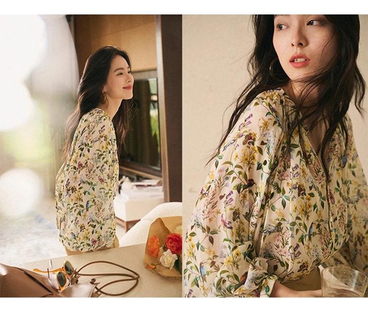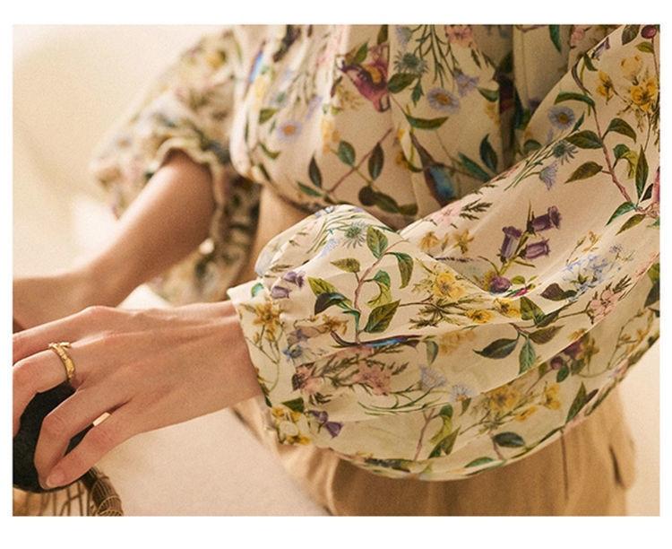 Camisa elegante de gasa con estampado floral para mujer, blusa francesa fina de manga de tres puntos con diseño de hadas de verano para principios de otoño
