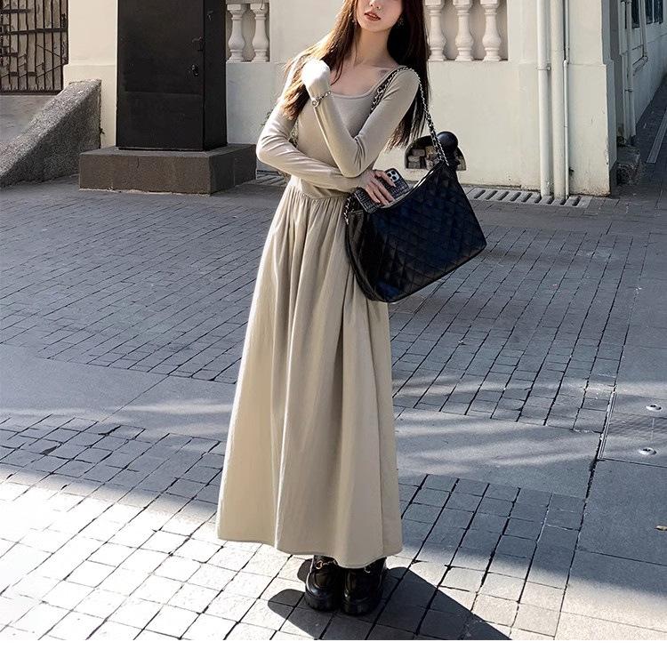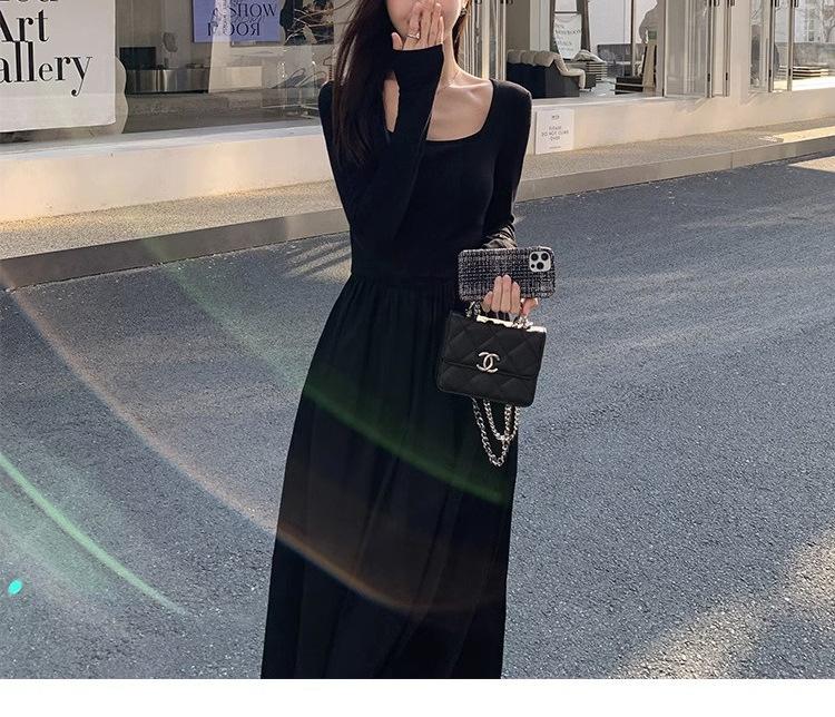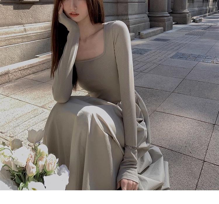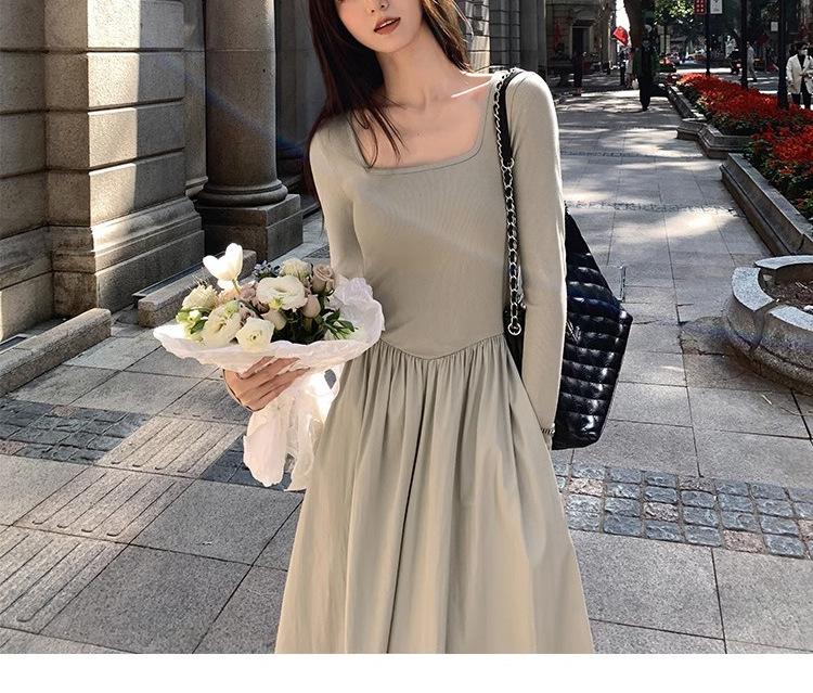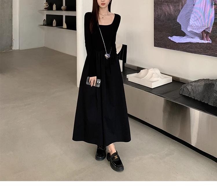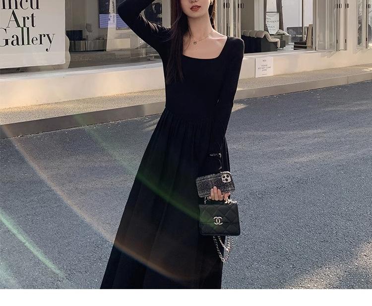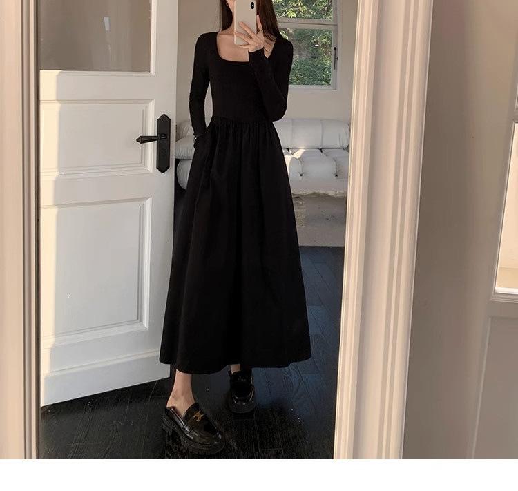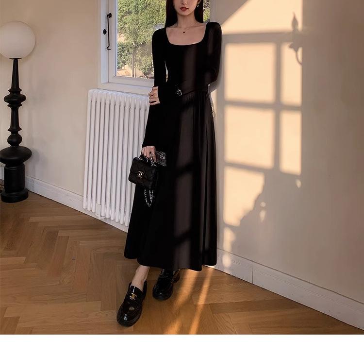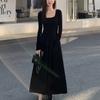 Vestido de cuello cuadrado estilo francés para mujer, primavera y otoño, nuevo, elegante, cintura ajustada, adelgazante, manga larga, negro, línea A, falda larga Ins